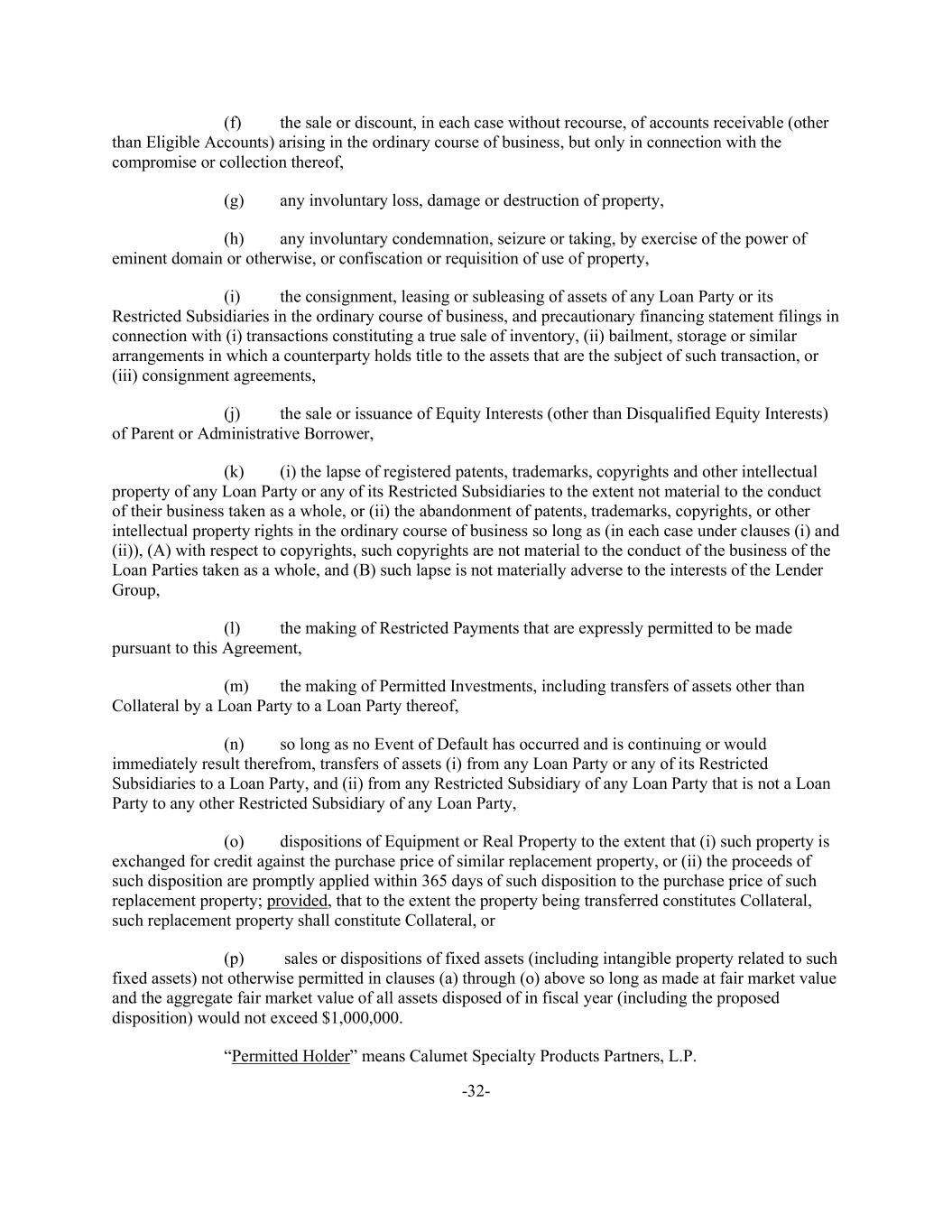 -32- (f) the sale or discount, in each case without recourse, of accounts receivable (other than Eligible Accounts) arising in the ordinary course of business, but only in connection with the compromise or collection thereof, (g) any involuntary loss, damage or destruction of property, (h) any involuntary condemnation, seizure or taking, by exercise of the power of eminent domain or otherwise, or confiscation or requisition of use of property, (i) the consignment, leasing or subleasing of assets of any Loan Party or its Restricted Subsidiaries in the ordinary course of business, and precautionary financing statement filings in connection with (i) transactions constituting a true sale of inventory, (ii) bailment, storage or similar arrangements in which a counterparty holds title to the assets that are the subject of such transaction, or (iii) consignment agreements, (j) the sale or issuance of Equity Interests (other than Disqualified Equity Interests) of Parent or Administrative Borrower, (k) (i) the lapse of registered patents, trademarks, copyrights and other intellectual property of any Loan Party or any of its Restricted Subsidiaries to the extent not material to the conduct of their business taken as a whole, or (ii) the abandonment of patents, trademarks, copyrights, or other intellectual property rights in the ordinary course of business so long as (in each case under clauses (i) and (ii)), (A) with respect to copyrights, such copyrights are not material to the conduct of the business of the Loan Parties taken as a whole, and (B) such lapse is not materially adverse to the interests of the Lender Group, (l) the making of Restricted Payments that are expressly permitted to be made pursuant to this Agreement, (m) the making of Permitted Investments, including transfers of assets other than Collateral by a Loan Party to a Loan Party thereof, (n) so long as no Event of Default has occurred and is continuing or would immediately result therefrom, transfers of assets (i) from any Loan Party or any of its Restricted Subsidiaries to a Loan Party, and (ii) from any Restricted Subsidiary of any Loan Party that is not a Loan Party to any other Restricted Subsidiary of any Loan Party, (o) dispositions of Equipment or Real Property to the extent that (i) such property is exchanged for credit against the purchase price of similar replacement property, or (ii) the proceeds of such disposition are promptly applied within 365 days of such disposition to the purchase price of such replacement property; provided, that to the extent the property being transferred constitutes Collateral, such replacement property shall constitute Collateral, or (p) sales or dispositions of fixed assets (including intangible property related to such fixed assets) not otherwise permitted in clauses (a) through (o) above so long as made at fair market value and the aggregate fair market value of all assets disposed of in fiscal year (including the proposed disposition) would not exceed $1,000,000. “Permitted Holder” means Calumet Specialty Products Partners, L.P.