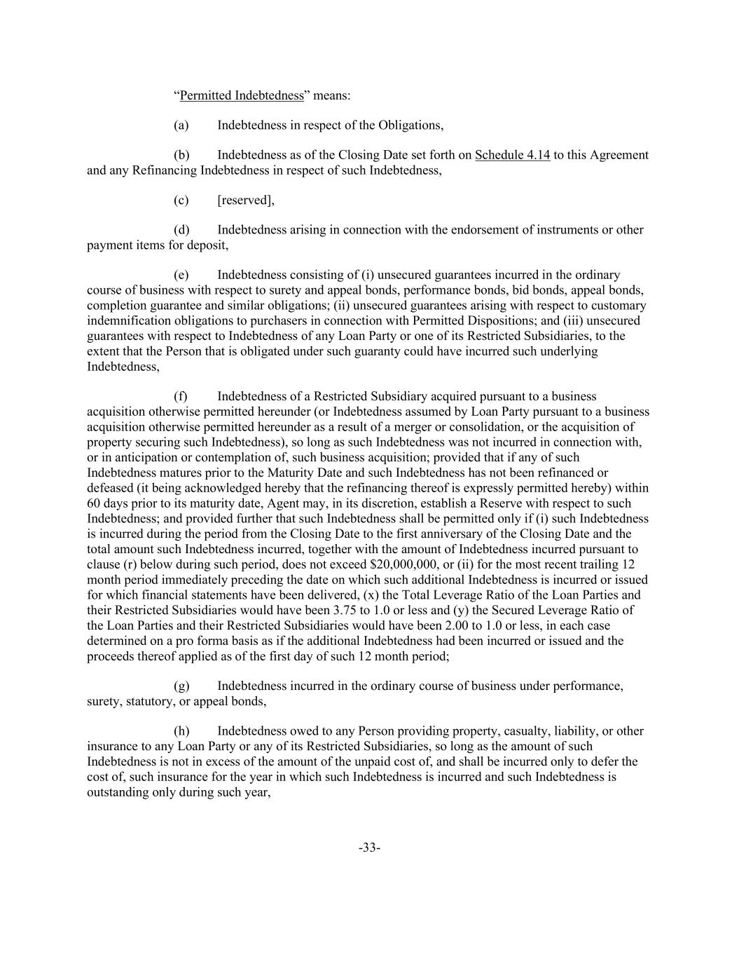-33- “Permitted Indebtedness” means: (a) Indebtedness in respect of the Obligations, (b) Indebtedness as of the Closing Date set forth on Schedule 4.14 to this Agreement and any Refinancing Indebtedness in respect of such Indebtedness, (c) [reserved], (d) Indebtedness arising in connection with the endorsement of instruments or other payment items for deposit, (e) Indebtedness consisting of (i) unsecured guarantees incurred in the ordinary course of business with respect to surety and appeal bonds, performance bonds, bid bonds, appeal bonds, completion guarantee and similar obligations; (ii) unsecured guarantees arising with respect to customary indemnification obligations to purchasers in connection with Permitted Dispositions; and (iii) unsecured guarantees with respect to Indebtedness of any Loan Party or one of its Restricted Subsidiaries, to the extent that the Person that is obligated under such guaranty could have incurred such underlying Indebtedness, (f) Indebtedness of a Restricted Subsidiary acquired pursuant to a business acquisition otherwise permitted hereunder (or Indebtedness assumed by Loan Party pursuant to a business acquisition otherwise permitted hereunder as a result of a merger or consolidation, or the acquisition of property securing such Indebtedness), so long as such Indebtedness was not incurred in connection with, or in anticipation or contemplation of, such business acquisition; provided that if any of such Indebtedness matures prior to the Maturity Date and such Indebtedness has not been refinanced or defeased (it being acknowledged hereby that the refinancing thereof is expressly permitted hereby) within 60 days prior to its maturity date, Agent may, in its discretion, establish a Reserve with respect to such Indebtedness; and provided further that such Indebtedness shall be permitted only if (i) such Indebtedness is incurred during the period from the Closing Date to the first anniversary of the Closing Date and the total amount such Indebtedness incurred, together with the amount of Indebtedness incurred pursuant to clause (r) below during such period, does not exceed $20,000,000, or (ii) for the most recent trailing 12 month period immediately preceding the date on which such additional Indebtedness is incurred or issued for which financial statements have been delivered, (x) the Total Leverage Ratio of the Loan Parties and their Restricted Subsidiaries would have been 3.75 to 1.0 or less and (y) the Secured Leverage Ratio of the Loan Parties and their Restricted Subsidiaries would have been 2.00 to 1.0 or less, in each case determined on a pro forma basis as if the additional Indebtedness had been incurred or issued and the proceeds thereof applied as of the first day of such 12 month period; (g) Indebtedness incurred in the ordinary course of business under performance, surety, statutory, or appeal bonds, (h) Indebtedness owed to any Person providing property, casualty, liability, or other insurance to any Loan Party or any of its Restricted Subsidiaries, so long as the amount of such Indebtedness is not in excess of the amount of the unpaid cost of, and shall be incurred only to defer the cost of, such insurance for the year in which such Indebtedness is incurred and such Indebtedness is outstanding only during such year,