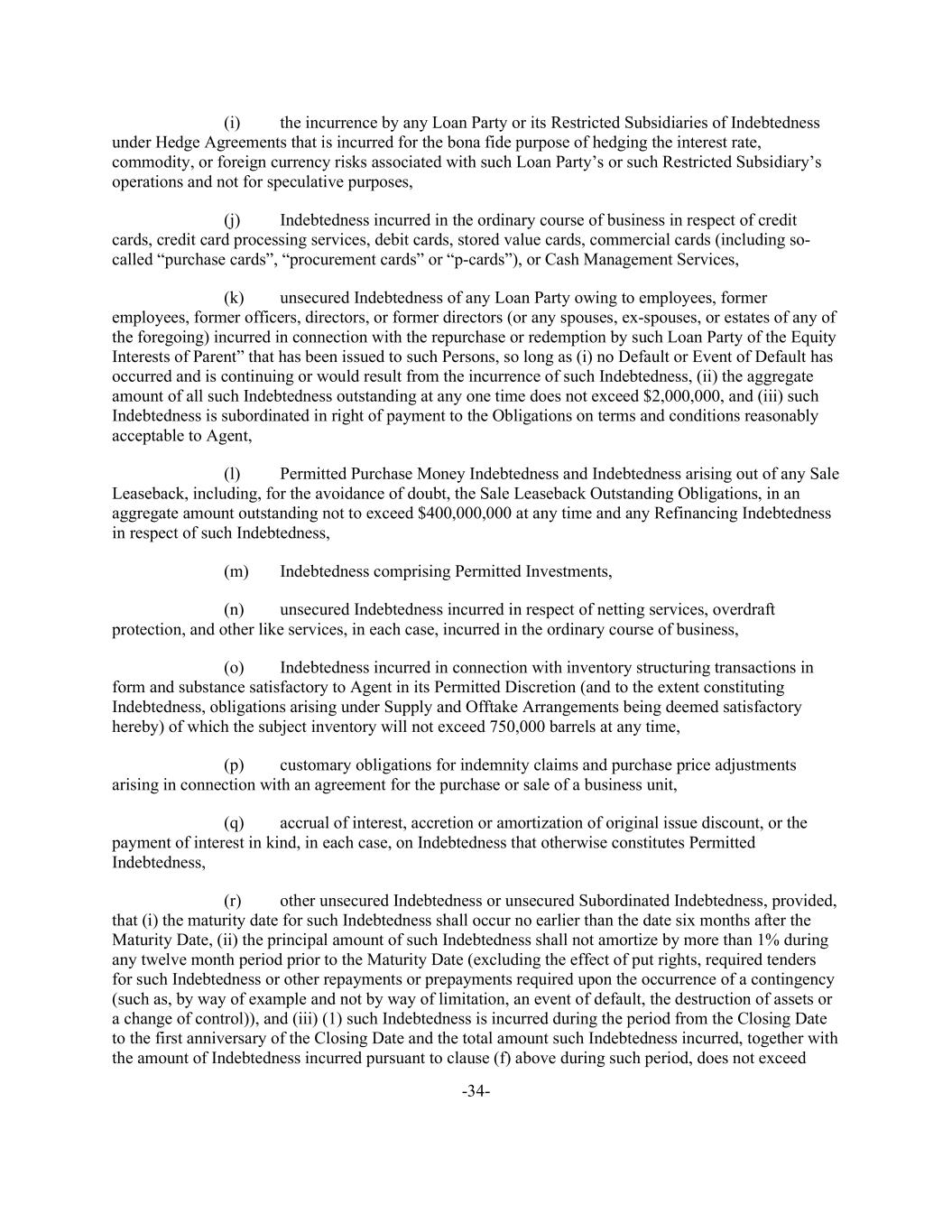-34- (i) the incurrence by any Loan Party or its Restricted Subsidiaries of Indebtedness under Hedge Agreements that is incurred for the bona fide purpose of hedging the interest rate, commodity, or foreign currency risks associated with such Loan Party’s or such Restricted Subsidiary’s operations and not for speculative purposes, (j) Indebtedness incurred in the ordinary course of business in respect of credit cards, credit card processing services, debit cards, stored value cards, commercial cards (including so- called “purchase cards”, “procurement cards” or “p-cards”), or Cash Management Services, (k) unsecured Indebtedness of any Loan Party owing to employees, former employees, former officers, directors, or former directors (or any spouses, ex-spouses, or estates of any of the foregoing) incurred in connection with the repurchase or redemption by such Loan Party of the Equity Interests of Parent” that has been issued to such Persons, so long as (i) no Default or Event of Default has occurred and is continuing or would result from the incurrence of such Indebtedness, (ii) the aggregate amount of all such Indebtedness outstanding at any one time does not exceed $2,000,000, and (iii) such Indebtedness is subordinated in right of payment to the Obligations on terms and conditions reasonably acceptable to Agent, (l) Permitted Purchase Money Indebtedness and Indebtedness arising out of any Sale Leaseback, including, for the avoidance of doubt, the Sale Leaseback Outstanding Obligations, in an aggregate amount outstanding not to exceed $400,000,000 at any time and any Refinancing Indebtedness in respect of such Indebtedness, (m) Indebtedness comprising Permitted Investments, (n) unsecured Indebtedness incurred in respect of netting services, overdraft protection, and other like services, in each case, incurred in the ordinary course of business, (o) Indebtedness incurred in connection with inventory structuring transactions in form and substance satisfactory to Agent in its Permitted Discretion (and to the extent constituting Indebtedness, obligations arising under Supply and Offtake Arrangements being deemed satisfactory hereby) of which the subject inventory will not exceed 750,000 barrels at any time, (p) customary obligations for indemnity claims and purchase price adjustments arising in connection with an agreement for the purchase or sale of a business unit, (q) accrual of interest, accretion or amortization of original issue discount, or the payment of interest in kind, in each case, on Indebtedness that otherwise constitutes Permitted Indebtedness, (r) other unsecured Indebtedness or unsecured Subordinated Indebtedness, provided, that (i) the maturity date for such Indebtedness shall occur no earlier than the date six months after the Maturity Date, (ii) the principal amount of such Indebtedness shall not amortize by more than 1% during any twelve month period prior to the Maturity Date (excluding the effect of put rights, required tenders for such Indebtedness or other repayments or prepayments required upon the occurrence of a contingency (such as, by way of example and not by way of limitation, an event of default, the destruction of assets or a change of control)), and (iii) (1) such Indebtedness is incurred during the period from the Closing Date to the first anniversary of the Closing Date and the total amount such Indebtedness incurred, together with the amount of Indebtedness incurred pursuant to clause (f) above during such period, does not exceed