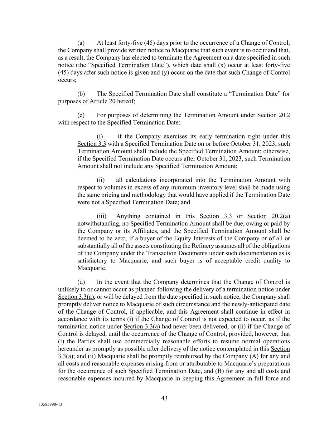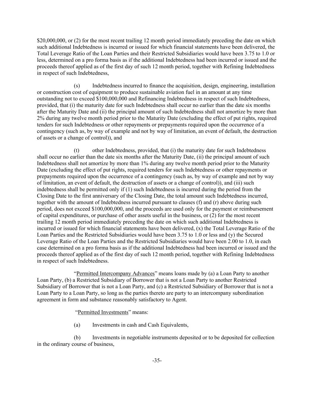 -35- $20,000,000, or (2) for the most recent trailing 12 month period immediately preceding the date on which such additional Indebtedness is incurred or issued for which financial statements have been delivered, the Total Leverage Ratio of the Loan Parties and their Restricted Subsidiaries would have been 3.75 to 1.0 or less, determined on a pro forma basis as if the additional Indebtedness had been incurred or issued and the proceeds thereof applied as of the first day of such 12 month period, together with Refining Indebtedness in respect of such Indebtedness, (s) Indebtedness incurred to finance the acquisition, design, engineering, installation or construction cost of equipment to produce sustainable aviation fuel in an amount at any time outstanding not to exceed $100,000,000 and Refinancing Indebtedness in respect of such Indebtedness, provided, that (i) the maturity date for such Indebtedness shall occur no earlier than the date six months after the Maturity Date and (ii) the principal amount of such Indebtedness shall not amortize by more than 2% during any twelve month period prior to the Maturity Date (excluding the effect of put rights, required tenders for such Indebtedness or other repayments or prepayments required upon the occurrence of a contingency (such as, by way of example and not by way of limitation, an event of default, the destruction of assets or a change of control)), and (t) other Indebtedness, provided, that (i) the maturity date for such Indebtedness shall occur no earlier than the date six months after the Maturity Date, (ii) the principal amount of such Indebtedness shall not amortize by more than 1% during any twelve month period prior to the Maturity Date (excluding the effect of put rights, required tenders for such Indebtedness or other repayments or prepayments required upon the occurrence of a contingency (such as, by way of example and not by way of limitation, an event of default, the destruction of assets or a change of control)), and (iii) such indebtedness shall be permitted only if (1) such Indebtedness is incurred during the period from the Closing Date to the first anniversary of the Closing Date, the total amount such Indebtedness incurred, together with the amount of Indebtedness incurred pursuant to clauses (f) and (r) above during such period, does not exceed $100,000,000, and the proceeds are used only for the payment or reimbursement of capital expenditures, or purchase of other assets useful in the business, or (2) for the most recent trailing 12 month period immediately preceding the date on which such additional Indebtedness is incurred or issued for which financial statements have been delivered, (x) the Total Leverage Ratio of the Loan Parties and the Restricted Subsidiaries would have been 3.75 to 1.0 or less and (y) the Secured Leverage Ratio of the Loan Parties and the Restricted Subsidiaries would have been 2.00 to 1.0, in each case determined on a pro forma basis as if the additional Indebtedness had been incurred or issued and the proceeds thereof applied as of the first day of such 12 month period, together with Refining Indebtedness in respect of such Indebtedness. “Permitted Intercompany Advances” means loans made by (a) a Loan Party to another Loan Party, (b) a Restricted Subsidiary of Borrower that is not a Loan Party to another Restricted Subsidiary of Borrower that is not a Loan Party, and (c) a Restricted Subsidiary of Borrower that is not a Loan Party to a Loan Party, so long as the parties thereto are party to an intercompany subordination agreement in form and substance reasonably satisfactory to Agent. “Permitted Investments” means: (a) Investments in cash and Cash Equivalents, (b) Investments in negotiable instruments deposited or to be deposited for collection in the ordinary course of business,