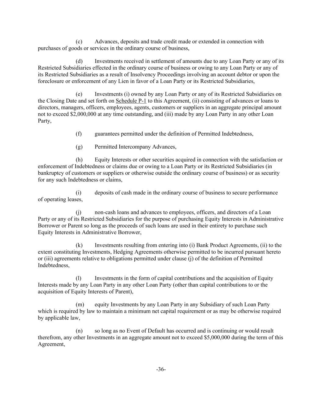 -36- (c) Advances, deposits and trade credit made or extended in connection with purchases of goods or services in the ordinary course of business, (d) Investments received in settlement of amounts due to any Loan Party or any of its Restricted Subsidiaries effected in the ordinary course of business or owing to any Loan Party or any of its Restricted Subsidiaries as a result of Insolvency Proceedings involving an account debtor or upon the foreclosure or enforcement of any Lien in favor of a Loan Party or its Restricted Subsidiaries, (e) Investments (i) owned by any Loan Party or any of its Restricted Subsidiaries on the Closing Date and set forth on Schedule P-1 to this Agreement, (ii) consisting of advances or loans to directors, managers, officers, employees, agents, customers or suppliers in an aggregate principal amount not to exceed $2,000,000 at any time outstanding, and (iii) made by any Loan Party in any other Loan Party, (f) guarantees permitted under the definition of Permitted Indebtedness, (g) Permitted Intercompany Advances, (h) Equity Interests or other securities acquired in connection with the satisfaction or enforcement of Indebtedness or claims due or owing to a Loan Party or its Restricted Subsidiaries (in bankruptcy of customers or suppliers or otherwise outside the ordinary course of business) or as security for any such Indebtedness or claims, (i) deposits of cash made in the ordinary course of business to secure performance of operating leases, (j) non-cash loans and advances to employees, officers, and directors of a Loan Party or any of its Restricted Subsidiaries for the purpose of purchasing Equity Interests in Administrative Borrower or Parent so long as the proceeds of such loans are used in their entirety to purchase such Equity Interests in Administrative Borrower, (k) Investments resulting from entering into (i) Bank Product Agreements, (ii) to the extent constituting Investments, Hedging Agreements otherwise permitted to be incurred pursuant hereto or (iii) agreements relative to obligations permitted under clause (j) of the definition of Permitted Indebtedness, (l) Investments in the form of capital contributions and the acquisition of Equity Interests made by any Loan Party in any other Loan Party (other than capital contributions to or the acquisition of Equity Interests of Parent), (m) equity Investments by any Loan Party in any Subsidiary of such Loan Party which is required by law to maintain a minimum net capital requirement or as may be otherwise required by applicable law, (n) so long as no Event of Default has occurred and is continuing or would result therefrom, any other Investments in an aggregate amount not to exceed $5,000,000 during the term of this Agreement,