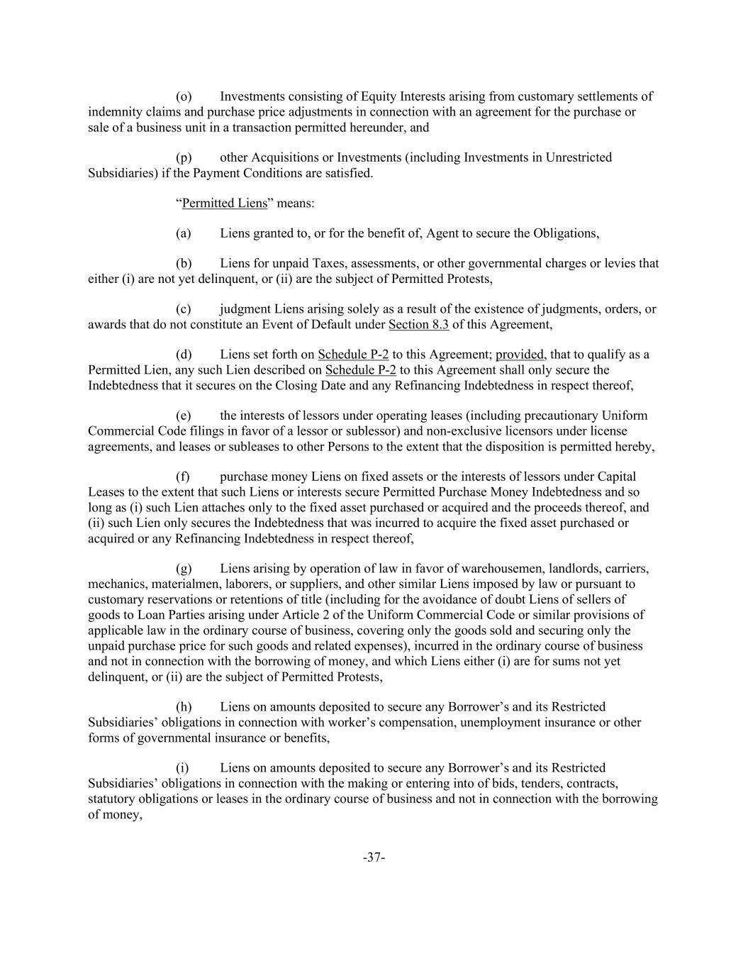 -37- (o) Investments consisting of Equity Interests arising from customary settlements of indemnity claims and purchase price adjustments in connection with an agreement for the purchase or sale of a business unit in a transaction permitted hereunder, and (p) other Acquisitions or Investments (including Investments in Unrestricted Subsidiaries) if the Payment Conditions are satisfied. “Permitted Liens” means: (a) Liens granted to, or for the benefit of, Agent to secure the Obligations, (b) Liens for unpaid Taxes, assessments, or other governmental charges or levies that either (i) are not yet delinquent, or (ii) are the subject of Permitted Protests, (c) judgment Liens arising solely as a result of the existence of judgments, orders, or awards that do not constitute an Event of Default under Section 8.3 of this Agreement, (d) Liens set forth on Schedule P-2 to this Agreement; provided, that to qualify as a Permitted Lien, any such Lien described on Schedule P-2 to this Agreement shall only secure the Indebtedness that it secures on the Closing Date and any Refinancing Indebtedness in respect thereof, (e) the interests of lessors under operating leases (including precautionary Uniform Commercial Code filings in favor of a lessor or sublessor) and non-exclusive licensors under license agreements, and leases or subleases to other Persons to the extent that the disposition is permitted hereby, (f) purchase money Liens on fixed assets or the interests of lessors under Capital Leases to the extent that such Liens or interests secure Permitted Purchase Money Indebtedness and so long as (i) such Lien attaches only to the fixed asset purchased or acquired and the proceeds thereof, and (ii) such Lien only secures the Indebtedness that was incurred to acquire the fixed asset purchased or acquired or any Refinancing Indebtedness in respect thereof, (g) Liens arising by operation of law in favor of warehousemen, landlords, carriers, mechanics, materialmen, laborers, or suppliers, and other similar Liens imposed by law or pursuant to customary reservations or retentions of title (including for the avoidance of doubt Liens of sellers of goods to Loan Parties arising under Article 2 of the Uniform Commercial Code or similar provisions of applicable law in the ordinary course of business, covering only the goods sold and securing only the unpaid purchase price for such goods and related expenses), incurred in the ordinary course of business and not in connection with the borrowing of money, and which Liens either (i) are for sums not yet delinquent, or (ii) are the subject of Permitted Protests, (h) Liens on amounts deposited to secure any Borrower’s and its Restricted Subsidiaries’ obligations in connection with worker’s compensation, unemployment insurance or other forms of governmental insurance or benefits, (i) Liens on amounts deposited to secure any Borrower’s and its Restricted Subsidiaries’ obligations in connection with the making or entering into of bids, tenders, contracts, statutory obligations or leases in the ordinary course of business and not in connection with the borrowing of money,