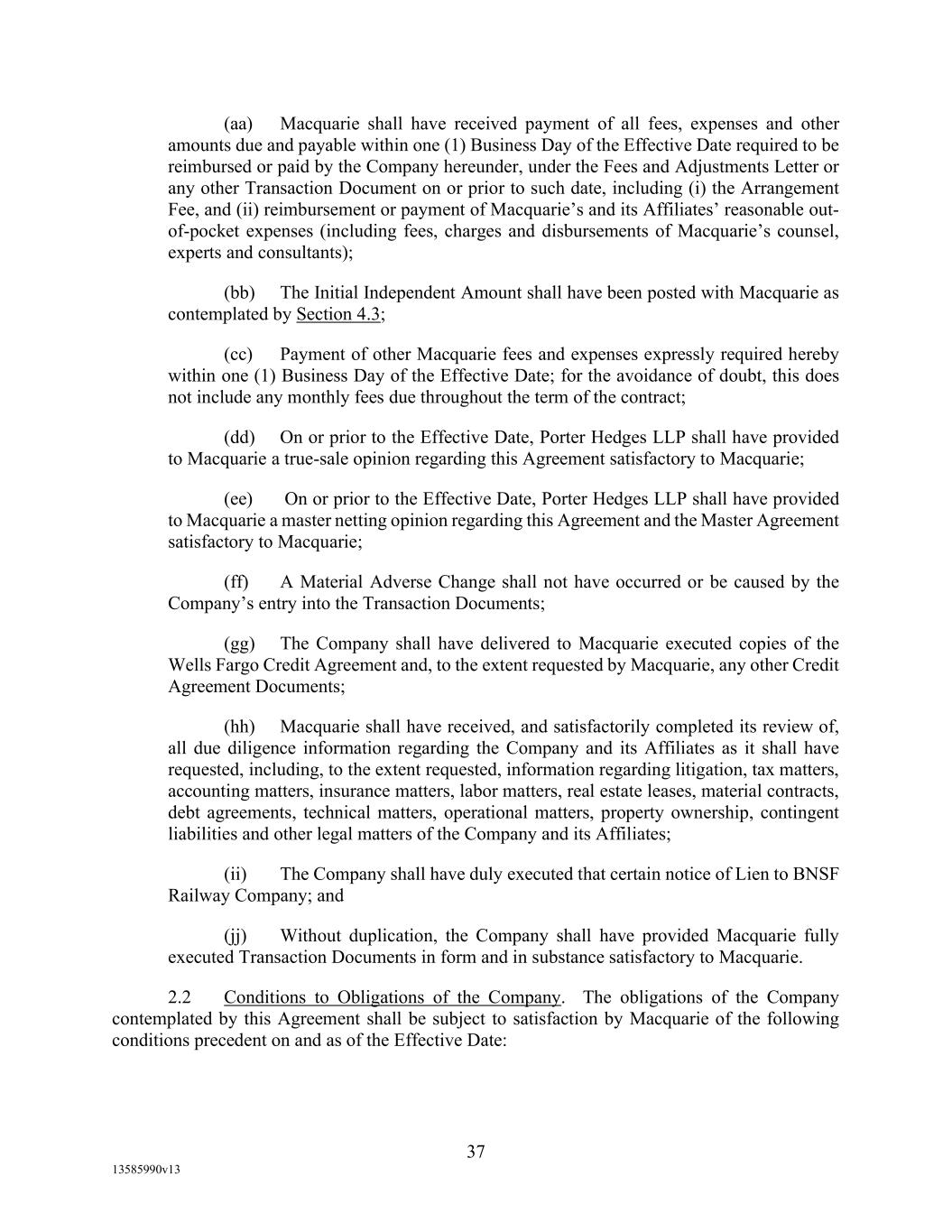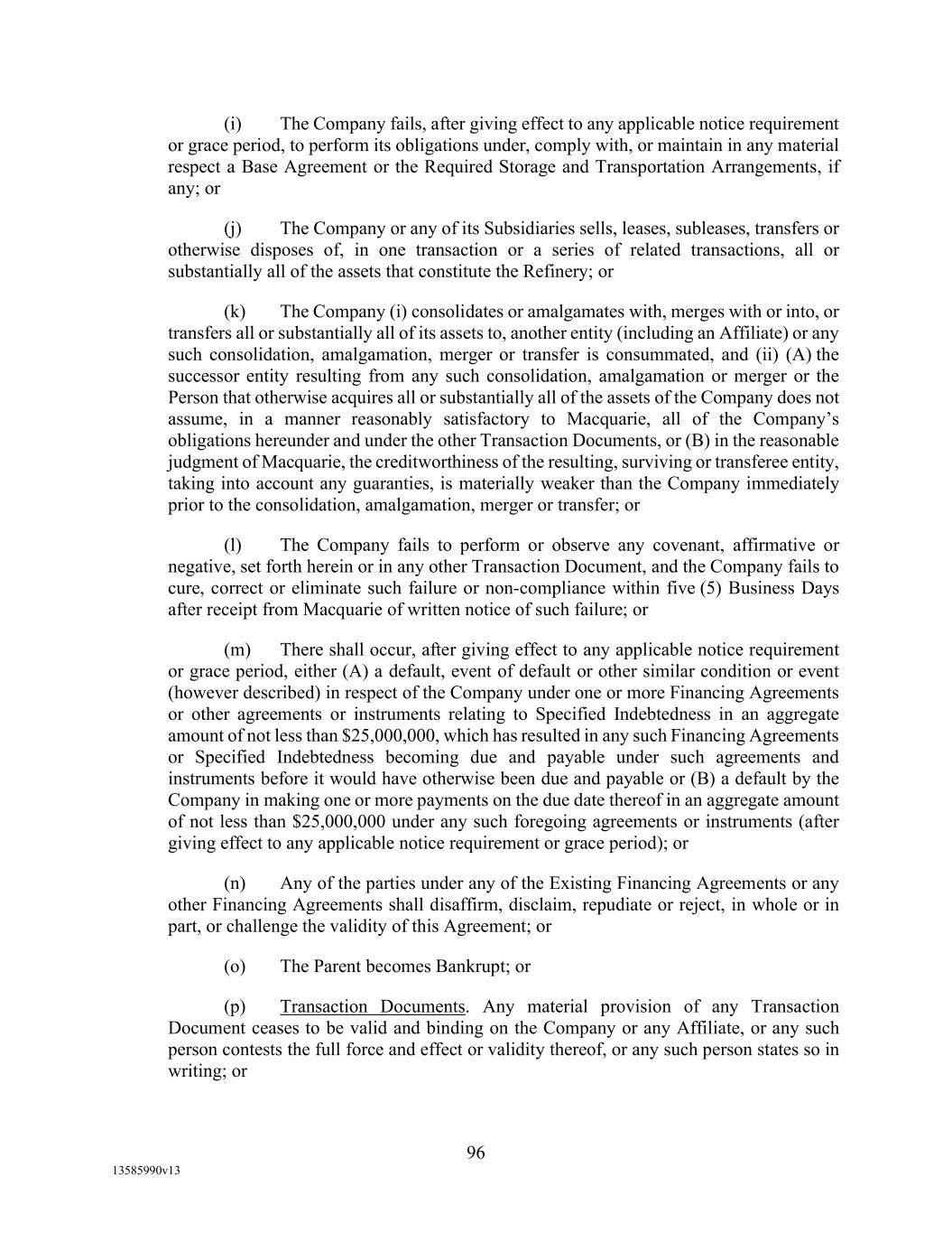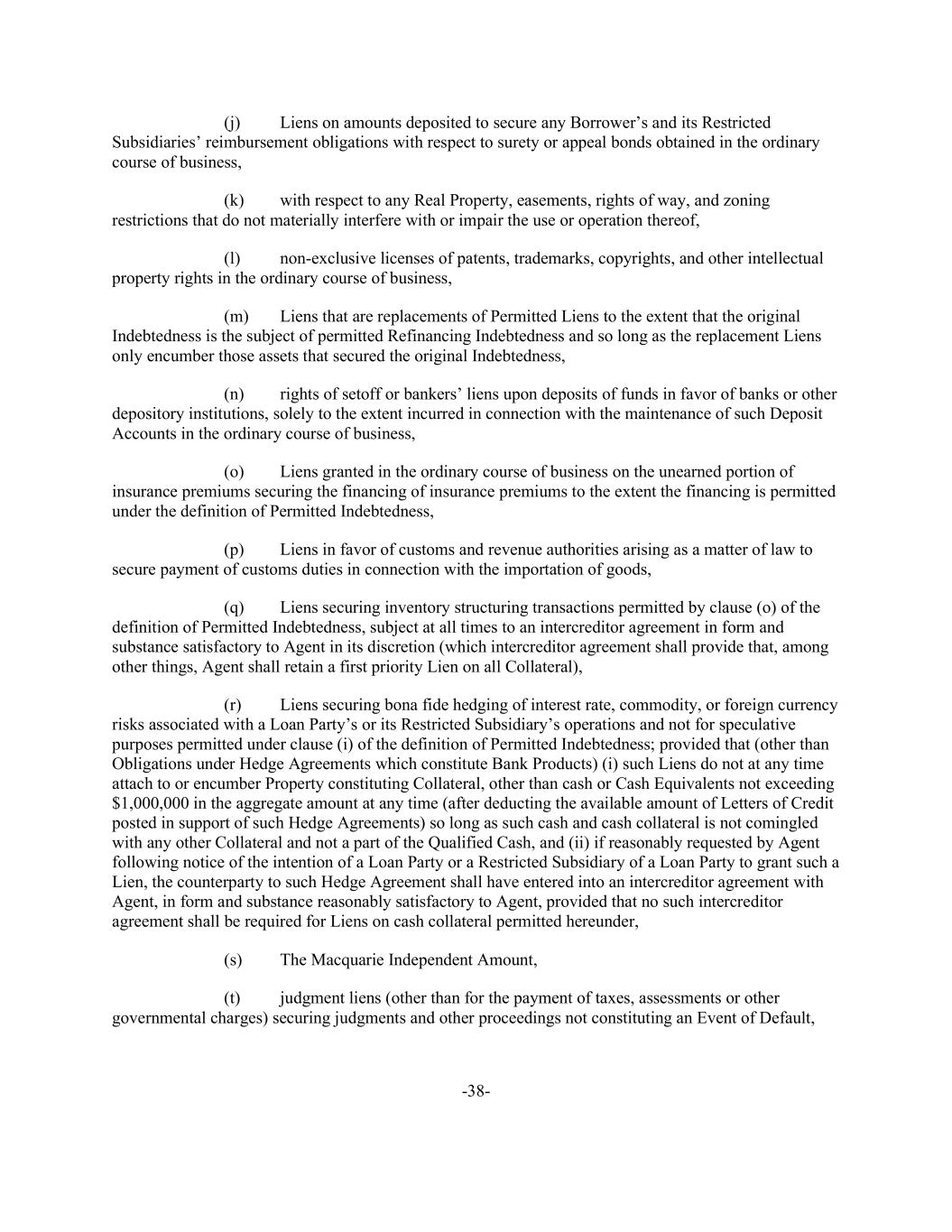 -38- (j) Liens on amounts deposited to secure any Borrower’s and its Restricted Subsidiaries’ reimbursement obligations with respect to surety or appeal bonds obtained in the ordinary course of business, (k) with respect to any Real Property, easements, rights of way, and zoning restrictions that do not materially interfere with or impair the use or operation thereof, (l) non-exclusive licenses of patents, trademarks, copyrights, and other intellectual property rights in the ordinary course of business, (m) Liens that are replacements of Permitted Liens to the extent that the original Indebtedness is the subject of permitted Refinancing Indebtedness and so long as the replacement Liens only encumber those assets that secured the original Indebtedness, (n) rights of setoff or bankers’ liens upon deposits of funds in favor of banks or other depository institutions, solely to the extent incurred in connection with the maintenance of such Deposit Accounts in the ordinary course of business, (o) Liens granted in the ordinary course of business on the unearned portion of insurance premiums securing the financing of insurance premiums to the extent the financing is permitted under the definition of Permitted Indebtedness, (p) Liens in favor of customs and revenue authorities arising as a matter of law to secure payment of customs duties in connection with the importation of goods, (q) Liens securing inventory structuring transactions permitted by clause (o) of the definition of Permitted Indebtedness, subject at all times to an intercreditor agreement in form and substance satisfactory to Agent in its discretion (which intercreditor agreement shall provide that, among other things, Agent shall retain a first priority Lien on all Collateral), (r) Liens securing bona fide hedging of interest rate, commodity, or foreign currency risks associated with a Loan Party’s or its Restricted Subsidiary’s operations and not for speculative purposes permitted under clause (i) of the definition of Permitted Indebtedness; provided that (other than Obligations under Hedge Agreements which constitute Bank Products) (i) such Liens do not at any time attach to or encumber Property constituting Collateral, other than cash or Cash Equivalents not exceeding $1,000,000 in the aggregate amount at any time (after deducting the available amount of Letters of Credit posted in support of such Hedge Agreements) so long as such cash and cash collateral is not comingled with any other Collateral and not a part of the Qualified Cash, and (ii) if reasonably requested by Agent following notice of the intention of a Loan Party or a Restricted Subsidiary of a Loan Party to grant such a Lien, the counterparty to such Hedge Agreement shall have entered into an intercreditor agreement with Agent, in form and substance reasonably satisfactory to Agent, provided that no such intercreditor agreement shall be required for Liens on cash collateral permitted hereunder, (s) The Macquarie Independent Amount, (t) judgment liens (other than for the payment of taxes, assessments or other governmental charges) securing judgments and other proceedings not constituting an Event of Default,