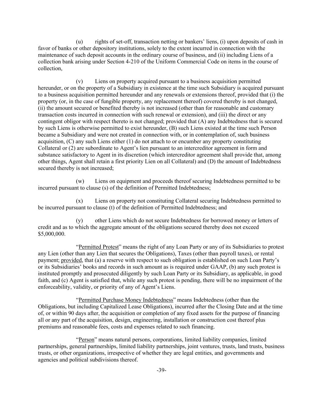 -39- (u) rights of set-off, transaction netting or bankers’ liens, (i) upon deposits of cash in favor of banks or other depository institutions, solely to the extent incurred in connection with the maintenance of such deposit accounts in the ordinary course of business, and (ii) including Liens of a collection bank arising under Section 4-210 of the Uniform Commercial Code on items in the course of collection, (v) Liens on property acquired pursuant to a business acquisition permitted hereunder, or on the property of a Subsidiary in existence at the time such Subsidiary is acquired pursuant to a business acquisition permitted hereunder and any renewals or extensions thereof, provided that (i) the property (or, in the case of fungible property, any replacement thereof) covered thereby is not changed, (ii) the amount secured or benefited thereby is not increased (other than for reasonable and customary transaction costs incurred in connection with such renewal or extension), and (iii) the direct or any contingent obligor with respect thereto is not changed; provided that (A) any Indebtedness that is secured by such Liens is otherwise permitted to exist hereunder, (B) such Liens existed at the time such Person became a Subsidiary and were not created in connection with, or in contemplation of, such business acquisition, (C) any such Liens either (1) do not attach to or encumber any property constituting Collateral or (2) are subordinate to Agent’s lien pursuant to an intercreditor agreement in form and substance satisfactory to Agent in its discretion (which intercreditor agreement shall provide that, among other things, Agent shall retain a first priority Lien on all Collateral) and (D) the amount of Indebtedness secured thereby is not increased; (w) Liens on equipment and proceeds thereof securing Indebtedness permitted to be incurred pursuant to clause (s) of the definition of Permitted Indebtedness; (x) Liens on property not constituting Collateral securing Indebtedness permitted to be incurred pursuant to clause (t) of the definition of Permitted Indebtedness; and (y) other Liens which do not secure Indebtedness for borrowed money or letters of credit and as to which the aggregate amount of the obligations secured thereby does not exceed $5,000,000. “Permitted Protest” means the right of any Loan Party or any of its Subsidiaries to protest any Lien (other than any Lien that secures the Obligations), Taxes (other than payroll taxes), or rental payment; provided, that (a) a reserve with respect to such obligation is established on such Loan Party’s or its Subsidiaries’ books and records in such amount as is required under GAAP, (b) any such protest is instituted promptly and prosecuted diligently by such Loan Party or its Subsidiary, as applicable, in good faith, and (c) Agent is satisfied that, while any such protest is pending, there will be no impairment of the enforceability, validity, or priority of any of Agent’s Liens. “Permitted Purchase Money Indebtedness” means Indebtedness (other than the Obligations, but including Capitalized Lease Obligations), incurred after the Closing Date and at the time of, or within 90 days after, the acquisition or completion of any fixed assets for the purpose of financing all or any part of the acquisition, design, engineering, installation or construction cost thereof plus premiums and reasonable fees, costs and expenses related to such financing. “Person” means natural persons, corporations, limited liability companies, limited partnerships, general partnerships, limited liability partnerships, joint ventures, trusts, land trusts, business trusts, or other organizations, irrespective of whether they are legal entities, and governments and agencies and political subdivisions thereof.
