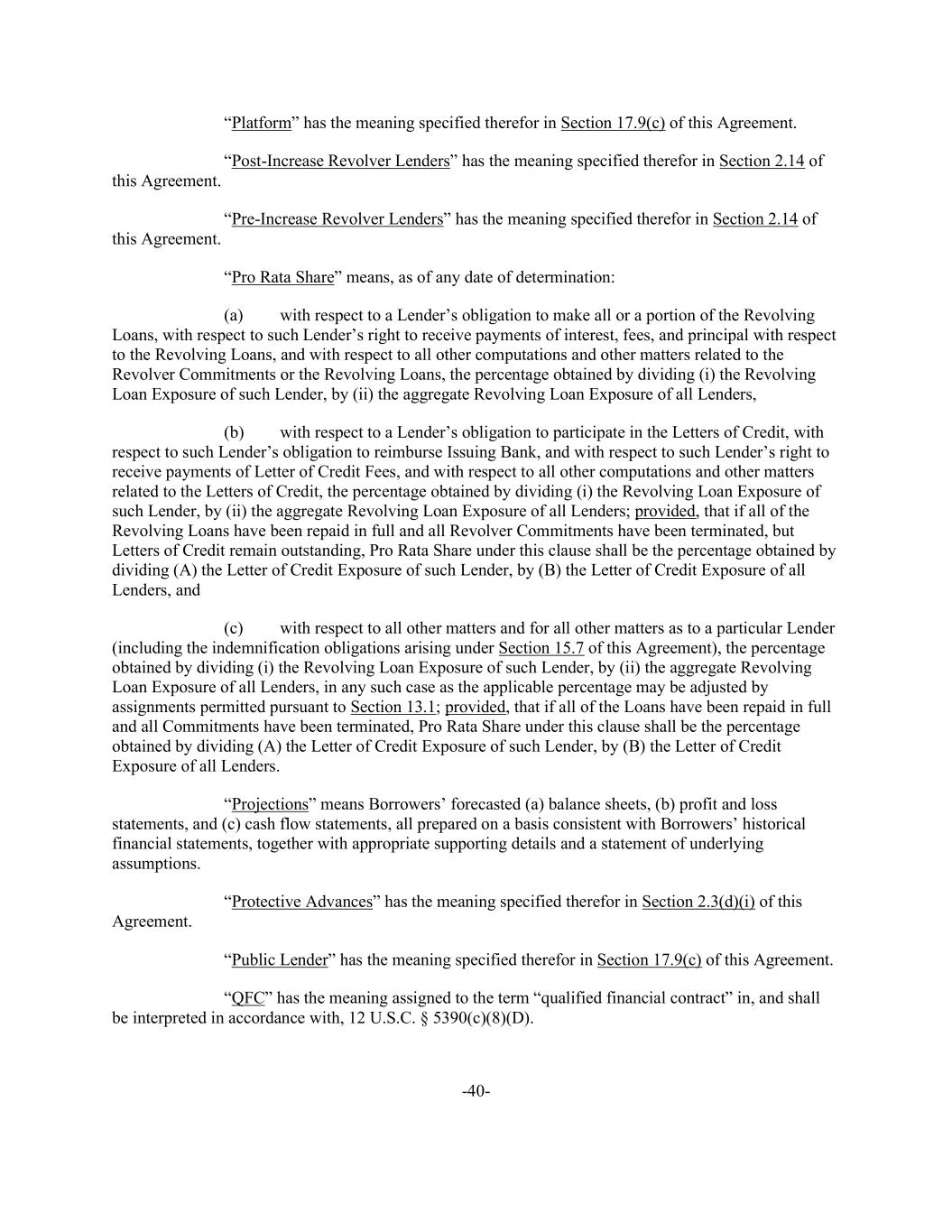 -40- “Platform” has the meaning specified therefor in Section 17.9(c) of this Agreement. “Post-Increase Revolver Lenders” has the meaning specified therefor in Section 2.14 of this Agreement. “Pre-Increase Revolver Lenders” has the meaning specified therefor in Section 2.14 of this Agreement. “Pro Rata Share” means, as of any date of determination: (a) with respect to a Lender’s obligation to make all or a portion of the Revolving Loans, with respect to such Lender’s right to receive payments of interest, fees, and principal with respect to the Revolving Loans, and with respect to all other computations and other matters related to the Revolver Commitments or the Revolving Loans, the percentage obtained by dividing (i) the Revolving Loan Exposure of such Lender, by (ii) the aggregate Revolving Loan Exposure of all Lenders, (b) with respect to a Lender’s obligation to participate in the Letters of Credit, with respect to such Lender’s obligation to reimburse Issuing Bank, and with respect to such Lender’s right to receive payments of Letter of Credit Fees, and with respect to all other computations and other matters related to the Letters of Credit, the percentage obtained by dividing (i) the Revolving Loan Exposure of such Lender, by (ii) the aggregate Revolving Loan Exposure of all Lenders; provided, that if all of the Revolving Loans have been repaid in full and all Revolver Commitments have been terminated, but Letters of Credit remain outstanding, Pro Rata Share under this clause shall be the percentage obtained by dividing (A) the Letter of Credit Exposure of such Lender, by (B) the Letter of Credit Exposure of all Lenders, and (c) with respect to all other matters and for all other matters as to a particular Lender (including the indemnification obligations arising under Section 15.7 of this Agreement), the percentage obtained by dividing (i) the Revolving Loan Exposure of such Lender, by (ii) the aggregate Revolving Loan Exposure of all Lenders, in any such case as the applicable percentage may be adjusted by assignments permitted pursuant to Section 13.1; provided, that if all of the Loans have been repaid in full and all Commitments have been terminated, Pro Rata Share under this clause shall be the percentage obtained by dividing (A) the Letter of Credit Exposure of such Lender, by (B) the Letter of Credit Exposure of all Lenders. “Projections” means Borrowers’ forecasted (a) balance sheets, (b) profit and loss statements, and (c) cash flow statements, all prepared on a basis consistent with Borrowers’ historical financial statements, together with appropriate supporting details and a statement of underlying assumptions. “Protective Advances” has the meaning specified therefor in Section 2.3(d)(i) of this Agreement. “Public Lender” has the meaning specified therefor in Section 17.9(c) of this Agreement. “QFC” has the meaning assigned to the term “qualified financial contract” in, and shall be interpreted in accordance with, 12 U.S.C. § 5390(c)(8)(D).