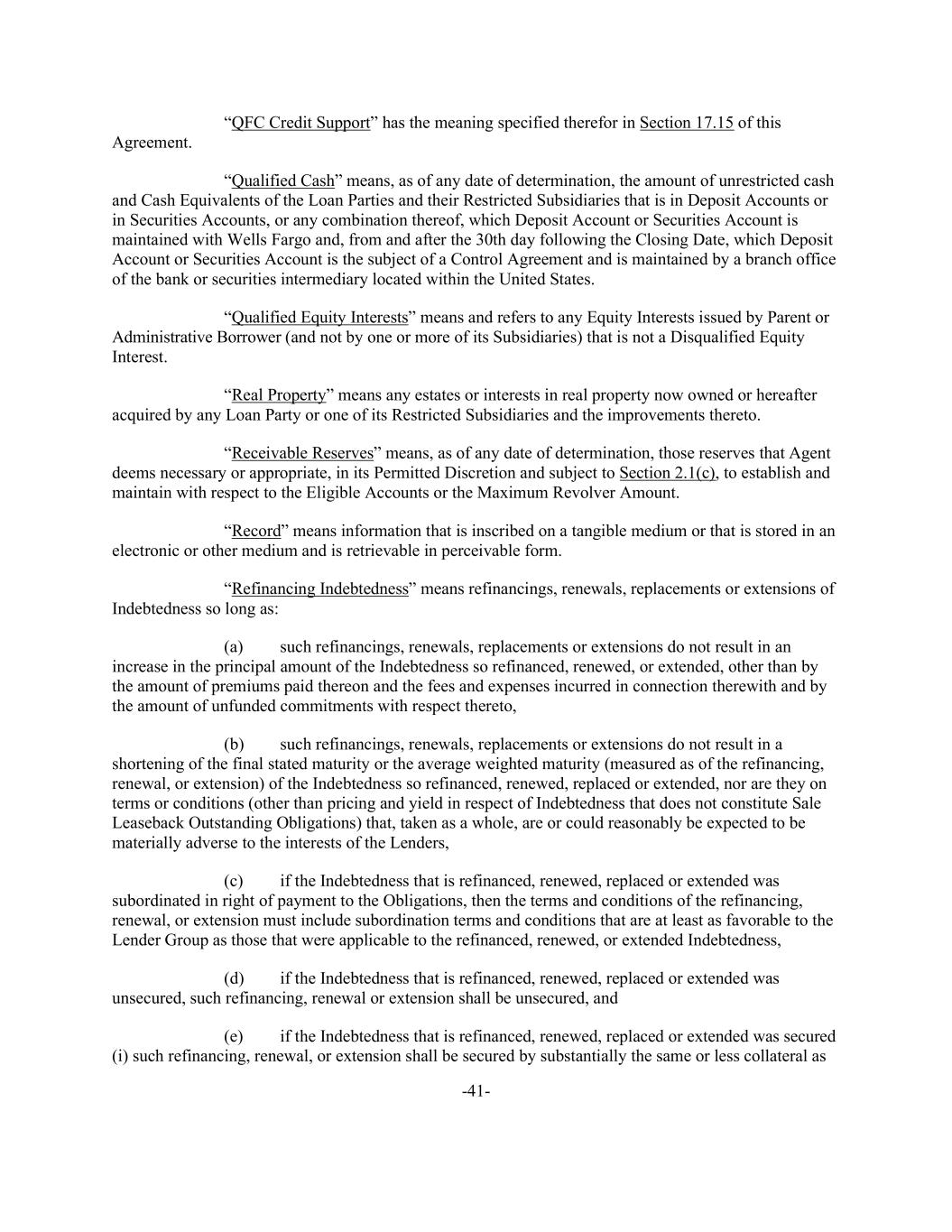 -41- “QFC Credit Support” has the meaning specified therefor in Section 17.15 of this Agreement. “Qualified Cash” means, as of any date of determination, the amount of unrestricted cash and Cash Equivalents of the Loan Parties and their Restricted Subsidiaries that is in Deposit Accounts or in Securities Accounts, or any combination thereof, which Deposit Account or Securities Account is maintained with Wells Fargo and, from and after the 30th day following the Closing Date, which Deposit Account or Securities Account is the subject of a Control Agreement and is maintained by a branch office of the bank or securities intermediary located within the United States. “Qualified Equity Interests” means and refers to any Equity Interests issued by Parent or Administrative Borrower (and not by one or more of its Subsidiaries) that is not a Disqualified Equity Interest. “Real Property” means any estates or interests in real property now owned or hereafter acquired by any Loan Party or one of its Restricted Subsidiaries and the improvements thereto. “Receivable Reserves” means, as of any date of determination, those reserves that Agent deems necessary or appropriate, in its Permitted Discretion and subject to Section 2.1(c), to establish and maintain with respect to the Eligible Accounts or the Maximum Revolver Amount. “Record” means information that is inscribed on a tangible medium or that is stored in an electronic or other medium and is retrievable in perceivable form. “Refinancing Indebtedness” means refinancings, renewals, replacements or extensions of Indebtedness so long as: (a) such refinancings, renewals, replacements or extensions do not result in an increase in the principal amount of the Indebtedness so refinanced, renewed, or extended, other than by the amount of premiums paid thereon and the fees and expenses incurred in connection therewith and by the amount of unfunded commitments with respect thereto, (b) such refinancings, renewals, replacements or extensions do not result in a shortening of the final stated maturity or the average weighted maturity (measured as of the refinancing, renewal, or extension) of the Indebtedness so refinanced, renewed, replaced or extended, nor are they on terms or conditions (other than pricing and yield in respect of Indebtedness that does not constitute Sale Leaseback Outstanding Obligations) that, taken as a whole, are or could reasonably be expected to be materially adverse to the interests of the Lenders, (c) if the Indebtedness that is refinanced, renewed, replaced or extended was subordinated in right of payment to the Obligations, then the terms and conditions of the refinancing, renewal, or extension must include subordination terms and conditions that are at least as favorable to the Lender Group as those that were applicable to the refinanced, renewed, or extended Indebtedness, (d) if the Indebtedness that is refinanced, renewed, replaced or extended was unsecured, such refinancing, renewal or extension shall be unsecured, and (e) if the Indebtedness that is refinanced, renewed, replaced or extended was secured (i) such refinancing, renewal, or extension shall be secured by substantially the same or less collateral as