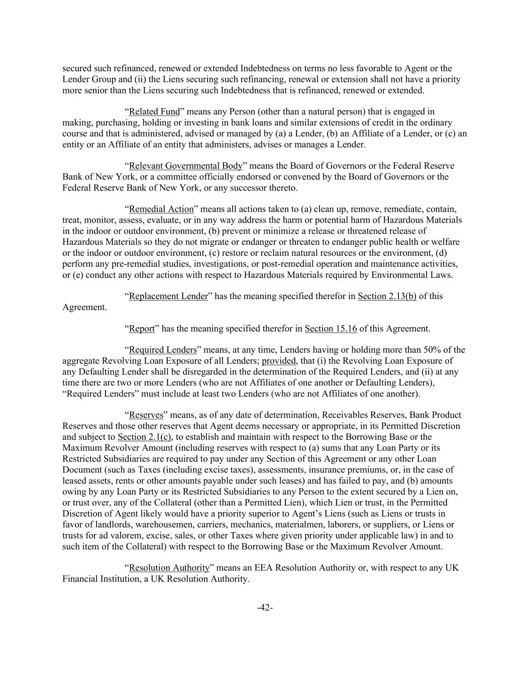 -42- secured such refinanced, renewed or extended Indebtedness on terms no less favorable to Agent or the Lender Group and (ii) the Liens securing such refinancing, renewal or extension shall not have a priority more senior than the Liens securing such Indebtedness that is refinanced, renewed or extended. “Related Fund” means any Person (other than a natural person) that is engaged in making, purchasing, holding or investing in bank loans and similar extensions of credit in the ordinary course and that is administered, advised or managed by (a) a Lender, (b) an Affiliate of a Lender, or (c) an entity or an Affiliate of an entity that administers, advises or manages a Lender. “Relevant Governmental Body” means the Board of Governors or the Federal Reserve Bank of New York, or a committee officially endorsed or convened by the Board of Governors or the Federal Reserve Bank of New York, or any successor thereto. “Remedial Action” means all actions taken to (a) clean up, remove, remediate, contain, treat, monitor, assess, evaluate, or in any way address the harm or potential harm of Hazardous Materials in the indoor or outdoor environment, (b) prevent or minimize a release or threatened release of Hazardous Materials so they do not migrate or endanger or threaten to endanger public health or welfare or the indoor or outdoor environment, (c) restore or reclaim natural resources or the environment, (d) perform any pre-remedial studies, investigations, or post-remedial operation and maintenance activities, or (e) conduct any other actions with respect to Hazardous Materials required by Environmental Laws. “Replacement Lender” has the meaning specified therefor in Section 2.13(b) of this Agreement. “Report” has the meaning specified therefor in Section 15.16 of this Agreement. “Required Lenders” means, at any time, Lenders having or holding more than 50% of the aggregate Revolving Loan Exposure of all Lenders; provided, that (i) the Revolving Loan Exposure of any Defaulting Lender shall be disregarded in the determination of the Required Lenders, and (ii) at any time there are two or more Lenders (who are not Affiliates of one another or Defaulting Lenders), “Required Lenders” must include at least two Lenders (who are not Affiliates of one another). “Reserves” means, as of any date of determination, Receivables Reserves, Bank Product Reserves and those other reserves that Agent deems necessary or appropriate, in its Permitted Discretion and subject to Section 2.1(c), to establish and maintain with respect to the Borrowing Base or the Maximum Revolver Amount (including reserves with respect to (a) sums that any Loan Party or its Restricted Subsidiaries are required to pay under any Section of this Agreement or any other Loan Document (such as Taxes (including excise taxes), assessments, insurance premiums, or, in the case of leased assets, rents or other amounts payable under such leases) and has failed to pay, and (b) amounts owing by any Loan Party or its Restricted Subsidiaries to any Person to the extent secured by a Lien on, or trust over, any of the Collateral (other than a Permitted Lien), which Lien or trust, in the Permitted Discretion of Agent likely would have a priority superior to Agent’s Liens (such as Liens or trusts in favor of landlords, warehousemen, carriers, mechanics, materialmen, laborers, or suppliers, or Liens or trusts for ad valorem, excise, sales, or other Taxes where given priority under applicable law) in and to such item of the Collateral) with respect to the Borrowing Base or the Maximum Revolver Amount. “Resolution Authority” means an EEA Resolution Authority or, with respect to any UK Financial Institution, a UK Resolution Authority.