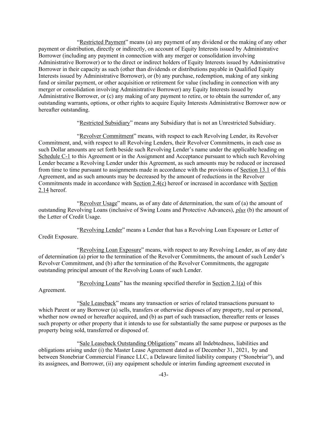 -43- “Restricted Payment” means (a) any payment of any dividend or the making of any other payment or distribution, directly or indirectly, on account of Equity Interests issued by Administrative Borrower (including any payment in connection with any merger or consolidation involving Administrative Borrower) or to the direct or indirect holders of Equity Interests issued by Administrative Borrower in their capacity as such (other than dividends or distributions payable in Qualified Equity Interests issued by Administrative Borrower), or (b) any purchase, redemption, making of any sinking fund or similar payment, or other acquisition or retirement for value (including in connection with any merger or consolidation involving Administrative Borrower) any Equity Interests issued by Administrative Borrower, or (c) any making of any payment to retire, or to obtain the surrender of, any outstanding warrants, options, or other rights to acquire Equity Interests Administrative Borrower now or hereafter outstanding. “Restricted Subsidiary” means any Subsidiary that is not an Unrestricted Subsidiary. “Revolver Commitment” means, with respect to each Revolving Lender, its Revolver Commitment, and, with respect to all Revolving Lenders, their Revolver Commitments, in each case as such Dollar amounts are set forth beside such Revolving Lender’s name under the applicable heading on Schedule C-1 to this Agreement or in the Assignment and Acceptance pursuant to which such Revolving Lender became a Revolving Lender under this Agreement, as such amounts may be reduced or increased from time to time pursuant to assignments made in accordance with the provisions of Section 13.1 of this Agreement, and as such amounts may be decreased by the amount of reductions in the Revolver Commitments made in accordance with Section 2.4(c) hereof or increased in accordance with Section 2.14 hereof. “Revolver Usage” means, as of any date of determination, the sum of (a) the amount of outstanding Revolving Loans (inclusive of Swing Loans and Protective Advances), plus (b) the amount of the Letter of Credit Usage. “Revolving Lender” means a Lender that has a Revolving Loan Exposure or Letter of Credit Exposure. “Revolving Loan Exposure” means, with respect to any Revolving Lender, as of any date of determination (a) prior to the termination of the Revolver Commitments, the amount of such Lender’s Revolver Commitment, and (b) after the termination of the Revolver Commitments, the aggregate outstanding principal amount of the Revolving Loans of such Lender. “Revolving Loans” has the meaning specified therefor in Section 2.1(a) of this Agreement. “Sale Leaseback” means any transaction or series of related transactions pursuant to which Parent or any Borrower (a) sells, transfers or otherwise disposes of any property, real or personal, whether now owned or hereafter acquired, and (b) as part of such transaction, thereafter rents or leases such property or other property that it intends to use for substantially the same purpose or purposes as the property being sold, transferred or disposed of. “Sale Leaseback Outstanding Obligations” means all Indebtedness, liabilities and obligations arising under (i) the Master Lease Agreement dated as of December 31, 2021, by and between Stonebriar Commercial Finance LLC, a Delaware limited liability company (“Stonebriar”), and its assignees, and Borrower, (ii) any equipment schedule or interim funding agreement executed in