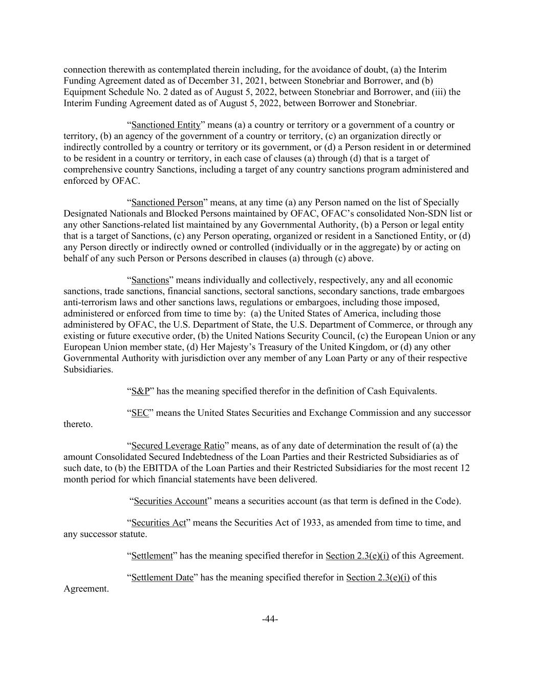 -44- connection therewith as contemplated therein including, for the avoidance of doubt, (a) the Interim Funding Agreement dated as of December 31, 2021, between Stonebriar and Borrower, and (b) Equipment Schedule No. 2 dated as of August 5, 2022, between Stonebriar and Borrower, and (iii) the Interim Funding Agreement dated as of August 5, 2022, between Borrower and Stonebriar. “Sanctioned Entity” means (a) a country or territory or a government of a country or territory, (b) an agency of the government of a country or territory, (c) an organization directly or indirectly controlled by a country or territory or its government, or (d) a Person resident in or determined to be resident in a country or territory, in each case of clauses (a) through (d) that is a target of comprehensive country Sanctions, including a target of any country sanctions program administered and enforced by OFAC. “Sanctioned Person” means, at any time (a) any Person named on the list of Specially Designated Nationals and Blocked Persons maintained by OFAC, OFAC’s consolidated Non-SDN list or any other Sanctions-related list maintained by any Governmental Authority, (b) a Person or legal entity that is a target of Sanctions, (c) any Person operating, organized or resident in a Sanctioned Entity, or (d) any Person directly or indirectly owned or controlled (individually or in the aggregate) by or acting on behalf of any such Person or Persons described in clauses (a) through (c) above. “Sanctions” means individually and collectively, respectively, any and all economic sanctions, trade sanctions, financial sanctions, sectoral sanctions, secondary sanctions, trade embargoes anti-terrorism laws and other sanctions laws, regulations or embargoes, including those imposed, administered or enforced from time to time by: (a) the United States of America, including those administered by OFAC, the U.S. Department of State, the U.S. Department of Commerce, or through any existing or future executive order, (b) the United Nations Security Council, (c) the European Union or any European Union member state, (d) Her Majesty’s Treasury of the United Kingdom, or (d) any other Governmental Authority with jurisdiction over any member of any Loan Party or any of their respective Subsidiaries. “S&P” has the meaning specified therefor in the definition of Cash Equivalents. “SEC” means the United States Securities and Exchange Commission and any successor thereto. “Secured Leverage Ratio” means, as of any date of determination the result of (a) the amount Consolidated Secured Indebtedness of the Loan Parties and their Restricted Subsidiaries as of such date, to (b) the EBITDA of the Loan Parties and their Restricted Subsidiaries for the most recent 12 month period for which financial statements have been delivered. “Securities Account” means a securities account (as that term is defined in the Code). “Securities Act” means the Securities Act of 1933, as amended from time to time, and any successor statute. “Settlement” has the meaning specified therefor in Section 2.3(e)(i) of this Agreement. “Settlement Date” has the meaning specified therefor in Section 2.3(e)(i) of this Agreement.