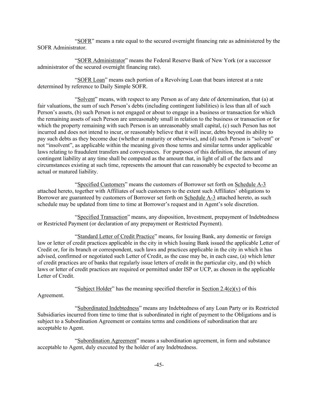 -45- “SOFR” means a rate equal to the secured overnight financing rate as administered by the SOFR Administrator. “SOFR Administrator” means the Federal Reserve Bank of New York (or a successor administrator of the secured overnight financing rate). “SOFR Loan” means each portion of a Revolving Loan that bears interest at a rate determined by reference to Daily Simple SOFR. “Solvent” means, with respect to any Person as of any date of determination, that (a) at fair valuations, the sum of such Person’s debts (including contingent liabilities) is less than all of such Person’s assets, (b) such Person is not engaged or about to engage in a business or transaction for which the remaining assets of such Person are unreasonably small in relation to the business or transaction or for which the property remaining with such Person is an unreasonably small capital, (c) such Person has not incurred and does not intend to incur, or reasonably believe that it will incur, debts beyond its ability to pay such debts as they become due (whether at maturity or otherwise), and (d) such Person is “solvent” or not “insolvent”, as applicable within the meaning given those terms and similar terms under applicable laws relating to fraudulent transfers and conveyances. For purposes of this definition, the amount of any contingent liability at any time shall be computed as the amount that, in light of all of the facts and circumstances existing at such time, represents the amount that can reasonably be expected to become an actual or matured liability. “Specified Customers” means the customers of Borrower set forth on Schedule A-3 attached hereto, together with Affiliates of such customers to the extent such Affiliates’ obligations to Borrower are guaranteed by customers of Borrower set forth on Schedule A-3 attached hereto, as such schedule may be updated from time to time at Borrower’s request and in Agent’s sole discretion. “Specified Transaction” means, any disposition, Investment, prepayment of Indebtedness or Restricted Payment (or declaration of any prepayment or Restricted Payment). “Standard Letter of Credit Practice” means, for Issuing Bank, any domestic or foreign law or letter of credit practices applicable in the city in which Issuing Bank issued the applicable Letter of Credit or, for its branch or correspondent, such laws and practices applicable in the city in which it has advised, confirmed or negotiated such Letter of Credit, as the case may be, in each case, (a) which letter of credit practices are of banks that regularly issue letters of credit in the particular city, and (b) which laws or letter of credit practices are required or permitted under ISP or UCP, as chosen in the applicable Letter of Credit. “Subject Holder” has the meaning specified therefor in Section 2.4(e)(v) of this Agreement. “Subordinated Indebtedness” means any Indebtedness of any Loan Party or its Restricted Subsidiaries incurred from time to time that is subordinated in right of payment to the Obligations and is subject to a Subordination Agreement or contains terms and conditions of subordination that are acceptable to Agent. “Subordination Agreement” means a subordination agreement, in form and substance acceptable to Agent, duly executed by the holder of any Indebtedness.