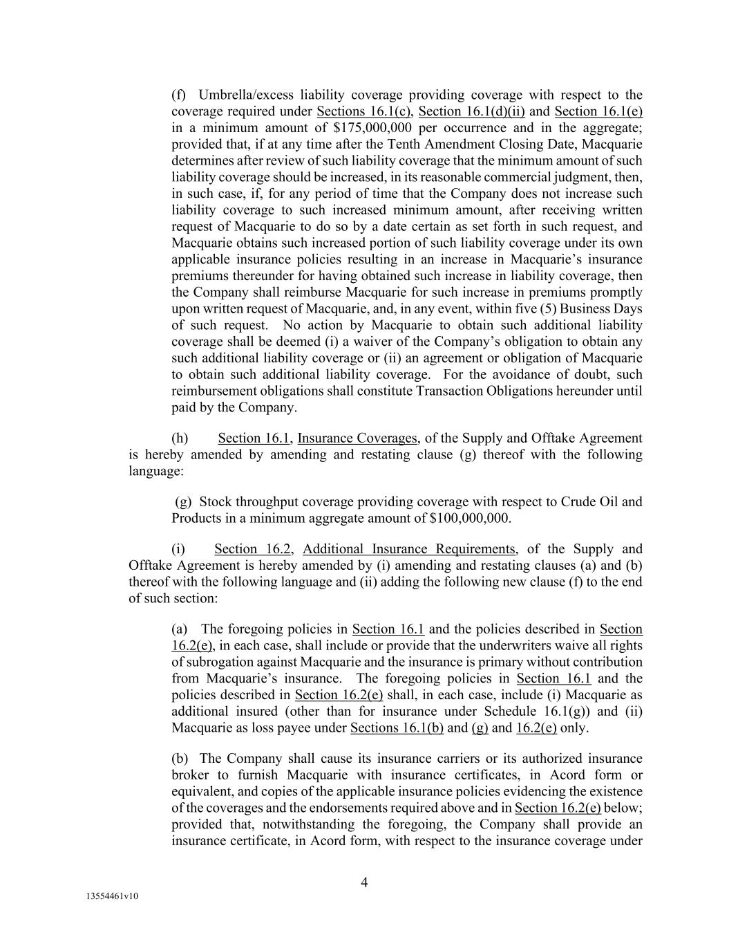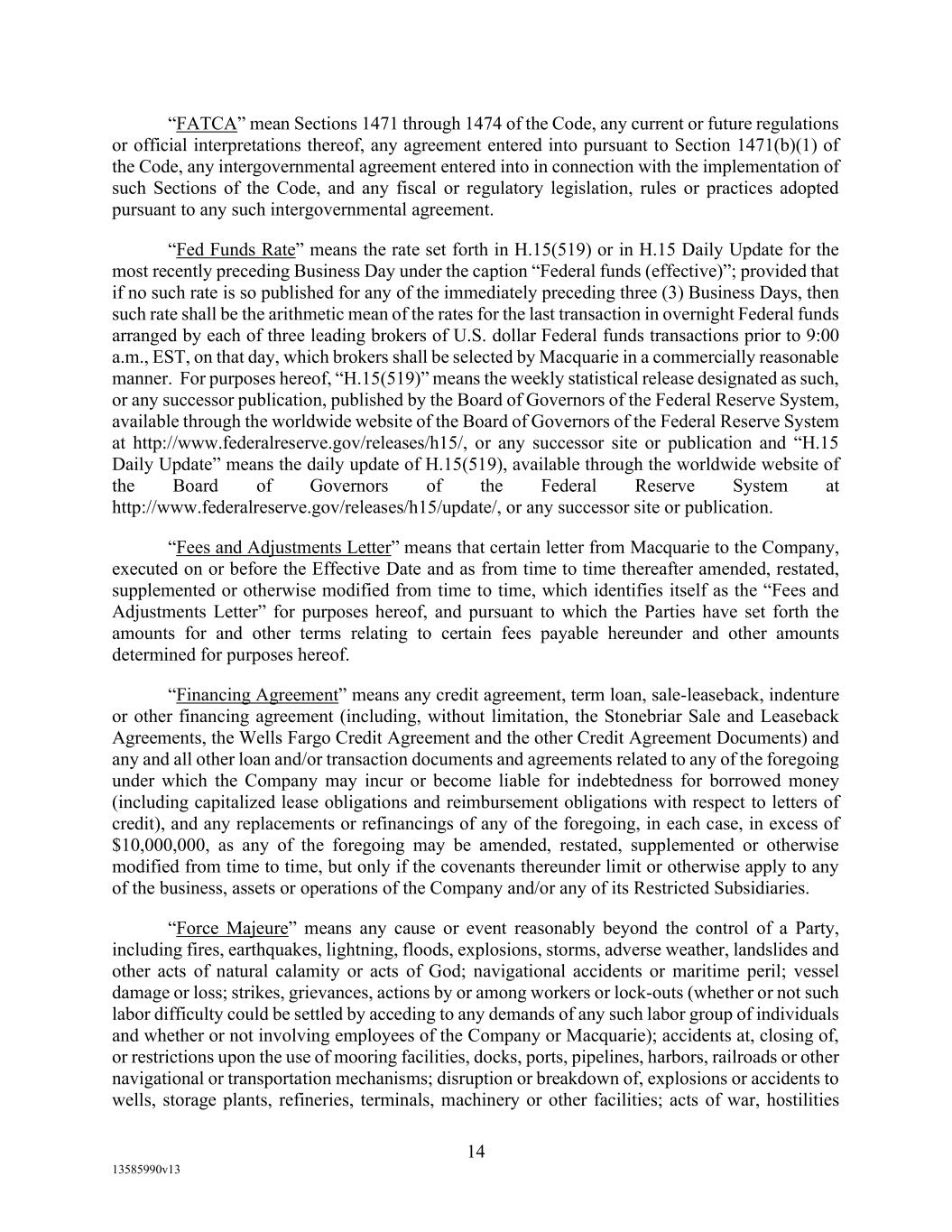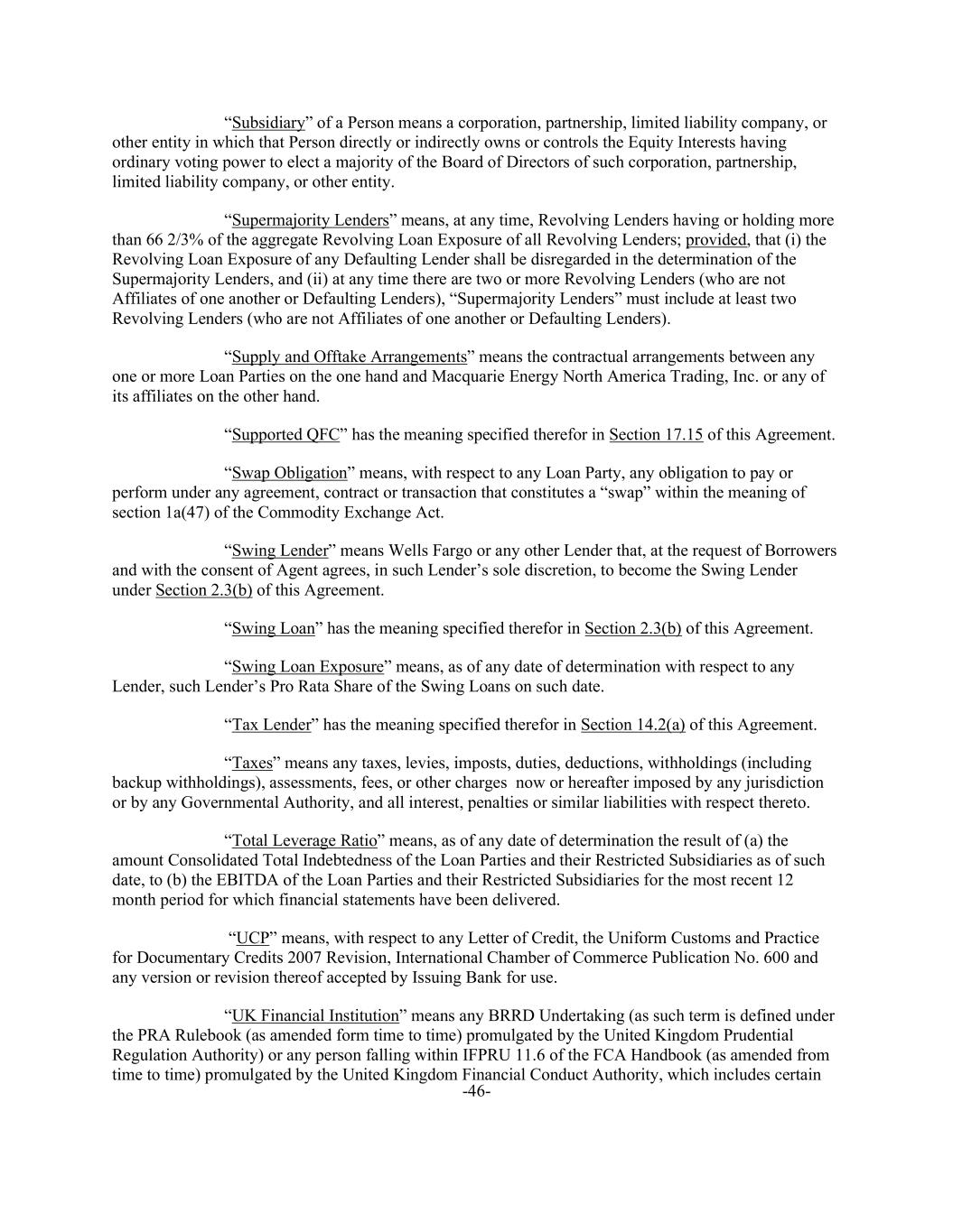 -46- “Subsidiary” of a Person means a corporation, partnership, limited liability company, or other entity in which that Person directly or indirectly owns or controls the Equity Interests having ordinary voting power to elect a majority of the Board of Directors of such corporation, partnership, limited liability company, or other entity. “Supermajority Lenders” means, at any time, Revolving Lenders having or holding more than 66 2/3% of the aggregate Revolving Loan Exposure of all Revolving Lenders; provided, that (i) the Revolving Loan Exposure of any Defaulting Lender shall be disregarded in the determination of the Supermajority Lenders, and (ii) at any time there are two or more Revolving Lenders (who are not Affiliates of one another or Defaulting Lenders), “Supermajority Lenders” must include at least two Revolving Lenders (who are not Affiliates of one another or Defaulting Lenders). “Supply and Offtake Arrangements” means the contractual arrangements between any one or more Loan Parties on the one hand and Macquarie Energy North America Trading, Inc. or any of its affiliates on the other hand. “Supported QFC” has the meaning specified therefor in Section 17.15 of this Agreement. “Swap Obligation” means, with respect to any Loan Party, any obligation to pay or perform under any agreement, contract or transaction that constitutes a “swap” within the meaning of section 1a(47) of the Commodity Exchange Act. “Swing Lender” means Wells Fargo or any other Lender that, at the request of Borrowers and with the consent of Agent agrees, in such Lender’s sole discretion, to become the Swing Lender under Section 2.3(b) of this Agreement. “Swing Loan” has the meaning specified therefor in Section 2.3(b) of this Agreement. “Swing Loan Exposure” means, as of any date of determination with respect to any Lender, such Lender’s Pro Rata Share of the Swing Loans on such date. “Tax Lender” has the meaning specified therefor in Section 14.2(a) of this Agreement. “Taxes” means any taxes, levies, imposts, duties, deductions, withholdings (including backup withholdings), assessments, fees, or other charges now or hereafter imposed by any jurisdiction or by any Governmental Authority, and all interest, penalties or similar liabilities with respect thereto. “Total Leverage Ratio” means, as of any date of determination the result of (a) the amount Consolidated Total Indebtedness of the Loan Parties and their Restricted Subsidiaries as of such date, to (b) the EBITDA of the Loan Parties and their Restricted Subsidiaries for the most recent 12 month period for which financial statements have been delivered. “UCP” means, with respect to any Letter of Credit, the Uniform Customs and Practice for Documentary Credits 2007 Revision, International Chamber of Commerce Publication No. 600 and any version or revision thereof accepted by Issuing Bank for use. “UK Financial Institution” means any BRRD Undertaking (as such term is defined under the PRA Rulebook (as amended form time to time) promulgated by the United Kingdom Prudential Regulation Authority) or any person falling within IFPRU 11.6 of the FCA Handbook (as amended from time to time) promulgated by the United Kingdom Financial Conduct Authority, which includes certain