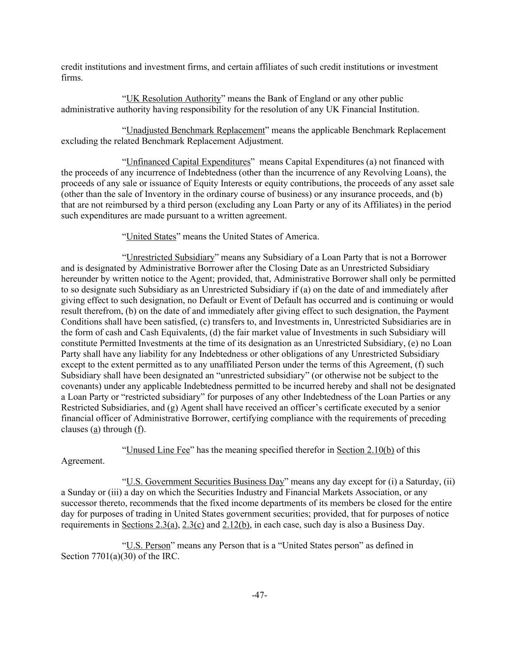 -47- credit institutions and investment firms, and certain affiliates of such credit institutions or investment firms. “UK Resolution Authority” means the Bank of England or any other public administrative authority having responsibility for the resolution of any UK Financial Institution. “Unadjusted Benchmark Replacement” means the applicable Benchmark Replacement excluding the related Benchmark Replacement Adjustment. “Unfinanced Capital Expenditures” means Capital Expenditures (a) not financed with the proceeds of any incurrence of Indebtedness (other than the incurrence of any Revolving Loans), the proceeds of any sale or issuance of Equity Interests or equity contributions, the proceeds of any asset sale (other than the sale of Inventory in the ordinary course of business) or any insurance proceeds, and (b) that are not reimbursed by a third person (excluding any Loan Party or any of its Affiliates) in the period such expenditures are made pursuant to a written agreement. “United States” means the United States of America. “Unrestricted Subsidiary” means any Subsidiary of a Loan Party that is not a Borrower and is designated by Administrative Borrower after the Closing Date as an Unrestricted Subsidiary hereunder by written notice to the Agent; provided, that, Administrative Borrower shall only be permitted to so designate such Subsidiary as an Unrestricted Subsidiary if (a) on the date of and immediately after giving effect to such designation, no Default or Event of Default has occurred and is continuing or would result therefrom, (b) on the date of and immediately after giving effect to such designation, the Payment Conditions shall have been satisfied, (c) transfers to, and Investments in, Unrestricted Subsidiaries are in the form of cash and Cash Equivalents, (d) the fair market value of Investments in such Subsidiary will constitute Permitted Investments at the time of its designation as an Unrestricted Subsidiary, (e) no Loan Party shall have any liability for any Indebtedness or other obligations of any Unrestricted Subsidiary except to the extent permitted as to any unaffiliated Person under the terms of this Agreement, (f) such Subsidiary shall have been designated an “unrestricted subsidiary” (or otherwise not be subject to the covenants) under any applicable Indebtedness permitted to be incurred hereby and shall not be designated a Loan Party or “restricted subsidiary” for purposes of any other Indebtedness of the Loan Parties or any Restricted Subsidiaries, and (g) Agent shall have received an officer’s certificate executed by a senior financial officer of Administrative Borrower, certifying compliance with the requirements of preceding clauses (a) through (f). “Unused Line Fee” has the meaning specified therefor in Section 2.10(b) of this Agreement. “U.S. Government Securities Business Day” means any day except for (i) a Saturday, (ii) a Sunday or (iii) a day on which the Securities Industry and Financial Markets Association, or any successor thereto, recommends that the fixed income departments of its members be closed for the entire day for purposes of trading in United States government securities; provided, that for purposes of notice requirements in Sections 2.3(a), 2.3(c) and 2.12(b), in each case, such day is also a Business Day. “U.S. Person” means any Person that is a “United States person” as defined in Section 7701(a)(30) of the IRC.