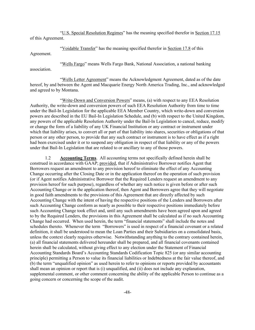 -48- “U.S. Special Resolution Regimes” has the meaning specified therefor in Section 17.15 of this Agreement. “Voidable Transfer” has the meaning specified therefor in Section 17.8 of this Agreement. “Wells Fargo” means Wells Fargo Bank, National Association, a national banking association. “Wells Letter Agreement” means the Acknowledgment Agreement, dated as of the date hereof, by and between the Agent and Macquarie Energy North America Trading, Inc., and acknowledged and agreed to by Montana. “Write-Down and Conversion Powers” means, (a) with respect to any EEA Resolution Authority, the write-down and conversion powers of such EEA Resolution Authority from time to time under the Bail-In Legislation for the applicable EEA Member Country, which write-down and conversion powers are described in the EU Bail-In Legislation Schedule, and (b) with respect to the United Kingdom, any powers of the applicable Resolution Authority under the Bail-In Legislation to cancel, reduce, modify or change the form of a liability of any UK Financial Institution or any contract or instrument under which that liability arises, to convert all or part of that liability into shares, securities or obligations of that person or any other person, to provide that any such contract or instrument is to have effect as if a right had been exercised under it or to suspend any obligation in respect of that liability or any of the powers under that Bail-In Legislation that are related to or ancillary to any of those powers. 1.2 Accounting Terms. All accounting terms not specifically defined herein shall be construed in accordance with GAAP; provided, that if Administrative Borrower notifies Agent that Borrowers request an amendment to any provision hereof to eliminate the effect of any Accounting Change occurring after the Closing Date or in the application thereof on the operation of such provision (or if Agent notifies Administrative Borrower that the Required Lenders request an amendment to any provision hereof for such purpose), regardless of whether any such notice is given before or after such Accounting Change or in the application thereof, then Agent and Borrowers agree that they will negotiate in good faith amendments to the provisions of this Agreement that are directly affected by such Accounting Change with the intent of having the respective positions of the Lenders and Borrowers after such Accounting Change conform as nearly as possible to their respective positions immediately before such Accounting Change took effect and, until any such amendments have been agreed upon and agreed to by the Required Lenders, the provisions in this Agreement shall be calculated as if no such Accounting Change had occurred. When used herein, the term “financial statements” shall include the notes and schedules thereto. Whenever the term “Borrowers” is used in respect of a financial covenant or a related definition, it shall be understood to mean the Loan Parties and their Subsidiaries on a consolidated basis, unless the context clearly requires otherwise. Notwithstanding anything to the contrary contained herein, (a) all financial statements delivered hereunder shall be prepared, and all financial covenants contained herein shall be calculated, without giving effect to any election under the Statement of Financial Accounting Standards Board’s Accounting Standards Codification Topic 825 (or any similar accounting principle) permitting a Person to value its financial liabilities or Indebtedness at the fair value thereof, and (b) the term “unqualified opinion” as used herein to refer to opinions or reports provided by accountants shall mean an opinion or report that is (i) unqualified, and (ii) does not include any explanation, supplemental comment, or other comment concerning the ability of the applicable Person to continue as a going concern or concerning the scope of the audit.