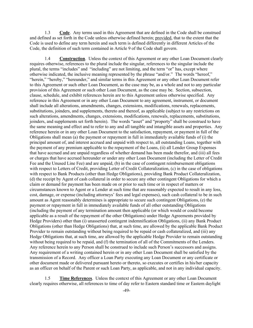 -49- 1.3 Code. Any terms used in this Agreement that are defined in the Code shall be construed and defined as set forth in the Code unless otherwise defined herein; provided, that to the extent that the Code is used to define any term herein and such term is defined differently in different Articles of the Code, the definition of such term contained in Article 9 of the Code shall govern. 1.4 Construction. Unless the context of this Agreement or any other Loan Document clearly requires otherwise, references to the plural include the singular, references to the singular include the plural, the terms “includes” and “including” are not limiting, and the term “or” has, except where otherwise indicated, the inclusive meaning represented by the phrase “and/or.” The words “hereof,” “herein,” “hereby,” “hereunder,” and similar terms in this Agreement or any other Loan Document refer to this Agreement or such other Loan Document, as the case may be, as a whole and not to any particular provision of this Agreement or such other Loan Document, as the case may be. Section, subsection, clause, schedule, and exhibit references herein are to this Agreement unless otherwise specified. Any reference in this Agreement or in any other Loan Document to any agreement, instrument, or document shall include all alterations, amendments, changes, extensions, modifications, renewals, replacements, substitutions, joinders, and supplements, thereto and thereof, as applicable (subject to any restrictions on such alterations, amendments, changes, extensions, modifications, renewals, replacements, substitutions, joinders, and supplements set forth herein). The words “asset” and “property” shall be construed to have the same meaning and effect and to refer to any and all tangible and intangible assets and properties. Any reference herein or in any other Loan Document to the satisfaction, repayment, or payment in full of the Obligations shall mean (a) the payment or repayment in full in immediately available funds of (i) the principal amount of, and interest accrued and unpaid with respect to, all outstanding Loans, together with the payment of any premium applicable to the repayment of the Loans, (ii) all Lender Group Expenses that have accrued and are unpaid regardless of whether demand has been made therefor, and (iii) all fees or charges that have accrued hereunder or under any other Loan Document (including the Letter of Credit Fee and the Unused Line Fee) and are unpaid, (b) in the case of contingent reimbursement obligations with respect to Letters of Credit, providing Letter of Credit Collateralization, (c) in the case of obligations with respect to Bank Products (other than Hedge Obligations), providing Bank Product Collateralization, (d) the receipt by Agent of cash collateral in order to secure any other contingent Obligations for which a claim or demand for payment has been made on or prior to such time or in respect of matters or circumstances known to Agent or a Lender at such time that are reasonably expected to result in any loss, cost, damage, or expense (including attorneys’ fees and legal expenses), such cash collateral to be in such amount as Agent reasonably determines is appropriate to secure such contingent Obligations, (e) the payment or repayment in full in immediately available funds of all other outstanding Obligations (including the payment of any termination amount then applicable (or which would or could become applicable as a result of the repayment of the other Obligations) under Hedge Agreements provided by Hedge Providers) other than (i) unasserted contingent indemnification Obligations, (ii) any Bank Product Obligations (other than Hedge Obligations) that, at such time, are allowed by the applicable Bank Product Provider to remain outstanding without being required to be repaid or cash collateralized, and (iii) any Hedge Obligations that, at such time, are allowed by the applicable Hedge Provider to remain outstanding without being required to be repaid, and (f) the termination of all of the Commitments of the Lenders. Any reference herein to any Person shall be construed to include such Person’s successors and assigns. Any requirement of a writing contained herein or in any other Loan Document shall be satisfied by the transmission of a Record. Any officer a Loan Party executing any Loan Document or any certificate or other document made or delivered pursuant hereto or thereto, so executes or certifies in his/her capacity as an officer on behalf of the Parent or such Loan Party, as applicable, and not in any individual capacity. 1.5 Time References. Unless the context of this Agreement or any other Loan Document clearly requires otherwise, all references to time of day refer to Eastern standard time or Eastern daylight