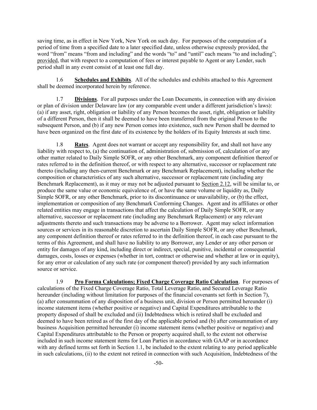 -50- saving time, as in effect in New York, New York on such day. For purposes of the computation of a period of time from a specified date to a later specified date, unless otherwise expressly provided, the word “from” means “from and including” and the words “to” and “until” each means “to and including”; provided, that with respect to a computation of fees or interest payable to Agent or any Lender, such period shall in any event consist of at least one full day. 1.6 Schedules and Exhibits. All of the schedules and exhibits attached to this Agreement shall be deemed incorporated herein by reference. 1.7 Divisions. For all purposes under the Loan Documents, in connection with any division or plan of division under Delaware law (or any comparable event under a different jurisdiction’s laws): (a) if any asset, right, obligation or liability of any Person becomes the asset, right, obligation or liability of a different Person, then it shall be deemed to have been transferred from the original Person to the subsequent Person, and (b) if any new Person comes into existence, such new Person shall be deemed to have been organized on the first date of its existence by the holders of its Equity Interests at such time. 1.8 Rates. Agent does not warrant or accept any responsibility for, and shall not have any liability with respect to, (a) the continuation of, administration of, submission of, calculation of or any other matter related to Daily Simple SOFR, or any other Benchmark, any component definition thereof or rates referred to in the definition thereof, or with respect to any alternative, successor or replacement rate thereto (including any then-current Benchmark or any Benchmark Replacement), including whether the composition or characteristics of any such alternative, successor or replacement rate (including any Benchmark Replacement), as it may or may not be adjusted pursuant to Section 2.12, will be similar to, or produce the same value or economic equivalence of, or have the same volume or liquidity as, Daily Simple SOFR, or any other Benchmark, prior to its discontinuance or unavailability, or (b) the effect, implementation or composition of any Benchmark Conforming Changes. Agent and its affiliates or other related entities may engage in transactions that affect the calculation of Daily Simple SOFR, or any alternative, successor or replacement rate (including any Benchmark Replacement) or any relevant adjustments thereto and such transactions may be adverse to a Borrower. Agent may select information sources or services in its reasonable discretion to ascertain Daily Simple SOFR, or any other Benchmark, any component definition thereof or rates referred to in the definition thereof, in each case pursuant to the terms of this Agreement, and shall have no liability to any Borrower, any Lender or any other person or entity for damages of any kind, including direct or indirect, special, punitive, incidental or consequential damages, costs, losses or expenses (whether in tort, contract or otherwise and whether at law or in equity), for any error or calculation of any such rate (or component thereof) provided by any such information source or service. 1.9 Pro Forma Calculations; Fixed Charge Coverage Ratio Calculation. For purposes of calculations of the Fixed Charge Coverage Ratio, Total Leverage Ratio, and Secured Leverage Ratio hereunder (including without limitation for purposes of the financial covenants set forth in Section 7), (a) after consummation of any disposition of a business unit, division or Person permitted hereunder (i) income statement items (whether positive or negative) and Capital Expenditures attributable to the property disposed of shall be excluded and (ii) Indebtedness which is retired shall be excluded and deemed to have been retired as of the first day of the applicable period and (b) after consummation of any business Acquisition permitted hereunder (i) income statement items (whether positive or negative) and Capital Expenditures attributable to the Person or property acquired shall, to the extent not otherwise included in such income statement items for Loan Parties in accordance with GAAP or in accordance with any defined terms set forth in Section 1.1, be included to the extent relating to any period applicable in such calculations, (ii) to the extent not retired in connection with such Acquisition, Indebtedness of the