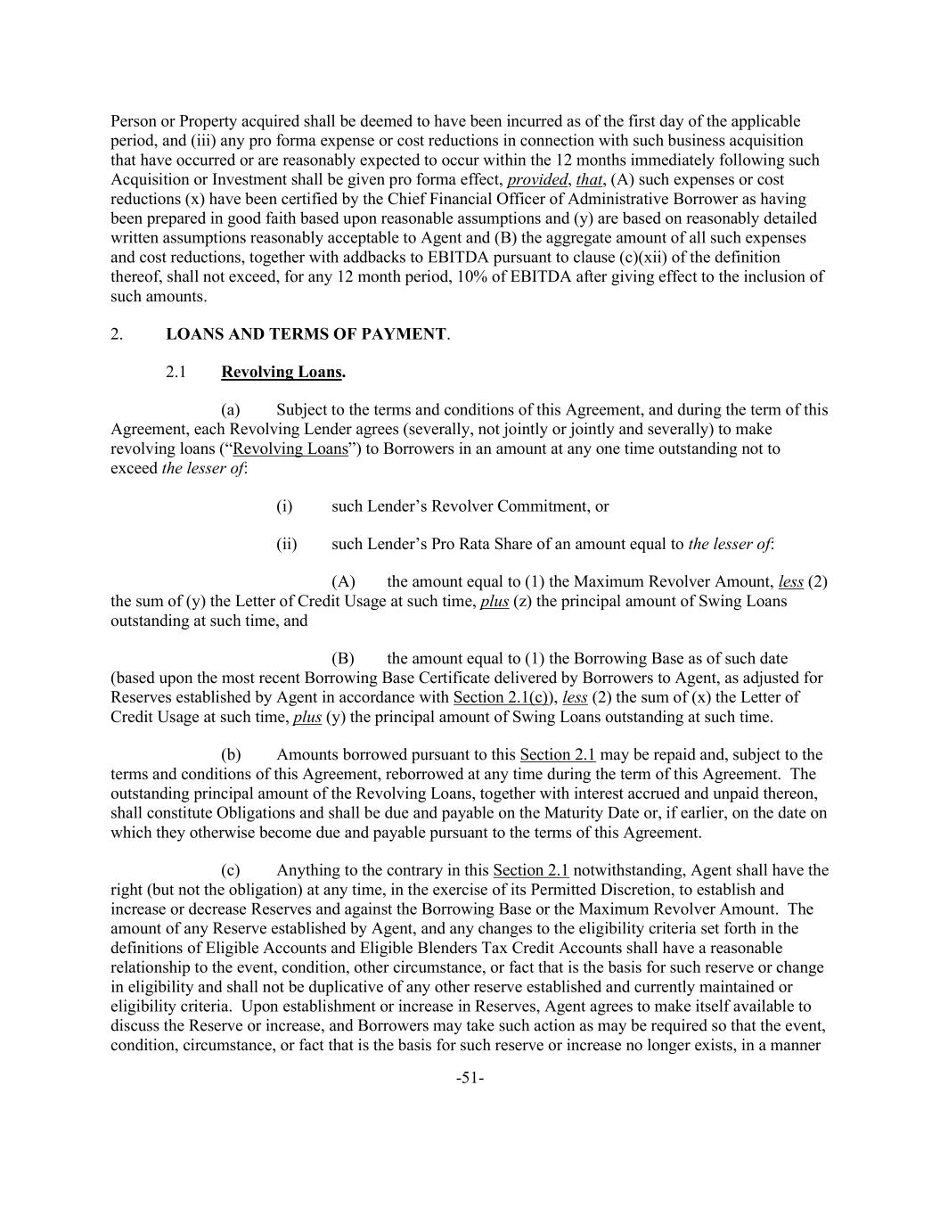 -51- Person or Property acquired shall be deemed to have been incurred as of the first day of the applicable period, and (iii) any pro forma expense or cost reductions in connection with such business acquisition that have occurred or are reasonably expected to occur within the 12 months immediately following such Acquisition or Investment shall be given pro forma effect, provided, that, (A) such expenses or cost reductions (x) have been certified by the Chief Financial Officer of Administrative Borrower as having been prepared in good faith based upon reasonable assumptions and (y) are based on reasonably detailed written assumptions reasonably acceptable to Agent and (B) the aggregate amount of all such expenses and cost reductions, together with addbacks to EBITDA pursuant to clause (c)(xii) of the definition thereof, shall not exceed, for any 12 month period, 10% of EBITDA after giving effect to the inclusion of such amounts. 2. LOANS AND TERMS OF PAYMENT. 2.1 Revolving Loans. (a) Subject to the terms and conditions of this Agreement, and during the term of this Agreement, each Revolving Lender agrees (severally, not jointly or jointly and severally) to make revolving loans (“Revolving Loans”) to Borrowers in an amount at any one time outstanding not to exceed the lesser of: (i) such Lender’s Revolver Commitment, or (ii) such Lender’s Pro Rata Share of an amount equal to the lesser of: (A) the amount equal to (1) the Maximum Revolver Amount, less (2) the sum of (y) the Letter of Credit Usage at such time, plus (z) the principal amount of Swing Loans outstanding at such time, and (B) the amount equal to (1) the Borrowing Base as of such date (based upon the most recent Borrowing Base Certificate delivered by Borrowers to Agent, as adjusted for Reserves established by Agent in accordance with Section 2.1(c)), less (2) the sum of (x) the Letter of Credit Usage at such time, plus (y) the principal amount of Swing Loans outstanding at such time. (b) Amounts borrowed pursuant to this Section 2.1 may be repaid and, subject to the terms and conditions of this Agreement, reborrowed at any time during the term of this Agreement. The outstanding principal amount of the Revolving Loans, together with interest accrued and unpaid thereon, shall constitute Obligations and shall be due and payable on the Maturity Date or, if earlier, on the date on which they otherwise become due and payable pursuant to the terms of this Agreement. (c) Anything to the contrary in this Section 2.1 notwithstanding, Agent shall have the right (but not the obligation) at any time, in the exercise of its Permitted Discretion, to establish and increase or decrease Reserves and against the Borrowing Base or the Maximum Revolver Amount. The amount of any Reserve established by Agent, and any changes to the eligibility criteria set forth in the definitions of Eligible Accounts and Eligible Blenders Tax Credit Accounts shall have a reasonable relationship to the event, condition, other circumstance, or fact that is the basis for such reserve or change in eligibility and shall not be duplicative of any other reserve established and currently maintained or eligibility criteria. Upon establishment or increase in Reserves, Agent agrees to make itself available to discuss the Reserve or increase, and Borrowers may take such action as may be required so that the event, condition, circumstance, or fact that is the basis for such reserve or increase no longer exists, in a manner