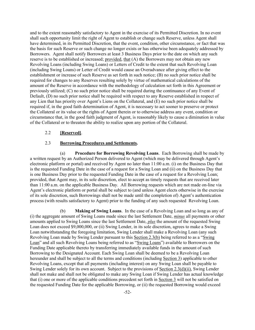 -52- and to the extent reasonably satisfactory to Agent in the exercise of its Permitted Discretion. In no event shall such opportunity limit the right of Agent to establish or change such Reserve, unless Agent shall have determined, in its Permitted Discretion, that the event, condition, other circumstance, or fact that was the basis for such Reserve or such change no longer exists or has otherwise been adequately addressed by Borrowers. Agent shall notify Borrowers at least 3 Business Days prior to the date on which any such reserve is to be established or increased; provided, that (A) the Borrowers may not obtain any new Revolving Loans (including Swing Loans) or Letters of Credit to the extent that such Revolving Loan (including Swing Loans) or Letter of Credit would cause an Overadvance after giving effect to the establishment or increase of such Reserve as set forth in such notice; (B) no such prior notice shall be required for changes to any Reserves resulting solely by virtue of mathematical calculations of the amount of the Reserve in accordance with the methodology of calculation set forth in this Agreement or previously utilized; (C) no such prior notice shall be required during the continuance of any Event of Default, (D) no such prior notice shall be required with respect to any Reserve established in respect of any Lien that has priority over Agent’s Liens on the Collateral, and (E) no such prior notice shall be required if, in the good faith determination of Agent, it is necessary to act sooner to preserve or protect the Collateral or its value or the rights of Agent therein or to otherwise address any event, condition or circumstance that, in the good faith judgment of Agent, is reasonably likely to cause a diminution in value of the Collateral or to threaten the ability to realize upon any portion of the Collateral. 2.2 [Reserved]. 2.3 Borrowing Procedures and Settlements. (a) Procedure for Borrowing Revolving Loans. Each Borrowing shall be made by a written request by an Authorized Person delivered to Agent (which may be delivered through Agent’s electronic platform or portal) and received by Agent no later than 11:00 a.m. (i) on the Business Day that is the requested Funding Date in the case of a request for a Swing Loan and (ii) on the Business Day that is one Business Day prior to the requested Funding Date in the case of a request for a Revolving Loan; provided, that Agent may, in its sole discretion, elect to accept as timely requests that are received later than 11:00 a.m. on the applicable Business Day. All Borrowing requests which are not made on-line via Agent’s electronic platform or portal shall be subject to (and unless Agent elects otherwise in the exercise of its sole discretion, such Borrowings shall not be made until the completion of) Agent’s authentication process (with results satisfactory to Agent) prior to the funding of any such requested Revolving Loan. (b) Making of Swing Loans. In the case of a Revolving Loan and so long as any of (i) the aggregate amount of Swing Loans made since the last Settlement Date, minus all payments or other amounts applied to Swing Loans since the last Settlement Date, plus the amount of the requested Swing Loan does not exceed $9,000,000, or (ii) Swing Lender, in its sole discretion, agrees to make a Swing Loan notwithstanding the foregoing limitation, Swing Lender shall make a Revolving Loan (any such Revolving Loan made by Swing Lender pursuant to this Section 2.3(b) being referred to as a “Swing Loan” and all such Revolving Loans being referred to as “Swing Loans”) available to Borrowers on the Funding Date applicable thereto by transferring immediately available funds in the amount of such Borrowing to the Designated Account. Each Swing Loan shall be deemed to be a Revolving Loan hereunder and shall be subject to all the terms and conditions (including Section 3) applicable to other Revolving Loans, except that all payments (including interest) on any Swing Loan shall be payable to Swing Lender solely for its own account. Subject to the provisions of Section 2.3(d)(ii), Swing Lender shall not make and shall not be obligated to make any Swing Loan if Swing Lender has actual knowledge that (i) one or more of the applicable conditions precedent set forth in Section 3 will not be satisfied on the requested Funding Date for the applicable Borrowing, or (ii) the requested Borrowing would exceed