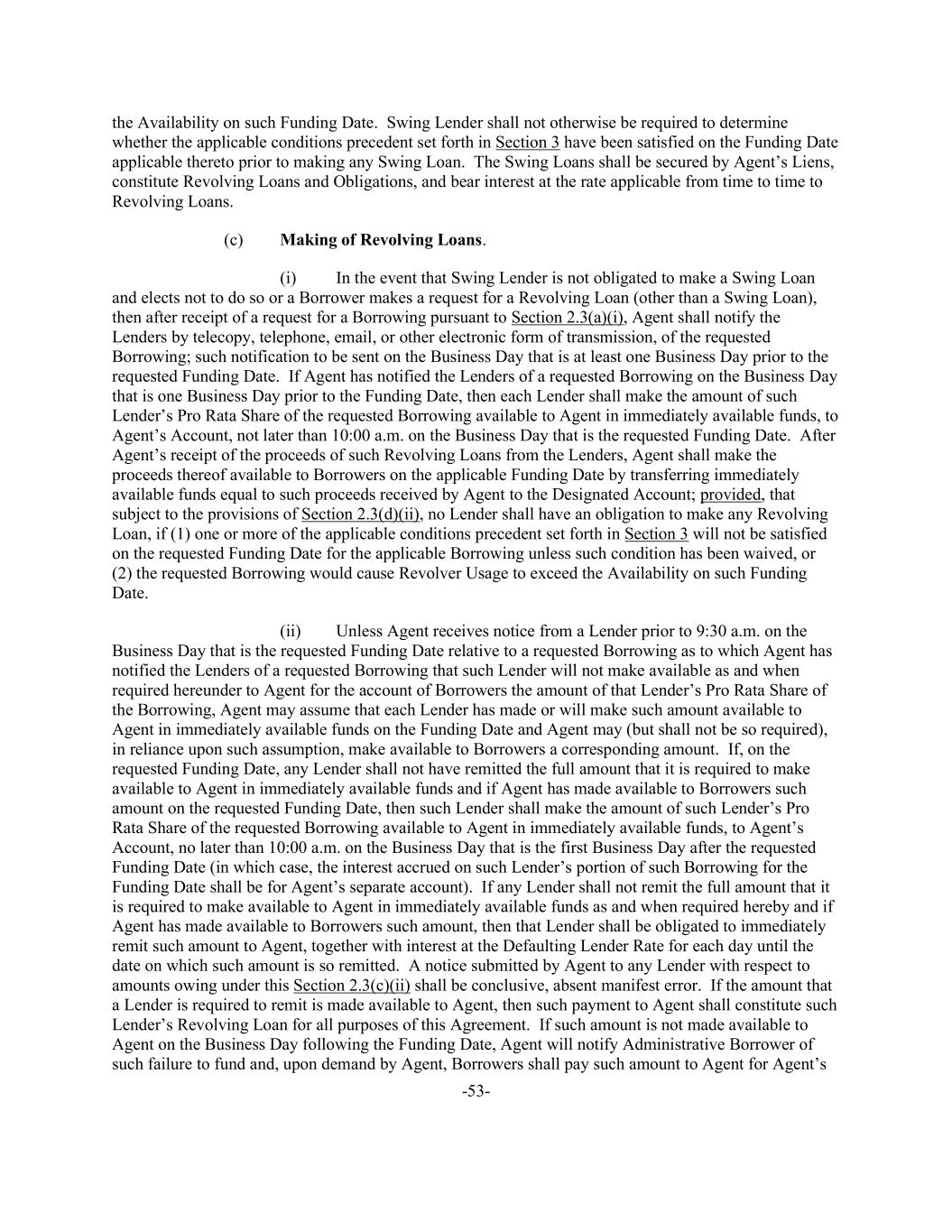 -53- the Availability on such Funding Date. Swing Lender shall not otherwise be required to determine whether the applicable conditions precedent set forth in Section 3 have been satisfied on the Funding Date applicable thereto prior to making any Swing Loan. The Swing Loans shall be secured by Agent’s Liens, constitute Revolving Loans and Obligations, and bear interest at the rate applicable from time to time to Revolving Loans. (c) Making of Revolving Loans. (i) In the event that Swing Lender is not obligated to make a Swing Loan and elects not to do so or a Borrower makes a request for a Revolving Loan (other than a Swing Loan), then after receipt of a request for a Borrowing pursuant to Section 2.3(a)(i), Agent shall notify the Lenders by telecopy, telephone, email, or other electronic form of transmission, of the requested Borrowing; such notification to be sent on the Business Day that is at least one Business Day prior to the requested Funding Date. If Agent has notified the Lenders of a requested Borrowing on the Business Day that is one Business Day prior to the Funding Date, then each Lender shall make the amount of such Lender’s Pro Rata Share of the requested Borrowing available to Agent in immediately available funds, to Agent’s Account, not later than 10:00 a.m. on the Business Day that is the requested Funding Date. After Agent’s receipt of the proceeds of such Revolving Loans from the Lenders, Agent shall make the proceeds thereof available to Borrowers on the applicable Funding Date by transferring immediately available funds equal to such proceeds received by Agent to the Designated Account; provided, that subject to the provisions of Section 2.3(d)(ii), no Lender shall have an obligation to make any Revolving Loan, if (1) one or more of the applicable conditions precedent set forth in Section 3 will not be satisfied on the requested Funding Date for the applicable Borrowing unless such condition has been waived, or (2) the requested Borrowing would cause Revolver Usage to exceed the Availability on such Funding Date. (ii) Unless Agent receives notice from a Lender prior to 9:30 a.m. on the Business Day that is the requested Funding Date relative to a requested Borrowing as to which Agent has notified the Lenders of a requested Borrowing that such Lender will not make available as and when required hereunder to Agent for the account of Borrowers the amount of that Lender’s Pro Rata Share of the Borrowing, Agent may assume that each Lender has made or will make such amount available to Agent in immediately available funds on the Funding Date and Agent may (but shall not be so required), in reliance upon such assumption, make available to Borrowers a corresponding amount. If, on the requested Funding Date, any Lender shall not have remitted the full amount that it is required to make available to Agent in immediately available funds and if Agent has made available to Borrowers such amount on the requested Funding Date, then such Lender shall make the amount of such Lender’s Pro Rata Share of the requested Borrowing available to Agent in immediately available funds, to Agent’s Account, no later than 10:00 a.m. on the Business Day that is the first Business Day after the requested Funding Date (in which case, the interest accrued on such Lender’s portion of such Borrowing for the Funding Date shall be for Agent’s separate account). If any Lender shall not remit the full amount that it is required to make available to Agent in immediately available funds as and when required hereby and if Agent has made available to Borrowers such amount, then that Lender shall be obligated to immediately remit such amount to Agent, together with interest at the Defaulting Lender Rate for each day until the date on which such amount is so remitted. A notice submitted by Agent to any Lender with respect to amounts owing under this Section 2.3(c)(ii) shall be conclusive, absent manifest error. If the amount that a Lender is required to remit is made available to Agent, then such payment to Agent shall constitute such Lender’s Revolving Loan for all purposes of this Agreement. If such amount is not made available to Agent on the Business Day following the Funding Date, Agent will notify Administrative Borrower of such failure to fund and, upon demand by Agent, Borrowers shall pay such amount to Agent for Agent’s