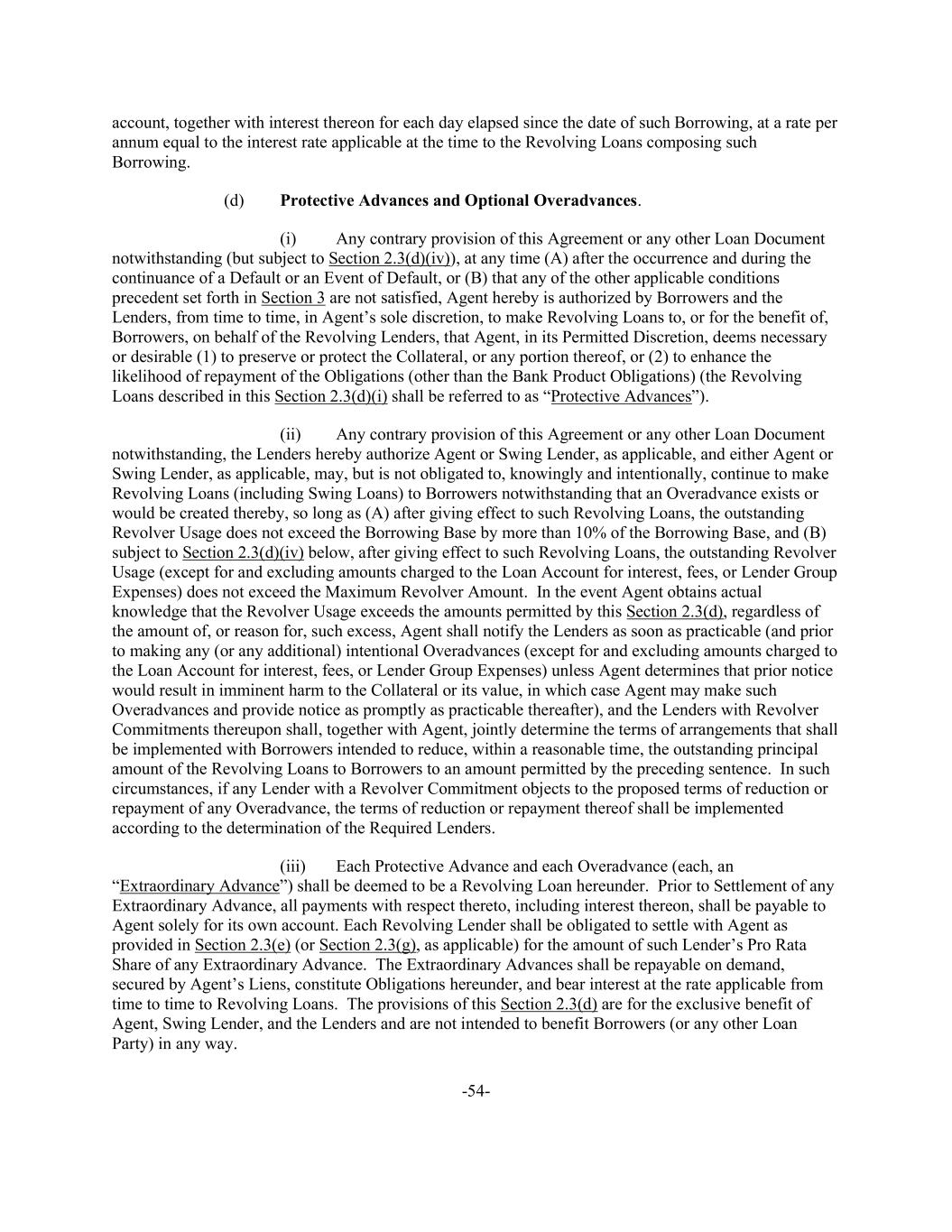 -54- account, together with interest thereon for each day elapsed since the date of such Borrowing, at a rate per annum equal to the interest rate applicable at the time to the Revolving Loans composing such Borrowing. (d) Protective Advances and Optional Overadvances. (i) Any contrary provision of this Agreement or any other Loan Document notwithstanding (but subject to Section 2.3(d)(iv)), at any time (A) after the occurrence and during the continuance of a Default or an Event of Default, or (B) that any of the other applicable conditions precedent set forth in Section 3 are not satisfied, Agent hereby is authorized by Borrowers and the Lenders, from time to time, in Agent’s sole discretion, to make Revolving Loans to, or for the benefit of, Borrowers, on behalf of the Revolving Lenders, that Agent, in its Permitted Discretion, deems necessary or desirable (1) to preserve or protect the Collateral, or any portion thereof, or (2) to enhance the likelihood of repayment of the Obligations (other than the Bank Product Obligations) (the Revolving Loans described in this Section 2.3(d)(i) shall be referred to as “Protective Advances”). (ii) Any contrary provision of this Agreement or any other Loan Document notwithstanding, the Lenders hereby authorize Agent or Swing Lender, as applicable, and either Agent or Swing Lender, as applicable, may, but is not obligated to, knowingly and intentionally, continue to make Revolving Loans (including Swing Loans) to Borrowers notwithstanding that an Overadvance exists or would be created thereby, so long as (A) after giving effect to such Revolving Loans, the outstanding Revolver Usage does not exceed the Borrowing Base by more than 10% of the Borrowing Base, and (B) subject to Section 2.3(d)(iv) below, after giving effect to such Revolving Loans, the outstanding Revolver Usage (except for and excluding amounts charged to the Loan Account for interest, fees, or Lender Group Expenses) does not exceed the Maximum Revolver Amount. In the event Agent obtains actual knowledge that the Revolver Usage exceeds the amounts permitted by this Section 2.3(d), regardless of the amount of, or reason for, such excess, Agent shall notify the Lenders as soon as practicable (and prior to making any (or any additional) intentional Overadvances (except for and excluding amounts charged to the Loan Account for interest, fees, or Lender Group Expenses) unless Agent determines that prior notice would result in imminent harm to the Collateral or its value, in which case Agent may make such Overadvances and provide notice as promptly as practicable thereafter), and the Lenders with Revolver Commitments thereupon shall, together with Agent, jointly determine the terms of arrangements that shall be implemented with Borrowers intended to reduce, within a reasonable time, the outstanding principal amount of the Revolving Loans to Borrowers to an amount permitted by the preceding sentence. In such circumstances, if any Lender with a Revolver Commitment objects to the proposed terms of reduction or repayment of any Overadvance, the terms of reduction or repayment thereof shall be implemented according to the determination of the Required Lenders. (iii) Each Protective Advance and each Overadvance (each, an “Extraordinary Advance”) shall be deemed to be a Revolving Loan hereunder. Prior to Settlement of any Extraordinary Advance, all payments with respect thereto, including interest thereon, shall be payable to Agent solely for its own account. Each Revolving Lender shall be obligated to settle with Agent as provided in Section 2.3(e) (or Section 2.3(g), as applicable) for the amount of such Lender’s Pro Rata Share of any Extraordinary Advance. The Extraordinary Advances shall be repayable on demand, secured by Agent’s Liens, constitute Obligations hereunder, and bear interest at the rate applicable from time to time to Revolving Loans. The provisions of this Section 2.3(d) are for the exclusive benefit of Agent, Swing Lender, and the Lenders and are not intended to benefit Borrowers (or any other Loan Party) in any way.