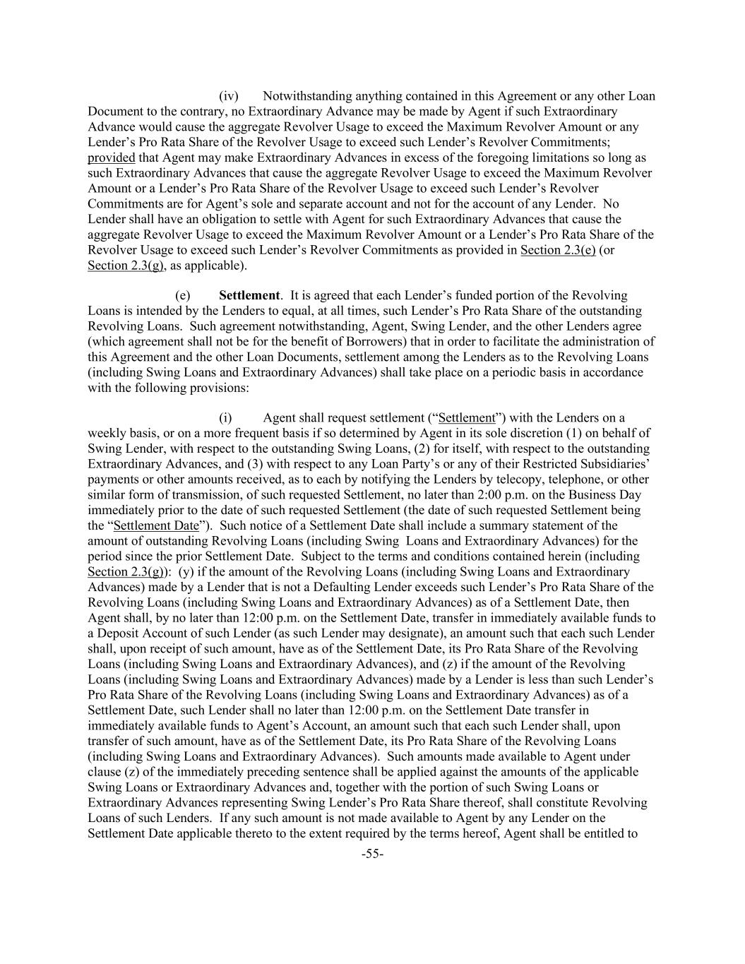 -55- (iv) Notwithstanding anything contained in this Agreement or any other Loan Document to the contrary, no Extraordinary Advance may be made by Agent if such Extraordinary Advance would cause the aggregate Revolver Usage to exceed the Maximum Revolver Amount or any Lender’s Pro Rata Share of the Revolver Usage to exceed such Lender’s Revolver Commitments; provided that Agent may make Extraordinary Advances in excess of the foregoing limitations so long as such Extraordinary Advances that cause the aggregate Revolver Usage to exceed the Maximum Revolver Amount or a Lender’s Pro Rata Share of the Revolver Usage to exceed such Lender’s Revolver Commitments are for Agent’s sole and separate account and not for the account of any Lender. No Lender shall have an obligation to settle with Agent for such Extraordinary Advances that cause the aggregate Revolver Usage to exceed the Maximum Revolver Amount or a Lender’s Pro Rata Share of the Revolver Usage to exceed such Lender’s Revolver Commitments as provided in Section 2.3(e) (or Section 2.3(g), as applicable). (e) Settlement. It is agreed that each Lender’s funded portion of the Revolving Loans is intended by the Lenders to equal, at all times, such Lender’s Pro Rata Share of the outstanding Revolving Loans. Such agreement notwithstanding, Agent, Swing Lender, and the other Lenders agree (which agreement shall not be for the benefit of Borrowers) that in order to facilitate the administration of this Agreement and the other Loan Documents, settlement among the Lenders as to the Revolving Loans (including Swing Loans and Extraordinary Advances) shall take place on a periodic basis in accordance with the following provisions: (i) Agent shall request settlement (“Settlement”) with the Lenders on a weekly basis, or on a more frequent basis if so determined by Agent in its sole discretion (1) on behalf of Swing Lender, with respect to the outstanding Swing Loans, (2) for itself, with respect to the outstanding Extraordinary Advances, and (3) with respect to any Loan Party’s or any of their Restricted Subsidiaries’ payments or other amounts received, as to each by notifying the Lenders by telecopy, telephone, or other similar form of transmission, of such requested Settlement, no later than 2:00 p.m. on the Business Day immediately prior to the date of such requested Settlement (the date of such requested Settlement being the “Settlement Date”). Such notice of a Settlement Date shall include a summary statement of the amount of outstanding Revolving Loans (including Swing Loans and Extraordinary Advances) for the period since the prior Settlement Date. Subject to the terms and conditions contained herein (including Section 2.3(g)): (y) if the amount of the Revolving Loans (including Swing Loans and Extraordinary Advances) made by a Lender that is not a Defaulting Lender exceeds such Lender’s Pro Rata Share of the Revolving Loans (including Swing Loans and Extraordinary Advances) as of a Settlement Date, then Agent shall, by no later than 12:00 p.m. on the Settlement Date, transfer in immediately available funds to a Deposit Account of such Lender (as such Lender may designate), an amount such that each such Lender shall, upon receipt of such amount, have as of the Settlement Date, its Pro Rata Share of the Revolving Loans (including Swing Loans and Extraordinary Advances), and (z) if the amount of the Revolving Loans (including Swing Loans and Extraordinary Advances) made by a Lender is less than such Lender’s Pro Rata Share of the Revolving Loans (including Swing Loans and Extraordinary Advances) as of a Settlement Date, such Lender shall no later than 12:00 p.m. on the Settlement Date transfer in immediately available funds to Agent’s Account, an amount such that each such Lender shall, upon transfer of such amount, have as of the Settlement Date, its Pro Rata Share of the Revolving Loans (including Swing Loans and Extraordinary Advances). Such amounts made available to Agent under clause (z) of the immediately preceding sentence shall be applied against the amounts of the applicable Swing Loans or Extraordinary Advances and, together with the portion of such Swing Loans or Extraordinary Advances representing Swing Lender’s Pro Rata Share thereof, shall constitute Revolving Loans of such Lenders. If any such amount is not made available to Agent by any Lender on the Settlement Date applicable thereto to the extent required by the terms hereof, Agent shall be entitled to