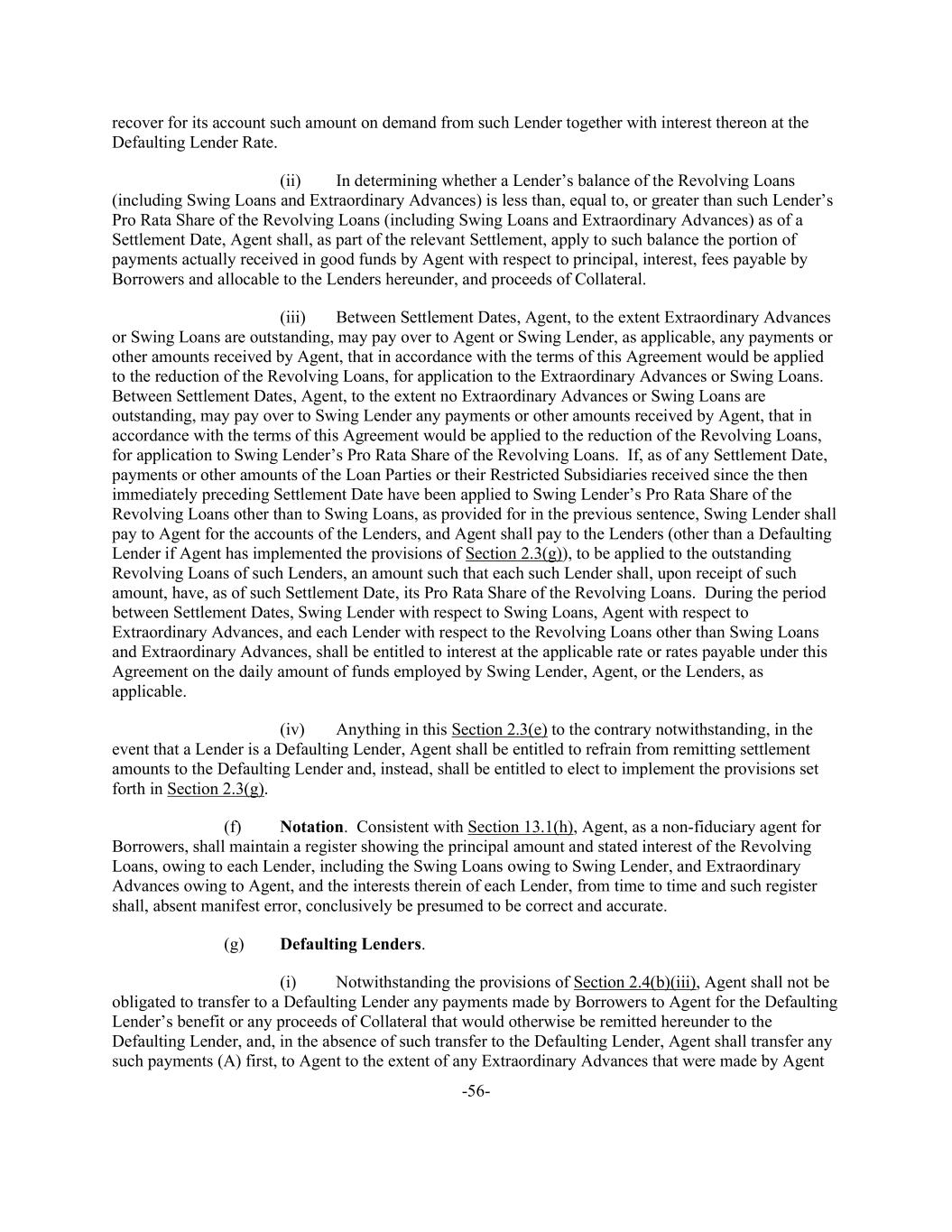-56- recover for its account such amount on demand from such Lender together with interest thereon at the Defaulting Lender Rate. (ii) In determining whether a Lender’s balance of the Revolving Loans (including Swing Loans and Extraordinary Advances) is less than, equal to, or greater than such Lender’s Pro Rata Share of the Revolving Loans (including Swing Loans and Extraordinary Advances) as of a Settlement Date, Agent shall, as part of the relevant Settlement, apply to such balance the portion of payments actually received in good funds by Agent with respect to principal, interest, fees payable by Borrowers and allocable to the Lenders hereunder, and proceeds of Collateral. (iii) Between Settlement Dates, Agent, to the extent Extraordinary Advances or Swing Loans are outstanding, may pay over to Agent or Swing Lender, as applicable, any payments or other amounts received by Agent, that in accordance with the terms of this Agreement would be applied to the reduction of the Revolving Loans, for application to the Extraordinary Advances or Swing Loans. Between Settlement Dates, Agent, to the extent no Extraordinary Advances or Swing Loans are outstanding, may pay over to Swing Lender any payments or other amounts received by Agent, that in accordance with the terms of this Agreement would be applied to the reduction of the Revolving Loans, for application to Swing Lender’s Pro Rata Share of the Revolving Loans. If, as of any Settlement Date, payments or other amounts of the Loan Parties or their Restricted Subsidiaries received since the then immediately preceding Settlement Date have been applied to Swing Lender’s Pro Rata Share of the Revolving Loans other than to Swing Loans, as provided for in the previous sentence, Swing Lender shall pay to Agent for the accounts of the Lenders, and Agent shall pay to the Lenders (other than a Defaulting Lender if Agent has implemented the provisions of Section 2.3(g)), to be applied to the outstanding Revolving Loans of such Lenders, an amount such that each such Lender shall, upon receipt of such amount, have, as of such Settlement Date, its Pro Rata Share of the Revolving Loans. During the period between Settlement Dates, Swing Lender with respect to Swing Loans, Agent with respect to Extraordinary Advances, and each Lender with respect to the Revolving Loans other than Swing Loans and Extraordinary Advances, shall be entitled to interest at the applicable rate or rates payable under this Agreement on the daily amount of funds employed by Swing Lender, Agent, or the Lenders, as applicable. (iv) Anything in this Section 2.3(e) to the contrary notwithstanding, in the event that a Lender is a Defaulting Lender, Agent shall be entitled to refrain from remitting settlement amounts to the Defaulting Lender and, instead, shall be entitled to elect to implement the provisions set forth in Section 2.3(g). (f) Notation. Consistent with Section 13.1(h), Agent, as a non-fiduciary agent for Borrowers, shall maintain a register showing the principal amount and stated interest of the Revolving Loans, owing to each Lender, including the Swing Loans owing to Swing Lender, and Extraordinary Advances owing to Agent, and the interests therein of each Lender, from time to time and such register shall, absent manifest error, conclusively be presumed to be correct and accurate. (g) Defaulting Lenders. (i) Notwithstanding the provisions of Section 2.4(b)(iii), Agent shall not be obligated to transfer to a Defaulting Lender any payments made by Borrowers to Agent for the Defaulting Lender’s benefit or any proceeds of Collateral that would otherwise be remitted hereunder to the Defaulting Lender, and, in the absence of such transfer to the Defaulting Lender, Agent shall transfer any such payments (A) first, to Agent to the extent of any Extraordinary Advances that were made by Agent