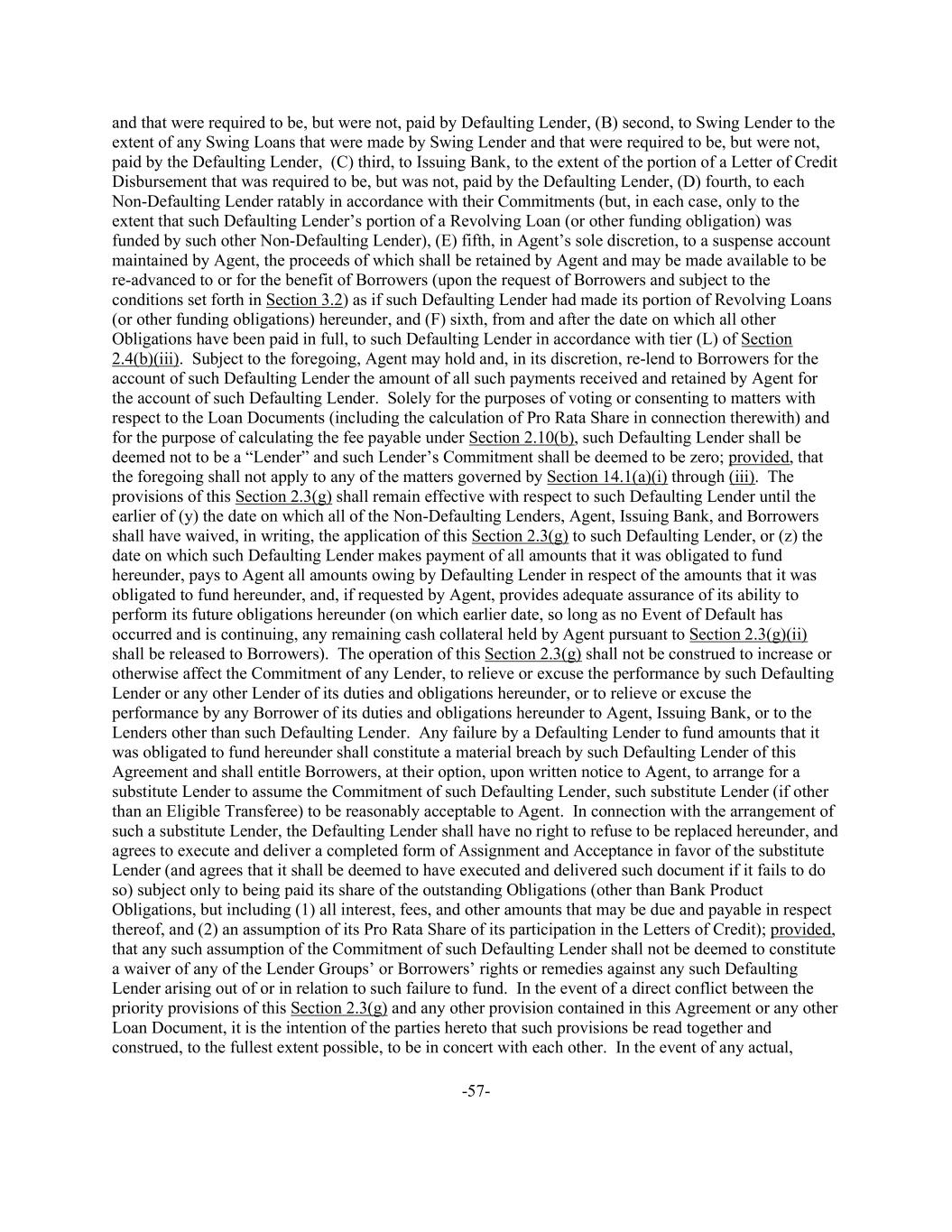 -57- and that were required to be, but were not, paid by Defaulting Lender, (B) second, to Swing Lender to the extent of any Swing Loans that were made by Swing Lender and that were required to be, but were not, paid by the Defaulting Lender, (C) third, to Issuing Bank, to the extent of the portion of a Letter of Credit Disbursement that was required to be, but was not, paid by the Defaulting Lender, (D) fourth, to each Non-Defaulting Lender ratably in accordance with their Commitments (but, in each case, only to the extent that such Defaulting Lender’s portion of a Revolving Loan (or other funding obligation) was funded by such other Non-Defaulting Lender), (E) fifth, in Agent’s sole discretion, to a suspense account maintained by Agent, the proceeds of which shall be retained by Agent and may be made available to be re-advanced to or for the benefit of Borrowers (upon the request of Borrowers and subject to the conditions set forth in Section 3.2) as if such Defaulting Lender had made its portion of Revolving Loans (or other funding obligations) hereunder, and (F) sixth, from and after the date on which all other Obligations have been paid in full, to such Defaulting Lender in accordance with tier (L) of Section 2.4(b)(iii). Subject to the foregoing, Agent may hold and, in its discretion, re-lend to Borrowers for the account of such Defaulting Lender the amount of all such payments received and retained by Agent for the account of such Defaulting Lender. Solely for the purposes of voting or consenting to matters with respect to the Loan Documents (including the calculation of Pro Rata Share in connection therewith) and for the purpose of calculating the fee payable under Section 2.10(b), such Defaulting Lender shall be deemed not to be a “Lender” and such Lender’s Commitment shall be deemed to be zero; provided, that the foregoing shall not apply to any of the matters governed by Section 14.1(a)(i) through (iii). The provisions of this Section 2.3(g) shall remain effective with respect to such Defaulting Lender until the earlier of (y) the date on which all of the Non-Defaulting Lenders, Agent, Issuing Bank, and Borrowers shall have waived, in writing, the application of this Section 2.3(g) to such Defaulting Lender, or (z) the date on which such Defaulting Lender makes payment of all amounts that it was obligated to fund hereunder, pays to Agent all amounts owing by Defaulting Lender in respect of the amounts that it was obligated to fund hereunder, and, if requested by Agent, provides adequate assurance of its ability to perform its future obligations hereunder (on which earlier date, so long as no Event of Default has occurred and is continuing, any remaining cash collateral held by Agent pursuant to Section 2.3(g)(ii) shall be released to Borrowers). The operation of this Section 2.3(g) shall not be construed to increase or otherwise affect the Commitment of any Lender, to relieve or excuse the performance by such Defaulting Lender or any other Lender of its duties and obligations hereunder, or to relieve or excuse the performance by any Borrower of its duties and obligations hereunder to Agent, Issuing Bank, or to the Lenders other than such Defaulting Lender. Any failure by a Defaulting Lender to fund amounts that it was obligated to fund hereunder shall constitute a material breach by such Defaulting Lender of this Agreement and shall entitle Borrowers, at their option, upon written notice to Agent, to arrange for a substitute Lender to assume the Commitment of such Defaulting Lender, such substitute Lender (if other than an Eligible Transferee) to be reasonably acceptable to Agent. In connection with the arrangement of such a substitute Lender, the Defaulting Lender shall have no right to refuse to be replaced hereunder, and agrees to execute and deliver a completed form of Assignment and Acceptance in favor of the substitute Lender (and agrees that it shall be deemed to have executed and delivered such document if it fails to do so) subject only to being paid its share of the outstanding Obligations (other than Bank Product Obligations, but including (1) all interest, fees, and other amounts that may be due and payable in respect thereof, and (2) an assumption of its Pro Rata Share of its participation in the Letters of Credit); provided, that any such assumption of the Commitment of such Defaulting Lender shall not be deemed to constitute a waiver of any of the Lender Groups’ or Borrowers’ rights or remedies against any such Defaulting Lender arising out of or in relation to such failure to fund. In the event of a direct conflict between the priority provisions of this Section 2.3(g) and any other provision contained in this Agreement or any other Loan Document, it is the intention of the parties hereto that such provisions be read together and construed, to the fullest extent possible, to be in concert with each other. In the event of any actual,