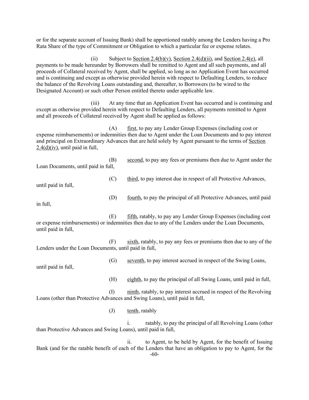 -60- or for the separate account of Issuing Bank) shall be apportioned ratably among the Lenders having a Pro Rata Share of the type of Commitment or Obligation to which a particular fee or expense relates. (ii) Subject to Section 2.4(b)(v), Section 2.4(d)(ii), and Section 2.4(e), all payments to be made hereunder by Borrowers shall be remitted to Agent and all such payments, and all proceeds of Collateral received by Agent, shall be applied, so long as no Application Event has occurred and is continuing and except as otherwise provided herein with respect to Defaulting Lenders, to reduce the balance of the Revolving Loans outstanding and, thereafter, to Borrowers (to be wired to the Designated Account) or such other Person entitled thereto under applicable law. (iii) At any time that an Application Event has occurred and is continuing and except as otherwise provided herein with respect to Defaulting Lenders, all payments remitted to Agent and all proceeds of Collateral received by Agent shall be applied as follows: (A) first, to pay any Lender Group Expenses (including cost or expense reimbursements) or indemnities then due to Agent under the Loan Documents and to pay interest and principal on Extraordinary Advances that are held solely by Agent pursuant to the terms of Section 2.4(d)(iv), until paid in full, (B) second, to pay any fees or premiums then due to Agent under the Loan Documents, until paid in full, (C) third, to pay interest due in respect of all Protective Advances, until paid in full, (D) fourth, to pay the principal of all Protective Advances, until paid in full, (E) fifth, ratably, to pay any Lender Group Expenses (including cost or expense reimbursements) or indemnities then due to any of the Lenders under the Loan Documents, until paid in full, (F) sixth, ratably, to pay any fees or premiums then due to any of the Lenders under the Loan Documents, until paid in full, (G) seventh, to pay interest accrued in respect of the Swing Loans, until paid in full, (H) eighth, to pay the principal of all Swing Loans, until paid in full, (I) ninth, ratably, to pay interest accrued in respect of the Revolving Loans (other than Protective Advances and Swing Loans), until paid in full, (J) tenth, ratably i. ratably, to pay the principal of all Revolving Loans (other than Protective Advances and Swing Loans), until paid in full, ii. to Agent, to be held by Agent, for the benefit of Issuing Bank (and for the ratable benefit of each of the Lenders that have an obligation to pay to Agent, for the