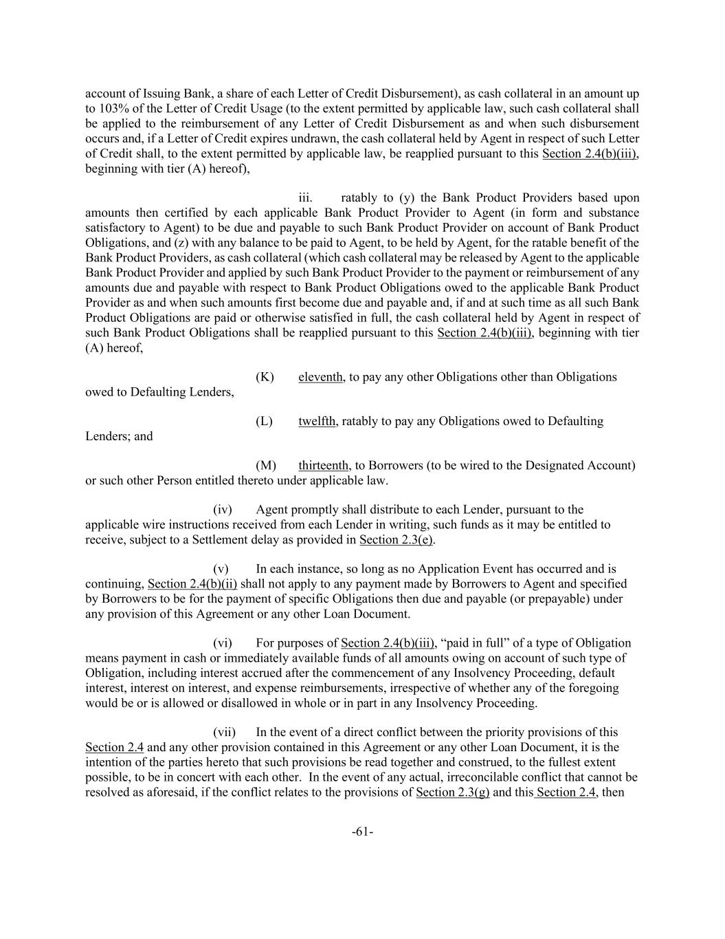 -61- account of Issuing Bank, a share of each Letter of Credit Disbursement), as cash collateral in an amount up to 103% of the Letter of Credit Usage (to the extent permitted by applicable law, such cash collateral shall be applied to the reimbursement of any Letter of Credit Disbursement as and when such disbursement occurs and, if a Letter of Credit expires undrawn, the cash collateral held by Agent in respect of such Letter of Credit shall, to the extent permitted by applicable law, be reapplied pursuant to this Section 2.4(b)(iii), beginning with tier (A) hereof), iii. ratably to (y) the Bank Product Providers based upon amounts then certified by each applicable Bank Product Provider to Agent (in form and substance satisfactory to Agent) to be due and payable to such Bank Product Provider on account of Bank Product Obligations, and (z) with any balance to be paid to Agent, to be held by Agent, for the ratable benefit of the Bank Product Providers, as cash collateral (which cash collateral may be released by Agent to the applicable Bank Product Provider and applied by such Bank Product Provider to the payment or reimbursement of any amounts due and payable with respect to Bank Product Obligations owed to the applicable Bank Product Provider as and when such amounts first become due and payable and, if and at such time as all such Bank Product Obligations are paid or otherwise satisfied in full, the cash collateral held by Agent in respect of such Bank Product Obligations shall be reapplied pursuant to this Section 2.4(b)(iii), beginning with tier (A) hereof, (K) eleventh, to pay any other Obligations other than Obligations owed to Defaulting Lenders, (L) twelfth, ratably to pay any Obligations owed to Defaulting Lenders; and (M) thirteenth, to Borrowers (to be wired to the Designated Account) or such other Person entitled thereto under applicable law. (iv) Agent promptly shall distribute to each Lender, pursuant to the applicable wire instructions received from each Lender in writing, such funds as it may be entitled to receive, subject to a Settlement delay as provided in Section 2.3(e). (v) In each instance, so long as no Application Event has occurred and is continuing, Section 2.4(b)(ii) shall not apply to any payment made by Borrowers to Agent and specified by Borrowers to be for the payment of specific Obligations then due and payable (or prepayable) under any provision of this Agreement or any other Loan Document. (vi) For purposes of Section 2.4(b)(iii), “paid in full” of a type of Obligation means payment in cash or immediately available funds of all amounts owing on account of such type of Obligation, including interest accrued after the commencement of any Insolvency Proceeding, default interest, interest on interest, and expense reimbursements, irrespective of whether any of the foregoing would be or is allowed or disallowed in whole or in part in any Insolvency Proceeding. (vii) In the event of a direct conflict between the priority provisions of this Section 2.4 and any other provision contained in this Agreement or any other Loan Document, it is the intention of the parties hereto that such provisions be read together and construed, to the fullest extent possible, to be in concert with each other. In the event of any actual, irreconcilable conflict that cannot be resolved as aforesaid, if the conflict relates to the provisions of Section 2.3(g) and this Section 2.4, then
