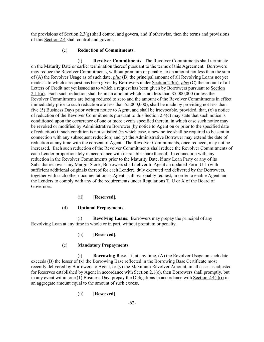 -62- the provisions of Section 2.3(g) shall control and govern, and if otherwise, then the terms and provisions of this Section 2.4 shall control and govern. (c) Reduction of Commitments. (i) Revolver Commitments. The Revolver Commitments shall terminate on the Maturity Date or earlier termination thereof pursuant to the terms of this Agreement. Borrowers may reduce the Revolver Commitments, without premium or penalty, to an amount not less than the sum of (A) the Revolver Usage as of such date, plus (B) the principal amount of all Revolving Loans not yet made as to which a request has been given by Borrowers under Section 2.3(a), plus (C) the amount of all Letters of Credit not yet issued as to which a request has been given by Borrowers pursuant to Section 2.11(a). Each such reduction shall be in an amount which is not less than $5,000,000 (unless the Revolver Commitments are being reduced to zero and the amount of the Revolver Commitments in effect immediately prior to such reduction are less than $5,000,000), shall be made by providing not less than five (5) Business Days prior written notice to Agent, and shall be irrevocable, provided, that, (x) a notice of reduction of the Revolver Commitments pursuant to this Section 2.4(c) may state that such notice is conditioned upon the occurrence of one or more events specified therein, in which case such notice may be revoked or modified by Administrative Borrower (by notice to Agent on or prior to the specified date of reduction) if such condition is not satisfied (in which case, a new notice shall be required to be sent in connection with any subsequent reduction) and (y) the Administrative Borrower may extend the date of reduction at any time with the consent of Agent. The Revolver Commitments, once reduced, may not be increased. Each such reduction of the Revolver Commitments shall reduce the Revolver Commitments of each Lender proportionately in accordance with its ratable share thereof. In connection with any reduction in the Revolver Commitments prior to the Maturity Date, if any Loan Party or any of its Subsidiaries owns any Margin Stock, Borrowers shall deliver to Agent an updated Form U-1 (with sufficient additional originals thereof for each Lender), duly executed and delivered by the Borrowers, together with such other documentation as Agent shall reasonably request, in order to enable Agent and the Lenders to comply with any of the requirements under Regulations T, U or X of the Board of Governors. (ii) [Reserved]. (d) Optional Prepayments. (i) Revolving Loans. Borrowers may prepay the principal of any Revolving Loan at any time in whole or in part, without premium or penalty. (ii) [Reserved]. (e) Mandatory Prepayments. (i) Borrowing Base. If, at any time, (A) the Revolver Usage on such date exceeds (B) the lesser of (x) the Borrowing Base reflected in the Borrowing Base Certificate most recently delivered by Borrowers to Agent, or (y) the Maximum Revolver Amount, in all cases as adjusted for Reserves established by Agent in accordance with Section 2.1(c), then Borrowers shall promptly, but in any event within one (1) Business Day, prepay the Obligations in accordance with Section 2.4(f)(i) in an aggregate amount equal to the amount of such excess. (ii) [Reserved].