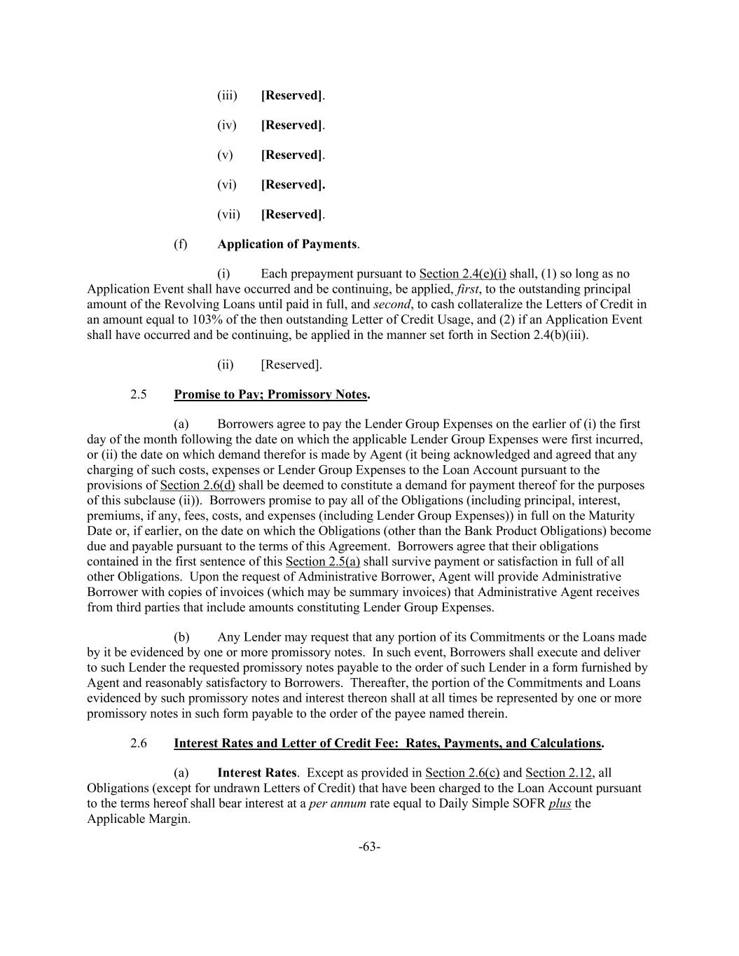 -63- (iii) [Reserved]. (iv) [Reserved]. (v) [Reserved]. (vi) [Reserved]. (vii) [Reserved]. (f) Application of Payments. (i) Each prepayment pursuant to Section 2.4(e)(i) shall, (1) so long as no Application Event shall have occurred and be continuing, be applied, first, to the outstanding principal amount of the Revolving Loans until paid in full, and second, to cash collateralize the Letters of Credit in an amount equal to 103% of the then outstanding Letter of Credit Usage, and (2) if an Application Event shall have occurred and be continuing, be applied in the manner set forth in Section 2.4(b)(iii). (ii) [Reserved]. 2.5 Promise to Pay; Promissory Notes. (a) Borrowers agree to pay the Lender Group Expenses on the earlier of (i) the first day of the month following the date on which the applicable Lender Group Expenses were first incurred, or (ii) the date on which demand therefor is made by Agent (it being acknowledged and agreed that any charging of such costs, expenses or Lender Group Expenses to the Loan Account pursuant to the provisions of Section 2.6(d) shall be deemed to constitute a demand for payment thereof for the purposes of this subclause (ii)). Borrowers promise to pay all of the Obligations (including principal, interest, premiums, if any, fees, costs, and expenses (including Lender Group Expenses)) in full on the Maturity Date or, if earlier, on the date on which the Obligations (other than the Bank Product Obligations) become due and payable pursuant to the terms of this Agreement. Borrowers agree that their obligations contained in the first sentence of this Section 2.5(a) shall survive payment or satisfaction in full of all other Obligations. Upon the request of Administrative Borrower, Agent will provide Administrative Borrower with copies of invoices (which may be summary invoices) that Administrative Agent receives from third parties that include amounts constituting Lender Group Expenses. (b) Any Lender may request that any portion of its Commitments or the Loans made by it be evidenced by one or more promissory notes. In such event, Borrowers shall execute and deliver to such Lender the requested promissory notes payable to the order of such Lender in a form furnished by Agent and reasonably satisfactory to Borrowers. Thereafter, the portion of the Commitments and Loans evidenced by such promissory notes and interest thereon shall at all times be represented by one or more promissory notes in such form payable to the order of the payee named therein. 2.6 Interest Rates and Letter of Credit Fee: Rates, Payments, and Calculations. (a) Interest Rates. Except as provided in Section 2.6(c) and Section 2.12, all Obligations (except for undrawn Letters of Credit) that have been charged to the Loan Account pursuant to the terms hereof shall bear interest at a per annum rate equal to Daily Simple SOFR plus the Applicable Margin.