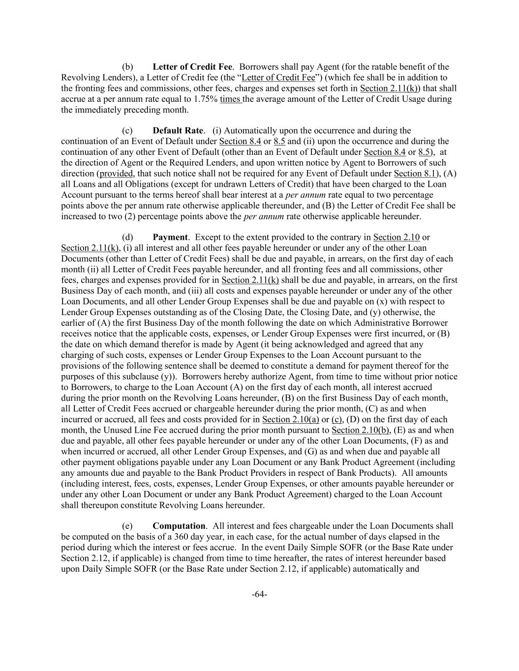 -64- (b) Letter of Credit Fee. Borrowers shall pay Agent (for the ratable benefit of the Revolving Lenders), a Letter of Credit fee (the “Letter of Credit Fee”) (which fee shall be in addition to the fronting fees and commissions, other fees, charges and expenses set forth in Section 2.11(k)) that shall accrue at a per annum rate equal to 1.75% times the average amount of the Letter of Credit Usage during the immediately preceding month. (c) Default Rate. (i) Automatically upon the occurrence and during the continuation of an Event of Default under Section 8.4 or 8.5 and (ii) upon the occurrence and during the continuation of any other Event of Default (other than an Event of Default under Section 8.4 or 8.5), at the direction of Agent or the Required Lenders, and upon written notice by Agent to Borrowers of such direction (provided, that such notice shall not be required for any Event of Default under Section 8.1), (A) all Loans and all Obligations (except for undrawn Letters of Credit) that have been charged to the Loan Account pursuant to the terms hereof shall bear interest at a per annum rate equal to two percentage points above the per annum rate otherwise applicable thereunder, and (B) the Letter of Credit Fee shall be increased to two (2) percentage points above the per annum rate otherwise applicable hereunder. (d) Payment. Except to the extent provided to the contrary in Section 2.10 or Section 2.11(k), (i) all interest and all other fees payable hereunder or under any of the other Loan Documents (other than Letter of Credit Fees) shall be due and payable, in arrears, on the first day of each month (ii) all Letter of Credit Fees payable hereunder, and all fronting fees and all commissions, other fees, charges and expenses provided for in Section 2.11(k) shall be due and payable, in arrears, on the first Business Day of each month, and (iii) all costs and expenses payable hereunder or under any of the other Loan Documents, and all other Lender Group Expenses shall be due and payable on (x) with respect to Lender Group Expenses outstanding as of the Closing Date, the Closing Date, and (y) otherwise, the earlier of (A) the first Business Day of the month following the date on which Administrative Borrower receives notice that the applicable costs, expenses, or Lender Group Expenses were first incurred, or (B) the date on which demand therefor is made by Agent (it being acknowledged and agreed that any charging of such costs, expenses or Lender Group Expenses to the Loan Account pursuant to the provisions of the following sentence shall be deemed to constitute a demand for payment thereof for the purposes of this subclause (y)). Borrowers hereby authorize Agent, from time to time without prior notice to Borrowers, to charge to the Loan Account (A) on the first day of each month, all interest accrued during the prior month on the Revolving Loans hereunder, (B) on the first Business Day of each month, all Letter of Credit Fees accrued or chargeable hereunder during the prior month, (C) as and when incurred or accrued, all fees and costs provided for in Section 2.10(a) or (c), (D) on the first day of each month, the Unused Line Fee accrued during the prior month pursuant to Section 2.10(b), (E) as and when due and payable, all other fees payable hereunder or under any of the other Loan Documents, (F) as and when incurred or accrued, all other Lender Group Expenses, and (G) as and when due and payable all other payment obligations payable under any Loan Document or any Bank Product Agreement (including any amounts due and payable to the Bank Product Providers in respect of Bank Products). All amounts (including interest, fees, costs, expenses, Lender Group Expenses, or other amounts payable hereunder or under any other Loan Document or under any Bank Product Agreement) charged to the Loan Account shall thereupon constitute Revolving Loans hereunder. (e) Computation. All interest and fees chargeable under the Loan Documents shall be computed on the basis of a 360 day year, in each case, for the actual number of days elapsed in the period during which the interest or fees accrue. In the event Daily Simple SOFR (or the Base Rate under Section 2.12, if applicable) is changed from time to time hereafter, the rates of interest hereunder based upon Daily Simple SOFR (or the Base Rate under Section 2.12, if applicable) automatically and