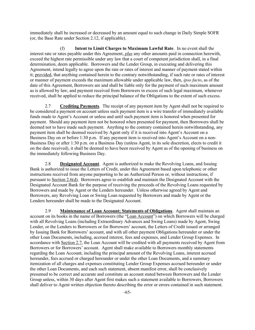 -65- immediately shall be increased or decreased by an amount equal to such change in Daily Simple SOFR (or, the Base Rate under Section 2.12, if applicable). (f) Intent to Limit Charges to Maximum Lawful Rate. In no event shall the interest rate or rates payable under this Agreement, plus any other amounts paid in connection herewith, exceed the highest rate permissible under any law that a court of competent jurisdiction shall, in a final determination, deem applicable. Borrowers and the Lender Group, in executing and delivering this Agreement, intend legally to agree upon the rate or rates of interest and manner of payment stated within it; provided, that anything contained herein to the contrary notwithstanding, if such rate or rates of interest or manner of payment exceeds the maximum allowable under applicable law, then, ipso facto, as of the date of this Agreement, Borrowers are and shall be liable only for the payment of such maximum amount as is allowed by law, and payment received from Borrowers in excess of such legal maximum, whenever received, shall be applied to reduce the principal balance of the Obligations to the extent of such excess. 2.7 Crediting Payments. The receipt of any payment item by Agent shall not be required to be considered a payment on account unless such payment item is a wire transfer of immediately available funds made to Agent’s Account or unless and until such payment item is honored when presented for payment. Should any payment item not be honored when presented for payment, then Borrowers shall be deemed not to have made such payment. Anything to the contrary contained herein notwithstanding, any payment item shall be deemed received by Agent only if it is received into Agent’s Account on a Business Day on or before 1:30 p.m. If any payment item is received into Agent’s Account on a non- Business Day or after 1:30 p.m. on a Business Day (unless Agent, in its sole discretion, elects to credit it on the date received), it shall be deemed to have been received by Agent as of the opening of business on the immediately following Business Day. 2.8 Designated Account. Agent is authorized to make the Revolving Loans, and Issuing Bank is authorized to issue the Letters of Credit, under this Agreement based upon telephonic or other instructions received from anyone purporting to be an Authorized Person or, without instructions, if pursuant to Section 2.6(d). Borrowers agree to establish and maintain the Designated Account with the Designated Account Bank for the purpose of receiving the proceeds of the Revolving Loans requested by Borrowers and made by Agent or the Lenders hereunder. Unless otherwise agreed by Agent and Borrowers, any Revolving Loan or Swing Loan requested by Borrowers and made by Agent or the Lenders hereunder shall be made to the Designated Account. 2.9 Maintenance of Loan Account; Statements of Obligations. Agent shall maintain an account on its books in the name of Borrowers (the “Loan Account”) on which Borrowers will be charged with all Revolving Loans (including Extraordinary Advances and Swing Loans) made by Agent, Swing Lender, or the Lenders to Borrowers or for Borrowers’ account, the Letters of Credit issued or arranged by Issuing Bank for Borrowers’ account, and with all other payment Obligations hereunder or under the other Loan Documents, including, accrued interest, fees and expenses, and Lender Group Expenses. In accordance with Section 2.7, the Loan Account will be credited with all payments received by Agent from Borrowers or for Borrowers’ account. Agent shall make available to Borrowers monthly statements regarding the Loan Account, including the principal amount of the Revolving Loans, interest accrued hereunder, fees accrued or charged hereunder or under the other Loan Documents, and a summary itemization of all charges and expenses constituting Lender Group Expenses accrued hereunder or under the other Loan Documents, and each such statement, absent manifest error, shall be conclusively presumed to be correct and accurate and constitute an account stated between Borrowers and the Lender Group unless, within 30 days after Agent first makes such a statement available to Borrowers, Borrowers shall deliver to Agent written objection thereto describing the error or errors contained in such statement.