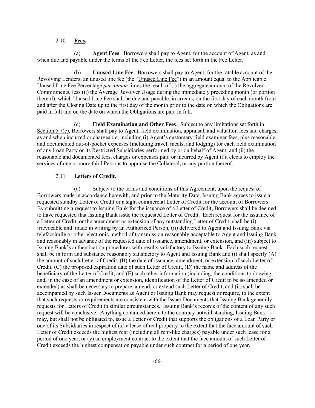-66- 2.10 Fees. (a) Agent Fees. Borrowers shall pay to Agent, for the account of Agent, as and when due and payable under the terms of the Fee Letter, the fees set forth in the Fee Letter. (b) Unused Line Fee. Borrowers shall pay to Agent, for the ratable account of the Revolving Lenders, an unused line fee (the “Unused Line Fee”) in an amount equal to the Applicable Unused Line Fee Percentage per annum times the result of (i) the aggregate amount of the Revolver Commitments, less (ii) the Average Revolver Usage during the immediately preceding month (or portion thereof), which Unused Line Fee shall be due and payable, in arrears, on the first day of each month from and after the Closing Date up to the first day of the month prior to the date on which the Obligations are paid in full and on the date on which the Obligations are paid in full. (c) Field Examination and Other Fees. Subject to any limitations set forth in Section 5.7(c), Borrowers shall pay to Agent, field examination, appraisal, and valuation fees and charges, as and when incurred or chargeable, including (i) Agent’s customary field examiner fees, plus reasonable and documented out-of-pocket expenses (including travel, meals, and lodging) for each field examination of any Loan Party or its Restricted Subsidiaries performed by or on behalf of Agent, and (ii) the reasonable and documented fees, charges or expenses paid or incurred by Agent if it elects to employ the services of one or more third Persons to appraise the Collateral, or any portion thereof. 2.11 Letters of Credit. (a) Subject to the terms and conditions of this Agreement, upon the request of Borrowers made in accordance herewith, and prior to the Maturity Date, Issuing Bank agrees to issue a requested standby Letter of Credit or a sight commercial Letter of Credit for the account of Borrowers. By submitting a request to Issuing Bank for the issuance of a Letter of Credit, Borrowers shall be deemed to have requested that Issuing Bank issue the requested Letter of Credit. Each request for the issuance of a Letter of Credit, or the amendment or extension of any outstanding Letter of Credit, shall be (i) irrevocable and made in writing by an Authorized Person, (ii) delivered to Agent and Issuing Bank via telefacsimile or other electronic method of transmission reasonably acceptable to Agent and Issuing Bank and reasonably in advance of the requested date of issuance, amendment, or extension, and (iii) subject to Issuing Bank’s authentication procedures with results satisfactory to Issuing Bank. Each such request shall be in form and substance reasonably satisfactory to Agent and Issuing Bank and (i) shall specify (A) the amount of such Letter of Credit, (B) the date of issuance, amendment, or extension of such Letter of Credit, (C) the proposed expiration date of such Letter of Credit, (D) the name and address of the beneficiary of the Letter of Credit, and (E) such other information (including, the conditions to drawing, and, in the case of an amendment or extension, identification of the Letter of Credit to be so amended or extended) as shall be necessary to prepare, amend, or extend such Letter of Credit, and (ii) shall be accompanied by such Issuer Documents as Agent or Issuing Bank may request or require, to the extent that such requests or requirements are consistent with the Issuer Documents that Issuing Bank generally requests for Letters of Credit in similar circumstances. Issuing Bank’s records of the content of any such request will be conclusive. Anything contained herein to the contrary notwithstanding, Issuing Bank may, but shall not be obligated to, issue a Letter of Credit that supports the obligations of a Loan Party or one of its Subsidiaries in respect of (x) a lease of real property to the extent that the face amount of such Letter of Credit exceeds the highest rent (including all rent-like charges) payable under such lease for a period of one year, or (y) an employment contract to the extent that the face amount of such Letter of Credit exceeds the highest compensation payable under such contract for a period of one year.