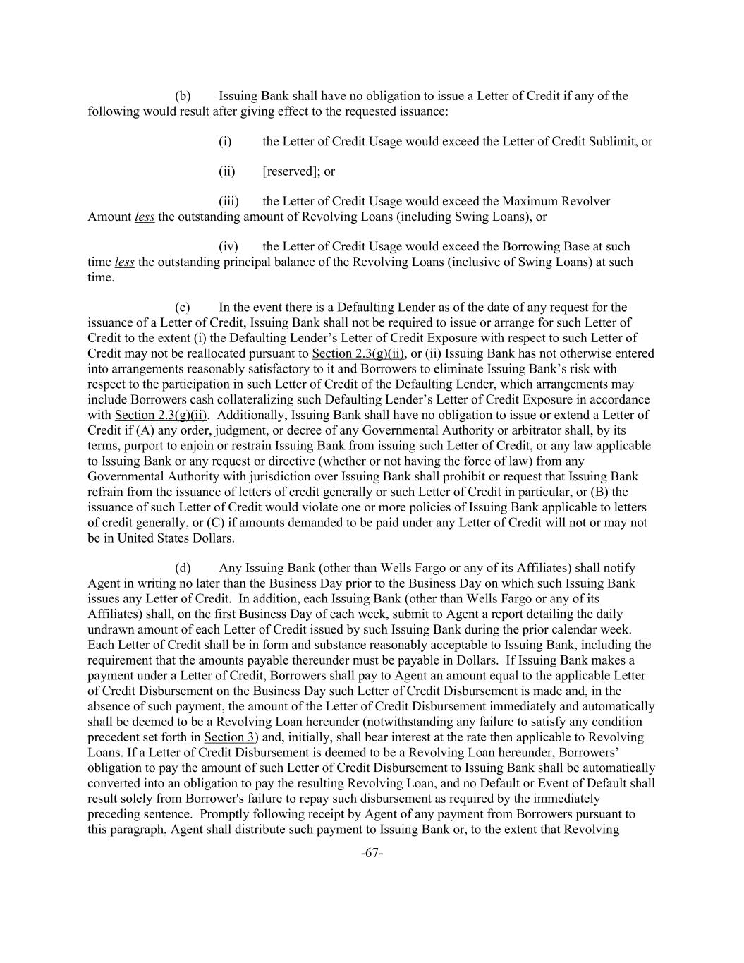 -67- (b) Issuing Bank shall have no obligation to issue a Letter of Credit if any of the following would result after giving effect to the requested issuance: (i) the Letter of Credit Usage would exceed the Letter of Credit Sublimit, or (ii) [reserved]; or (iii) the Letter of Credit Usage would exceed the Maximum Revolver Amount less the outstanding amount of Revolving Loans (including Swing Loans), or (iv) the Letter of Credit Usage would exceed the Borrowing Base at such time less the outstanding principal balance of the Revolving Loans (inclusive of Swing Loans) at such time. (c) In the event there is a Defaulting Lender as of the date of any request for the issuance of a Letter of Credit, Issuing Bank shall not be required to issue or arrange for such Letter of Credit to the extent (i) the Defaulting Lender’s Letter of Credit Exposure with respect to such Letter of Credit may not be reallocated pursuant to Section 2.3(g)(ii), or (ii) Issuing Bank has not otherwise entered into arrangements reasonably satisfactory to it and Borrowers to eliminate Issuing Bank’s risk with respect to the participation in such Letter of Credit of the Defaulting Lender, which arrangements may include Borrowers cash collateralizing such Defaulting Lender’s Letter of Credit Exposure in accordance with Section 2.3(g)(ii). Additionally, Issuing Bank shall have no obligation to issue or extend a Letter of Credit if (A) any order, judgment, or decree of any Governmental Authority or arbitrator shall, by its terms, purport to enjoin or restrain Issuing Bank from issuing such Letter of Credit, or any law applicable to Issuing Bank or any request or directive (whether or not having the force of law) from any Governmental Authority with jurisdiction over Issuing Bank shall prohibit or request that Issuing Bank refrain from the issuance of letters of credit generally or such Letter of Credit in particular, or (B) the issuance of such Letter of Credit would violate one or more policies of Issuing Bank applicable to letters of credit generally, or (C) if amounts demanded to be paid under any Letter of Credit will not or may not be in United States Dollars. (d) Any Issuing Bank (other than Wells Fargo or any of its Affiliates) shall notify Agent in writing no later than the Business Day prior to the Business Day on which such Issuing Bank issues any Letter of Credit. In addition, each Issuing Bank (other than Wells Fargo or any of its Affiliates) shall, on the first Business Day of each week, submit to Agent a report detailing the daily undrawn amount of each Letter of Credit issued by such Issuing Bank during the prior calendar week. Each Letter of Credit shall be in form and substance reasonably acceptable to Issuing Bank, including the requirement that the amounts payable thereunder must be payable in Dollars. If Issuing Bank makes a payment under a Letter of Credit, Borrowers shall pay to Agent an amount equal to the applicable Letter of Credit Disbursement on the Business Day such Letter of Credit Disbursement is made and, in the absence of such payment, the amount of the Letter of Credit Disbursement immediately and automatically shall be deemed to be a Revolving Loan hereunder (notwithstanding any failure to satisfy any condition precedent set forth in Section 3) and, initially, shall bear interest at the rate then applicable to Revolving Loans. If a Letter of Credit Disbursement is deemed to be a Revolving Loan hereunder, Borrowers’ obligation to pay the amount of such Letter of Credit Disbursement to Issuing Bank shall be automatically converted into an obligation to pay the resulting Revolving Loan, and no Default or Event of Default shall result solely from Borrower's failure to repay such disbursement as required by the immediately preceding sentence. Promptly following receipt by Agent of any payment from Borrowers pursuant to this paragraph, Agent shall distribute such payment to Issuing Bank or, to the extent that Revolving
