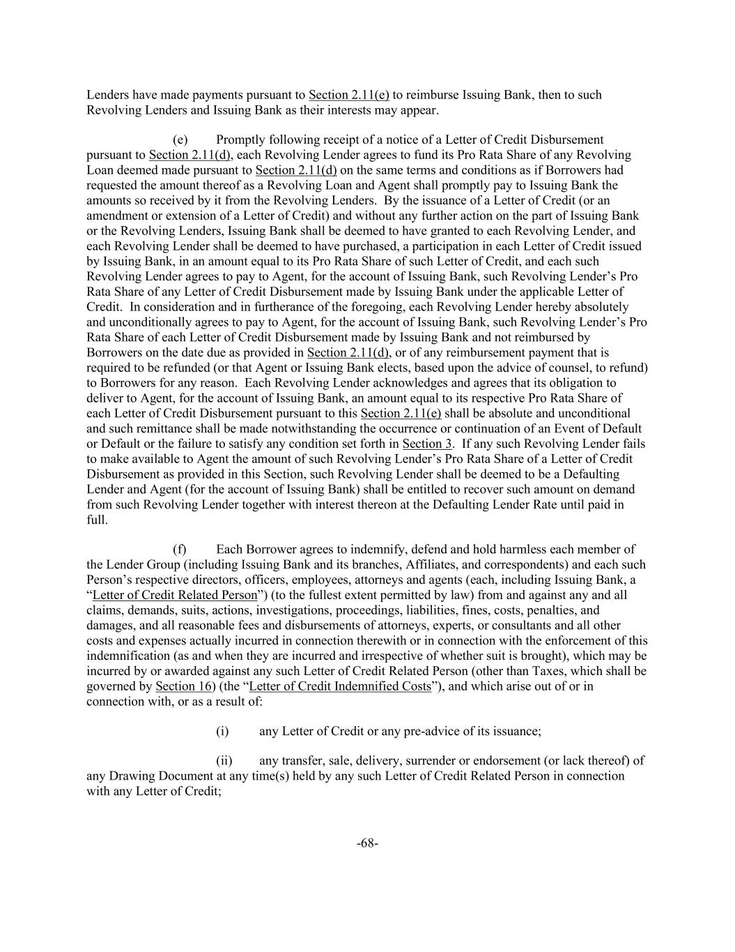 -68- Lenders have made payments pursuant to Section 2.11(e) to reimburse Issuing Bank, then to such Revolving Lenders and Issuing Bank as their interests may appear. (e) Promptly following receipt of a notice of a Letter of Credit Disbursement pursuant to Section 2.11(d), each Revolving Lender agrees to fund its Pro Rata Share of any Revolving Loan deemed made pursuant to Section 2.11(d) on the same terms and conditions as if Borrowers had requested the amount thereof as a Revolving Loan and Agent shall promptly pay to Issuing Bank the amounts so received by it from the Revolving Lenders. By the issuance of a Letter of Credit (or an amendment or extension of a Letter of Credit) and without any further action on the part of Issuing Bank or the Revolving Lenders, Issuing Bank shall be deemed to have granted to each Revolving Lender, and each Revolving Lender shall be deemed to have purchased, a participation in each Letter of Credit issued by Issuing Bank, in an amount equal to its Pro Rata Share of such Letter of Credit, and each such Revolving Lender agrees to pay to Agent, for the account of Issuing Bank, such Revolving Lender’s Pro Rata Share of any Letter of Credit Disbursement made by Issuing Bank under the applicable Letter of Credit. In consideration and in furtherance of the foregoing, each Revolving Lender hereby absolutely and unconditionally agrees to pay to Agent, for the account of Issuing Bank, such Revolving Lender’s Pro Rata Share of each Letter of Credit Disbursement made by Issuing Bank and not reimbursed by Borrowers on the date due as provided in Section 2.11(d), or of any reimbursement payment that is required to be refunded (or that Agent or Issuing Bank elects, based upon the advice of counsel, to refund) to Borrowers for any reason. Each Revolving Lender acknowledges and agrees that its obligation to deliver to Agent, for the account of Issuing Bank, an amount equal to its respective Pro Rata Share of each Letter of Credit Disbursement pursuant to this Section 2.11(e) shall be absolute and unconditional and such remittance shall be made notwithstanding the occurrence or continuation of an Event of Default or Default or the failure to satisfy any condition set forth in Section 3. If any such Revolving Lender fails to make available to Agent the amount of such Revolving Lender’s Pro Rata Share of a Letter of Credit Disbursement as provided in this Section, such Revolving Lender shall be deemed to be a Defaulting Lender and Agent (for the account of Issuing Bank) shall be entitled to recover such amount on demand from such Revolving Lender together with interest thereon at the Defaulting Lender Rate until paid in full. (f) Each Borrower agrees to indemnify, defend and hold harmless each member of the Lender Group (including Issuing Bank and its branches, Affiliates, and correspondents) and each such Person’s respective directors, officers, employees, attorneys and agents (each, including Issuing Bank, a “Letter of Credit Related Person”) (to the fullest extent permitted by law) from and against any and all claims, demands, suits, actions, investigations, proceedings, liabilities, fines, costs, penalties, and damages, and all reasonable fees and disbursements of attorneys, experts, or consultants and all other costs and expenses actually incurred in connection therewith or in connection with the enforcement of this indemnification (as and when they are incurred and irrespective of whether suit is brought), which may be incurred by or awarded against any such Letter of Credit Related Person (other than Taxes, which shall be governed by Section 16) (the “Letter of Credit Indemnified Costs”), and which arise out of or in connection with, or as a result of: (i) any Letter of Credit or any pre-advice of its issuance; (ii) any transfer, sale, delivery, surrender or endorsement (or lack thereof) of any Drawing Document at any time(s) held by any such Letter of Credit Related Person in connection with any Letter of Credit;