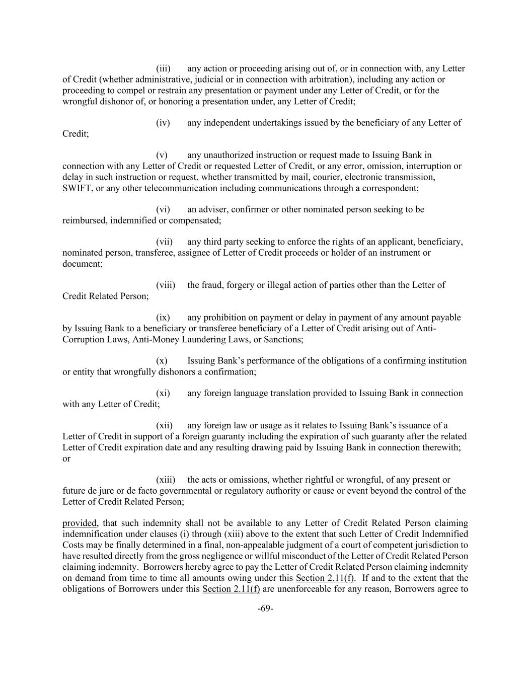 -69- (iii) any action or proceeding arising out of, or in connection with, any Letter of Credit (whether administrative, judicial or in connection with arbitration), including any action or proceeding to compel or restrain any presentation or payment under any Letter of Credit, or for the wrongful dishonor of, or honoring a presentation under, any Letter of Credit; (iv) any independent undertakings issued by the beneficiary of any Letter of Credit; (v) any unauthorized instruction or request made to Issuing Bank in connection with any Letter of Credit or requested Letter of Credit, or any error, omission, interruption or delay in such instruction or request, whether transmitted by mail, courier, electronic transmission, SWIFT, or any other telecommunication including communications through a correspondent; (vi) an adviser, confirmer or other nominated person seeking to be reimbursed, indemnified or compensated; (vii) any third party seeking to enforce the rights of an applicant, beneficiary, nominated person, transferee, assignee of Letter of Credit proceeds or holder of an instrument or document; (viii) the fraud, forgery or illegal action of parties other than the Letter of Credit Related Person; (ix) any prohibition on payment or delay in payment of any amount payable by Issuing Bank to a beneficiary or transferee beneficiary of a Letter of Credit arising out of Anti- Corruption Laws, Anti-Money Laundering Laws, or Sanctions; (x) Issuing Bank’s performance of the obligations of a confirming institution or entity that wrongfully dishonors a confirmation; (xi) any foreign language translation provided to Issuing Bank in connection with any Letter of Credit; (xii) any foreign law or usage as it relates to Issuing Bank’s issuance of a Letter of Credit in support of a foreign guaranty including the expiration of such guaranty after the related Letter of Credit expiration date and any resulting drawing paid by Issuing Bank in connection therewith; or (xiii) the acts or omissions, whether rightful or wrongful, of any present or future de jure or de facto governmental or regulatory authority or cause or event beyond the control of the Letter of Credit Related Person; provided, that such indemnity shall not be available to any Letter of Credit Related Person claiming indemnification under clauses (i) through (xiii) above to the extent that such Letter of Credit Indemnified Costs may be finally determined in a final, non-appealable judgment of a court of competent jurisdiction to have resulted directly from the gross negligence or willful misconduct of the Letter of Credit Related Person claiming indemnity. Borrowers hereby agree to pay the Letter of Credit Related Person claiming indemnity on demand from time to time all amounts owing under this Section 2.11(f). If and to the extent that the obligations of Borrowers under this Section 2.11(f) are unenforceable for any reason, Borrowers agree to