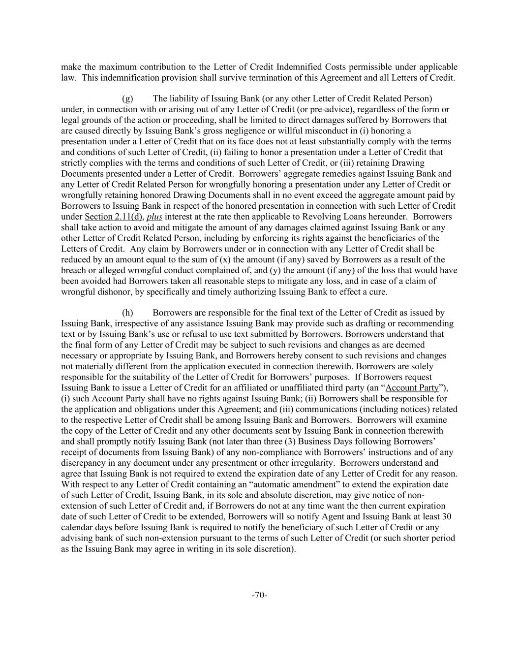 -70- make the maximum contribution to the Letter of Credit Indemnified Costs permissible under applicable law. This indemnification provision shall survive termination of this Agreement and all Letters of Credit. (g) The liability of Issuing Bank (or any other Letter of Credit Related Person) under, in connection with or arising out of any Letter of Credit (or pre-advice), regardless of the form or legal grounds of the action or proceeding, shall be limited to direct damages suffered by Borrowers that are caused directly by Issuing Bank’s gross negligence or willful misconduct in (i) honoring a presentation under a Letter of Credit that on its face does not at least substantially comply with the terms and conditions of such Letter of Credit, (ii) failing to honor a presentation under a Letter of Credit that strictly complies with the terms and conditions of such Letter of Credit, or (iii) retaining Drawing Documents presented under a Letter of Credit. Borrowers’ aggregate remedies against Issuing Bank and any Letter of Credit Related Person for wrongfully honoring a presentation under any Letter of Credit or wrongfully retaining honored Drawing Documents shall in no event exceed the aggregate amount paid by Borrowers to Issuing Bank in respect of the honored presentation in connection with such Letter of Credit under Section 2.11(d), plus interest at the rate then applicable to Revolving Loans hereunder. Borrowers shall take action to avoid and mitigate the amount of any damages claimed against Issuing Bank or any other Letter of Credit Related Person, including by enforcing its rights against the beneficiaries of the Letters of Credit. Any claim by Borrowers under or in connection with any Letter of Credit shall be reduced by an amount equal to the sum of (x) the amount (if any) saved by Borrowers as a result of the breach or alleged wrongful conduct complained of, and (y) the amount (if any) of the loss that would have been avoided had Borrowers taken all reasonable steps to mitigate any loss, and in case of a claim of wrongful dishonor, by specifically and timely authorizing Issuing Bank to effect a cure. (h) Borrowers are responsible for the final text of the Letter of Credit as issued by Issuing Bank, irrespective of any assistance Issuing Bank may provide such as drafting or recommending text or by Issuing Bank’s use or refusal to use text submitted by Borrowers. Borrowers understand that the final form of any Letter of Credit may be subject to such revisions and changes as are deemed necessary or appropriate by Issuing Bank, and Borrowers hereby consent to such revisions and changes not materially different from the application executed in connection therewith. Borrowers are solely responsible for the suitability of the Letter of Credit for Borrowers’ purposes. If Borrowers request Issuing Bank to issue a Letter of Credit for an affiliated or unaffiliated third party (an “Account Party”), (i) such Account Party shall have no rights against Issuing Bank; (ii) Borrowers shall be responsible for the application and obligations under this Agreement; and (iii) communications (including notices) related to the respective Letter of Credit shall be among Issuing Bank and Borrowers. Borrowers will examine the copy of the Letter of Credit and any other documents sent by Issuing Bank in connection therewith and shall promptly notify Issuing Bank (not later than three (3) Business Days following Borrowers’ receipt of documents from Issuing Bank) of any non-compliance with Borrowers’ instructions and of any discrepancy in any document under any presentment or other irregularity. Borrowers understand and agree that Issuing Bank is not required to extend the expiration date of any Letter of Credit for any reason. With respect to any Letter of Credit containing an “automatic amendment” to extend the expiration date of such Letter of Credit, Issuing Bank, in its sole and absolute discretion, may give notice of non- extension of such Letter of Credit and, if Borrowers do not at any time want the then current expiration date of such Letter of Credit to be extended, Borrowers will so notify Agent and Issuing Bank at least 30 calendar days before Issuing Bank is required to notify the beneficiary of such Letter of Credit or any advising bank of such non-extension pursuant to the terms of such Letter of Credit (or such shorter period as the Issuing Bank may agree in writing in its sole discretion).