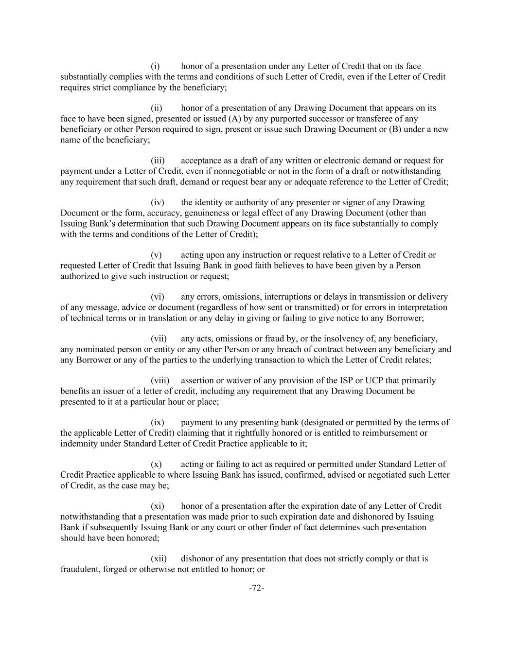 -72- (i) honor of a presentation under any Letter of Credit that on its face substantially complies with the terms and conditions of such Letter of Credit, even if the Letter of Credit requires strict compliance by the beneficiary; (ii) honor of a presentation of any Drawing Document that appears on its face to have been signed, presented or issued (A) by any purported successor or transferee of any beneficiary or other Person required to sign, present or issue such Drawing Document or (B) under a new name of the beneficiary; (iii) acceptance as a draft of any written or electronic demand or request for payment under a Letter of Credit, even if nonnegotiable or not in the form of a draft or notwithstanding any requirement that such draft, demand or request bear any or adequate reference to the Letter of Credit; (iv) the identity or authority of any presenter or signer of any Drawing Document or the form, accuracy, genuineness or legal effect of any Drawing Document (other than Issuing Bank’s determination that such Drawing Document appears on its face substantially to comply with the terms and conditions of the Letter of Credit); (v) acting upon any instruction or request relative to a Letter of Credit or requested Letter of Credit that Issuing Bank in good faith believes to have been given by a Person authorized to give such instruction or request; (vi) any errors, omissions, interruptions or delays in transmission or delivery of any message, advice or document (regardless of how sent or transmitted) or for errors in interpretation of technical terms or in translation or any delay in giving or failing to give notice to any Borrower; (vii) any acts, omissions or fraud by, or the insolvency of, any beneficiary, any nominated person or entity or any other Person or any breach of contract between any beneficiary and any Borrower or any of the parties to the underlying transaction to which the Letter of Credit relates; (viii) assertion or waiver of any provision of the ISP or UCP that primarily benefits an issuer of a letter of credit, including any requirement that any Drawing Document be presented to it at a particular hour or place; (ix) payment to any presenting bank (designated or permitted by the terms of the applicable Letter of Credit) claiming that it rightfully honored or is entitled to reimbursement or indemnity under Standard Letter of Credit Practice applicable to it; (x) acting or failing to act as required or permitted under Standard Letter of Credit Practice applicable to where Issuing Bank has issued, confirmed, advised or negotiated such Letter of Credit, as the case may be; (xi) honor of a presentation after the expiration date of any Letter of Credit notwithstanding that a presentation was made prior to such expiration date and dishonored by Issuing Bank if subsequently Issuing Bank or any court or other finder of fact determines such presentation should have been honored; (xii) dishonor of any presentation that does not strictly comply or that is fraudulent, forged or otherwise not entitled to honor; or