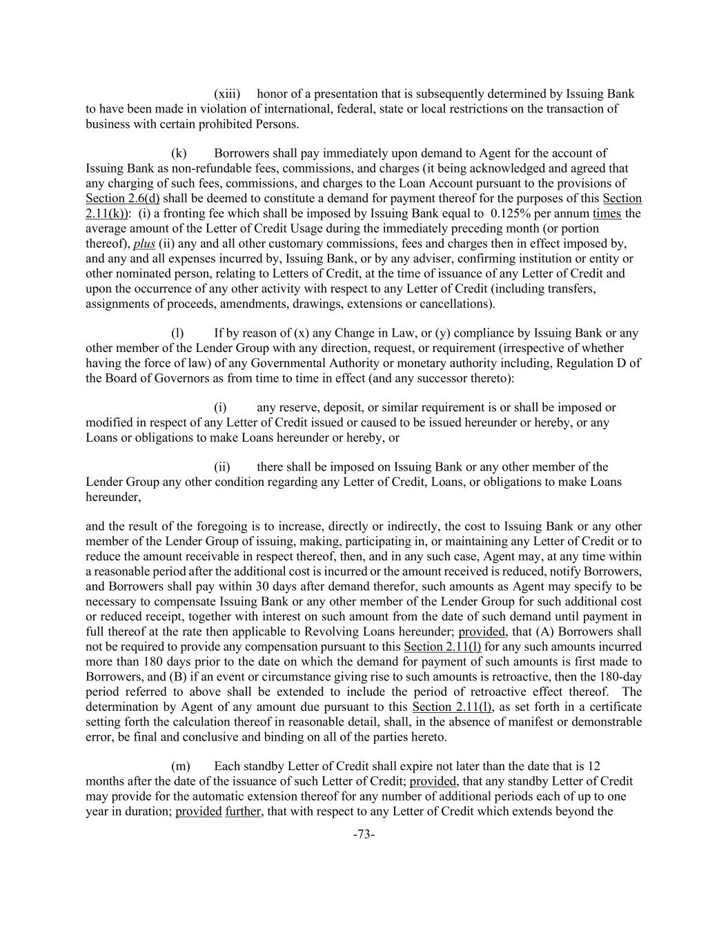 -73- (xiii) honor of a presentation that is subsequently determined by Issuing Bank to have been made in violation of international, federal, state or local restrictions on the transaction of business with certain prohibited Persons. (k) Borrowers shall pay immediately upon demand to Agent for the account of Issuing Bank as non-refundable fees, commissions, and charges (it being acknowledged and agreed that any charging of such fees, commissions, and charges to the Loan Account pursuant to the provisions of Section 2.6(d) shall be deemed to constitute a demand for payment thereof for the purposes of this Section 2.11(k)): (i) a fronting fee which shall be imposed by Issuing Bank equal to 0.125% per annum times the average amount of the Letter of Credit Usage during the immediately preceding month (or portion thereof), plus (ii) any and all other customary commissions, fees and charges then in effect imposed by, and any and all expenses incurred by, Issuing Bank, or by any adviser, confirming institution or entity or other nominated person, relating to Letters of Credit, at the time of issuance of any Letter of Credit and upon the occurrence of any other activity with respect to any Letter of Credit (including transfers, assignments of proceeds, amendments, drawings, extensions or cancellations). (l) If by reason of (x) any Change in Law, or (y) compliance by Issuing Bank or any other member of the Lender Group with any direction, request, or requirement (irrespective of whether having the force of law) of any Governmental Authority or monetary authority including, Regulation D of the Board of Governors as from time to time in effect (and any successor thereto): (i) any reserve, deposit, or similar requirement is or shall be imposed or modified in respect of any Letter of Credit issued or caused to be issued hereunder or hereby, or any Loans or obligations to make Loans hereunder or hereby, or (ii) there shall be imposed on Issuing Bank or any other member of the Lender Group any other condition regarding any Letter of Credit, Loans, or obligations to make Loans hereunder, and the result of the foregoing is to increase, directly or indirectly, the cost to Issuing Bank or any other member of the Lender Group of issuing, making, participating in, or maintaining any Letter of Credit or to reduce the amount receivable in respect thereof, then, and in any such case, Agent may, at any time within a reasonable period after the additional cost is incurred or the amount received is reduced, notify Borrowers, and Borrowers shall pay within 30 days after demand therefor, such amounts as Agent may specify to be necessary to compensate Issuing Bank or any other member of the Lender Group for such additional cost or reduced receipt, together with interest on such amount from the date of such demand until payment in full thereof at the rate then applicable to Revolving Loans hereunder; provided, that (A) Borrowers shall not be required to provide any compensation pursuant to this Section 2.11(l) for any such amounts incurred more than 180 days prior to the date on which the demand for payment of such amounts is first made to Borrowers, and (B) if an event or circumstance giving rise to such amounts is retroactive, then the 180-day period referred to above shall be extended to include the period of retroactive effect thereof. The determination by Agent of any amount due pursuant to this Section 2.11(l), as set forth in a certificate setting forth the calculation thereof in reasonable detail, shall, in the absence of manifest or demonstrable error, be final and conclusive and binding on all of the parties hereto. (m) Each standby Letter of Credit shall expire not later than the date that is 12 months after the date of the issuance of such Letter of Credit; provided, that any standby Letter of Credit may provide for the automatic extension thereof for any number of additional periods each of up to one year in duration; provided further, that with respect to any Letter of Credit which extends beyond the