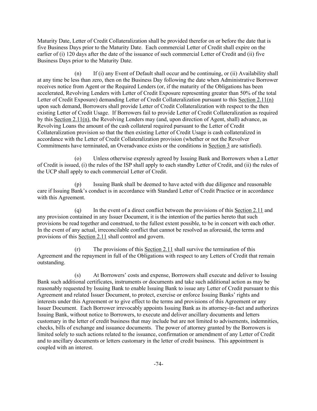 -74- Maturity Date, Letter of Credit Collateralization shall be provided therefor on or before the date that is five Business Days prior to the Maturity Date. Each commercial Letter of Credit shall expire on the earlier of (i) 120 days after the date of the issuance of such commercial Letter of Credit and (ii) five Business Days prior to the Maturity Date. (n) If (i) any Event of Default shall occur and be continuing, or (ii) Availability shall at any time be less than zero, then on the Business Day following the date when Administrative Borrower receives notice from Agent or the Required Lenders (or, if the maturity of the Obligations has been accelerated, Revolving Lenders with Letter of Credit Exposure representing greater than 50% of the total Letter of Credit Exposure) demanding Letter of Credit Collateralization pursuant to this Section 2.11(n) upon such demand, Borrowers shall provide Letter of Credit Collateralization with respect to the then existing Letter of Credit Usage. If Borrowers fail to provide Letter of Credit Collateralization as required by this Section 2.11(n), the Revolving Lenders may (and, upon direction of Agent, shall) advance, as Revolving Loans the amount of the cash collateral required pursuant to the Letter of Credit Collateralization provision so that the then existing Letter of Credit Usage is cash collateralized in accordance with the Letter of Credit Collateralization provision (whether or not the Revolver Commitments have terminated, an Overadvance exists or the conditions in Section 3 are satisfied). (o) Unless otherwise expressly agreed by Issuing Bank and Borrowers when a Letter of Credit is issued, (i) the rules of the ISP shall apply to each standby Letter of Credit, and (ii) the rules of the UCP shall apply to each commercial Letter of Credit. (p) Issuing Bank shall be deemed to have acted with due diligence and reasonable care if Issuing Bank’s conduct is in accordance with Standard Letter of Credit Practice or in accordance with this Agreement. (q) In the event of a direct conflict between the provisions of this Section 2.11 and any provision contained in any Issuer Document, it is the intention of the parties hereto that such provisions be read together and construed, to the fullest extent possible, to be in concert with each other. In the event of any actual, irreconcilable conflict that cannot be resolved as aforesaid, the terms and provisions of this Section 2.11 shall control and govern. (r) The provisions of this Section 2.11 shall survive the termination of this Agreement and the repayment in full of the Obligations with respect to any Letters of Credit that remain outstanding. (s) At Borrowers’ costs and expense, Borrowers shall execute and deliver to Issuing Bank such additional certificates, instruments or documents and take such additional action as may be reasonably requested by Issuing Bank to enable Issuing Bank to issue any Letter of Credit pursuant to this Agreement and related Issuer Document, to protect, exercise or enforce Issuing Banks’ rights and interests under this Agreement or to give effect to the terms and provisions of this Agreement or any Issuer Document. Each Borrower irrevocably appoints Issuing Bank as its attorney-in-fact and authorizes Issuing Bank, without notice to Borrowers, to execute and deliver ancillary documents and letters customary in the letter of credit business that may include but are not limited to advisements, indemnities, checks, bills of exchange and issuance documents. The power of attorney granted by the Borrowers is limited solely to such actions related to the issuance, confirmation or amendment of any Letter of Credit and to ancillary documents or letters customary in the letter of credit business. This appointment is coupled with an interest.