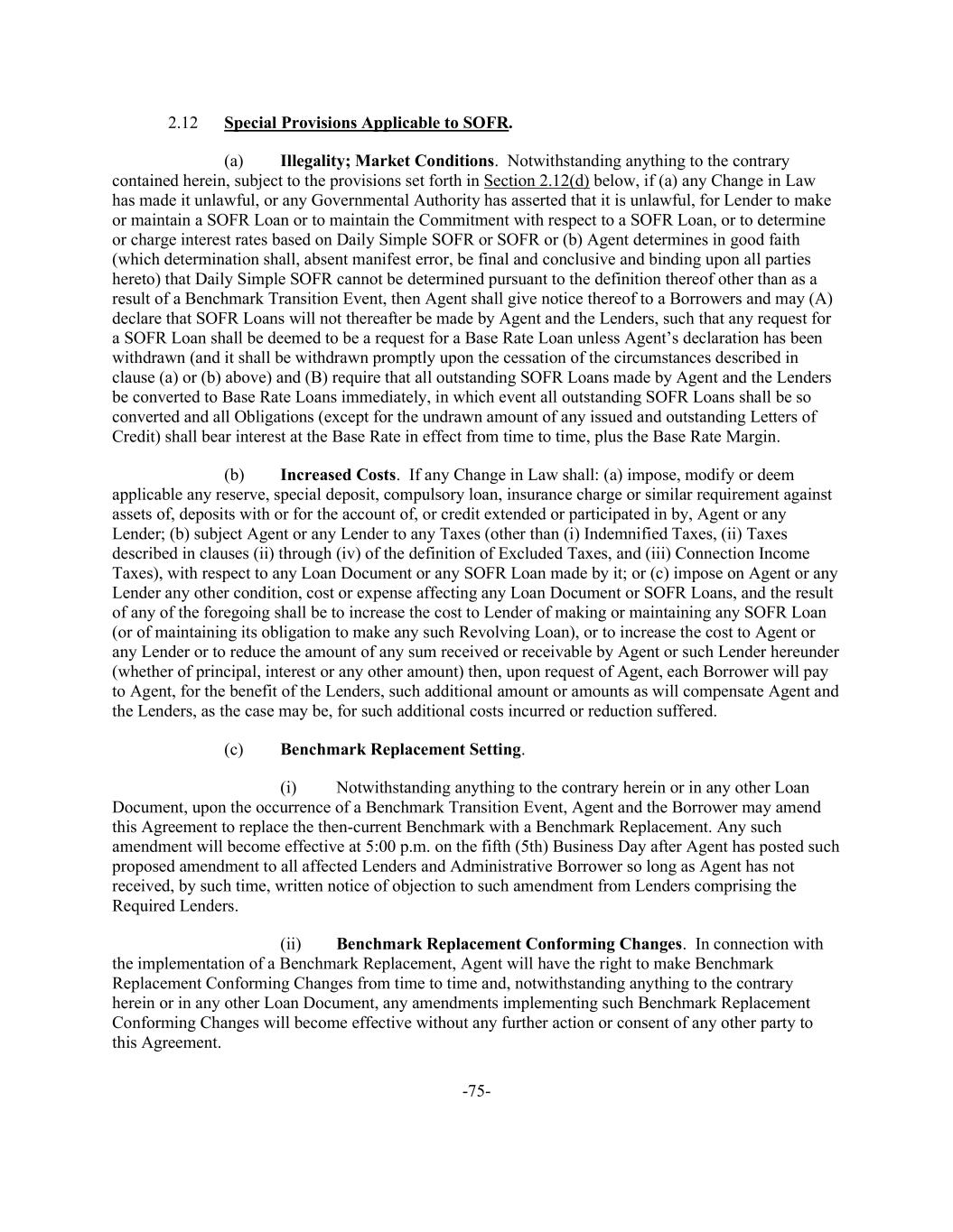 -75- 2.12 Special Provisions Applicable to SOFR. (a) Illegality; Market Conditions. Notwithstanding anything to the contrary contained herein, subject to the provisions set forth in Section 2.12(d) below, if (a) any Change in Law has made it unlawful, or any Governmental Authority has asserted that it is unlawful, for Lender to make or maintain a SOFR Loan or to maintain the Commitment with respect to a SOFR Loan, or to determine or charge interest rates based on Daily Simple SOFR or SOFR or (b) Agent determines in good faith (which determination shall, absent manifest error, be final and conclusive and binding upon all parties hereto) that Daily Simple SOFR cannot be determined pursuant to the definition thereof other than as a result of a Benchmark Transition Event, then Agent shall give notice thereof to a Borrowers and may (A) declare that SOFR Loans will not thereafter be made by Agent and the Lenders, such that any request for a SOFR Loan shall be deemed to be a request for a Base Rate Loan unless Agent’s declaration has been withdrawn (and it shall be withdrawn promptly upon the cessation of the circumstances described in clause (a) or (b) above) and (B) require that all outstanding SOFR Loans made by Agent and the Lenders be converted to Base Rate Loans immediately, in which event all outstanding SOFR Loans shall be so converted and all Obligations (except for the undrawn amount of any issued and outstanding Letters of Credit) shall bear interest at the Base Rate in effect from time to time, plus the Base Rate Margin. (b) Increased Costs. If any Change in Law shall: (a) impose, modify or deem applicable any reserve, special deposit, compulsory loan, insurance charge or similar requirement against assets of, deposits with or for the account of, or credit extended or participated in by, Agent or any Lender; (b) subject Agent or any Lender to any Taxes (other than (i) Indemnified Taxes, (ii) Taxes described in clauses (ii) through (iv) of the definition of Excluded Taxes, and (iii) Connection Income Taxes), with respect to any Loan Document or any SOFR Loan made by it; or (c) impose on Agent or any Lender any other condition, cost or expense affecting any Loan Document or SOFR Loans, and the result of any of the foregoing shall be to increase the cost to Lender of making or maintaining any SOFR Loan (or of maintaining its obligation to make any such Revolving Loan), or to increase the cost to Agent or any Lender or to reduce the amount of any sum received or receivable by Agent or such Lender hereunder (whether of principal, interest or any other amount) then, upon request of Agent, each Borrower will pay to Agent, for the benefit of the Lenders, such additional amount or amounts as will compensate Agent and the Lenders, as the case may be, for such additional costs incurred or reduction suffered. (c) Benchmark Replacement Setting. (i) Notwithstanding anything to the contrary herein or in any other Loan Document, upon the occurrence of a Benchmark Transition Event, Agent and the Borrower may amend this Agreement to replace the then-current Benchmark with a Benchmark Replacement. Any such amendment will become effective at 5:00 p.m. on the fifth (5th) Business Day after Agent has posted such proposed amendment to all affected Lenders and Administrative Borrower so long as Agent has not received, by such time, written notice of objection to such amendment from Lenders comprising the Required Lenders. (ii) Benchmark Replacement Conforming Changes. In connection with the implementation of a Benchmark Replacement, Agent will have the right to make Benchmark Replacement Conforming Changes from time to time and, notwithstanding anything to the contrary herein or in any other Loan Document, any amendments implementing such Benchmark Replacement Conforming Changes will become effective without any further action or consent of any other party to this Agreement.