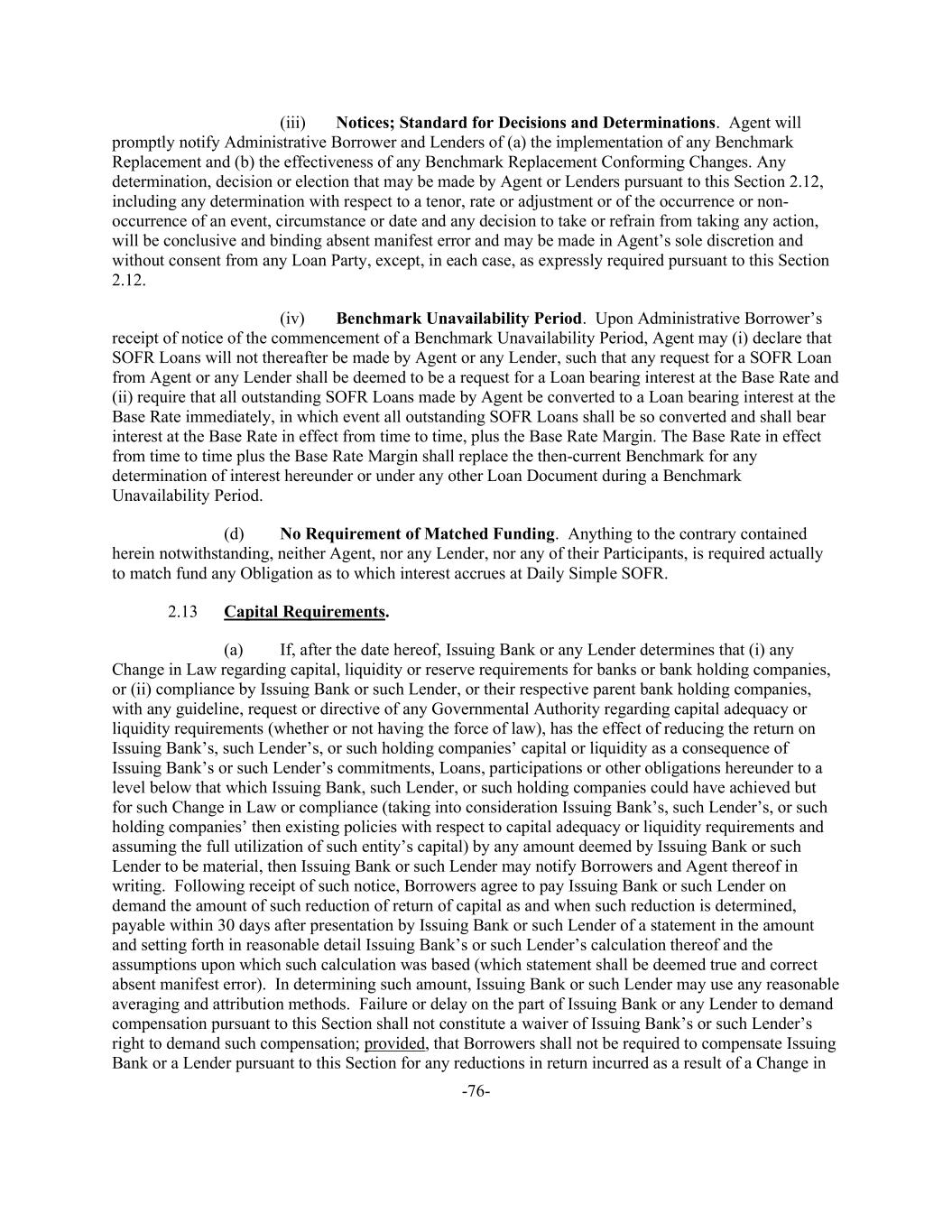 -76- (iii) Notices; Standard for Decisions and Determinations. Agent will promptly notify Administrative Borrower and Lenders of (a) the implementation of any Benchmark Replacement and (b) the effectiveness of any Benchmark Replacement Conforming Changes. Any determination, decision or election that may be made by Agent or Lenders pursuant to this Section 2.12, including any determination with respect to a tenor, rate or adjustment or of the occurrence or non- occurrence of an event, circumstance or date and any decision to take or refrain from taking any action, will be conclusive and binding absent manifest error and may be made in Agent’s sole discretion and without consent from any Loan Party, except, in each case, as expressly required pursuant to this Section 2.12. (iv) Benchmark Unavailability Period. Upon Administrative Borrower’s receipt of notice of the commencement of a Benchmark Unavailability Period, Agent may (i) declare that SOFR Loans will not thereafter be made by Agent or any Lender, such that any request for a SOFR Loan from Agent or any Lender shall be deemed to be a request for a Loan bearing interest at the Base Rate and (ii) require that all outstanding SOFR Loans made by Agent be converted to a Loan bearing interest at the Base Rate immediately, in which event all outstanding SOFR Loans shall be so converted and shall bear interest at the Base Rate in effect from time to time, plus the Base Rate Margin. The Base Rate in effect from time to time plus the Base Rate Margin shall replace the then-current Benchmark for any determination of interest hereunder or under any other Loan Document during a Benchmark Unavailability Period. (d) No Requirement of Matched Funding. Anything to the contrary contained herein notwithstanding, neither Agent, nor any Lender, nor any of their Participants, is required actually to match fund any Obligation as to which interest accrues at Daily Simple SOFR. 2.13 Capital Requirements. (a) If, after the date hereof, Issuing Bank or any Lender determines that (i) any Change in Law regarding capital, liquidity or reserve requirements for banks or bank holding companies, or (ii) compliance by Issuing Bank or such Lender, or their respective parent bank holding companies, with any guideline, request or directive of any Governmental Authority regarding capital adequacy or liquidity requirements (whether or not having the force of law), has the effect of reducing the return on Issuing Bank’s, such Lender’s, or such holding companies’ capital or liquidity as a consequence of Issuing Bank’s or such Lender’s commitments, Loans, participations or other obligations hereunder to a level below that which Issuing Bank, such Lender, or such holding companies could have achieved but for such Change in Law or compliance (taking into consideration Issuing Bank’s, such Lender’s, or such holding companies’ then existing policies with respect to capital adequacy or liquidity requirements and assuming the full utilization of such entity’s capital) by any amount deemed by Issuing Bank or such Lender to be material, then Issuing Bank or such Lender may notify Borrowers and Agent thereof in writing. Following receipt of such notice, Borrowers agree to pay Issuing Bank or such Lender on demand the amount of such reduction of return of capital as and when such reduction is determined, payable within 30 days after presentation by Issuing Bank or such Lender of a statement in the amount and setting forth in reasonable detail Issuing Bank’s or such Lender’s calculation thereof and the assumptions upon which such calculation was based (which statement shall be deemed true and correct absent manifest error). In determining such amount, Issuing Bank or such Lender may use any reasonable averaging and attribution methods. Failure or delay on the part of Issuing Bank or any Lender to demand compensation pursuant to this Section shall not constitute a waiver of Issuing Bank’s or such Lender’s right to demand such compensation; provided, that Borrowers shall not be required to compensate Issuing Bank or a Lender pursuant to this Section for any reductions in return incurred as a result of a Change in