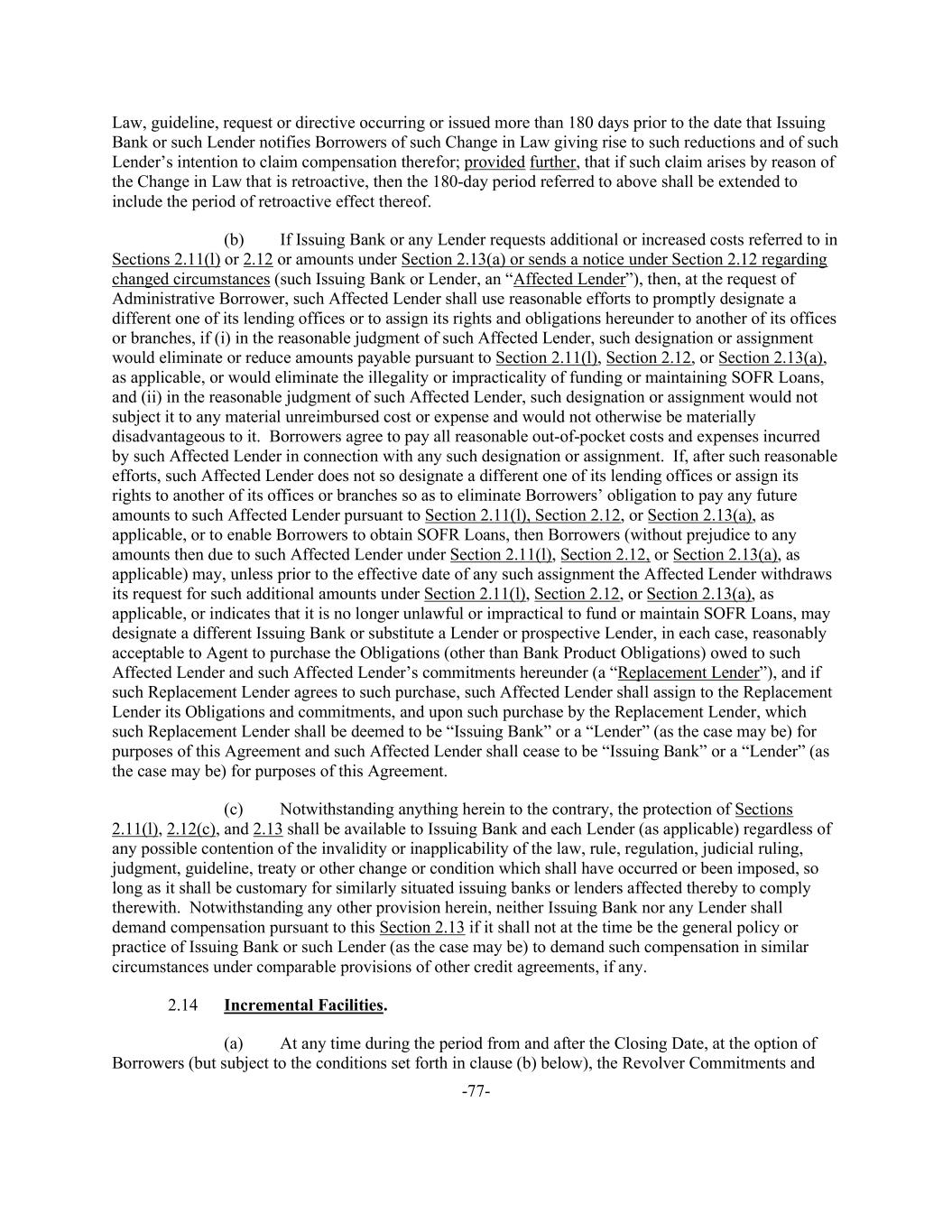 -77- Law, guideline, request or directive occurring or issued more than 180 days prior to the date that Issuing Bank or such Lender notifies Borrowers of such Change in Law giving rise to such reductions and of such Lender’s intention to claim compensation therefor; provided further, that if such claim arises by reason of the Change in Law that is retroactive, then the 180-day period referred to above shall be extended to include the period of retroactive effect thereof. (b) If Issuing Bank or any Lender requests additional or increased costs referred to in Sections 2.11(l) or 2.12 or amounts under Section 2.13(a) or sends a notice under Section 2.12 regarding changed circumstances (such Issuing Bank or Lender, an “Affected Lender”), then, at the request of Administrative Borrower, such Affected Lender shall use reasonable efforts to promptly designate a different one of its lending offices or to assign its rights and obligations hereunder to another of its offices or branches, if (i) in the reasonable judgment of such Affected Lender, such designation or assignment would eliminate or reduce amounts payable pursuant to Section 2.11(l), Section 2.12, or Section 2.13(a), as applicable, or would eliminate the illegality or impracticality of funding or maintaining SOFR Loans, and (ii) in the reasonable judgment of such Affected Lender, such designation or assignment would not subject it to any material unreimbursed cost or expense and would not otherwise be materially disadvantageous to it. Borrowers agree to pay all reasonable out-of-pocket costs and expenses incurred by such Affected Lender in connection with any such designation or assignment. If, after such reasonable efforts, such Affected Lender does not so designate a different one of its lending offices or assign its rights to another of its offices or branches so as to eliminate Borrowers’ obligation to pay any future amounts to such Affected Lender pursuant to Section 2.11(l), Section 2.12, or Section 2.13(a), as applicable, or to enable Borrowers to obtain SOFR Loans, then Borrowers (without prejudice to any amounts then due to such Affected Lender under Section 2.11(l), Section 2.12, or Section 2.13(a), as applicable) may, unless prior to the effective date of any such assignment the Affected Lender withdraws its request for such additional amounts under Section 2.11(l), Section 2.12, or Section 2.13(a), as applicable, or indicates that it is no longer unlawful or impractical to fund or maintain SOFR Loans, may designate a different Issuing Bank or substitute a Lender or prospective Lender, in each case, reasonably acceptable to Agent to purchase the Obligations (other than Bank Product Obligations) owed to such Affected Lender and such Affected Lender’s commitments hereunder (a “Replacement Lender”), and if such Replacement Lender agrees to such purchase, such Affected Lender shall assign to the Replacement Lender its Obligations and commitments, and upon such purchase by the Replacement Lender, which such Replacement Lender shall be deemed to be “Issuing Bank” or a “Lender” (as the case may be) for purposes of this Agreement and such Affected Lender shall cease to be “Issuing Bank” or a “Lender” (as the case may be) for purposes of this Agreement. (c) Notwithstanding anything herein to the contrary, the protection of Sections 2.11(l), 2.12(c), and 2.13 shall be available to Issuing Bank and each Lender (as applicable) regardless of any possible contention of the invalidity or inapplicability of the law, rule, regulation, judicial ruling, judgment, guideline, treaty or other change or condition which shall have occurred or been imposed, so long as it shall be customary for similarly situated issuing banks or lenders affected thereby to comply therewith. Notwithstanding any other provision herein, neither Issuing Bank nor any Lender shall demand compensation pursuant to this Section 2.13 if it shall not at the time be the general policy or practice of Issuing Bank or such Lender (as the case may be) to demand such compensation in similar circumstances under comparable provisions of other credit agreements, if any. 2.14 Incremental Facilities. (a) At any time during the period from and after the Closing Date, at the option of Borrowers (but subject to the conditions set forth in clause (b) below), the Revolver Commitments and