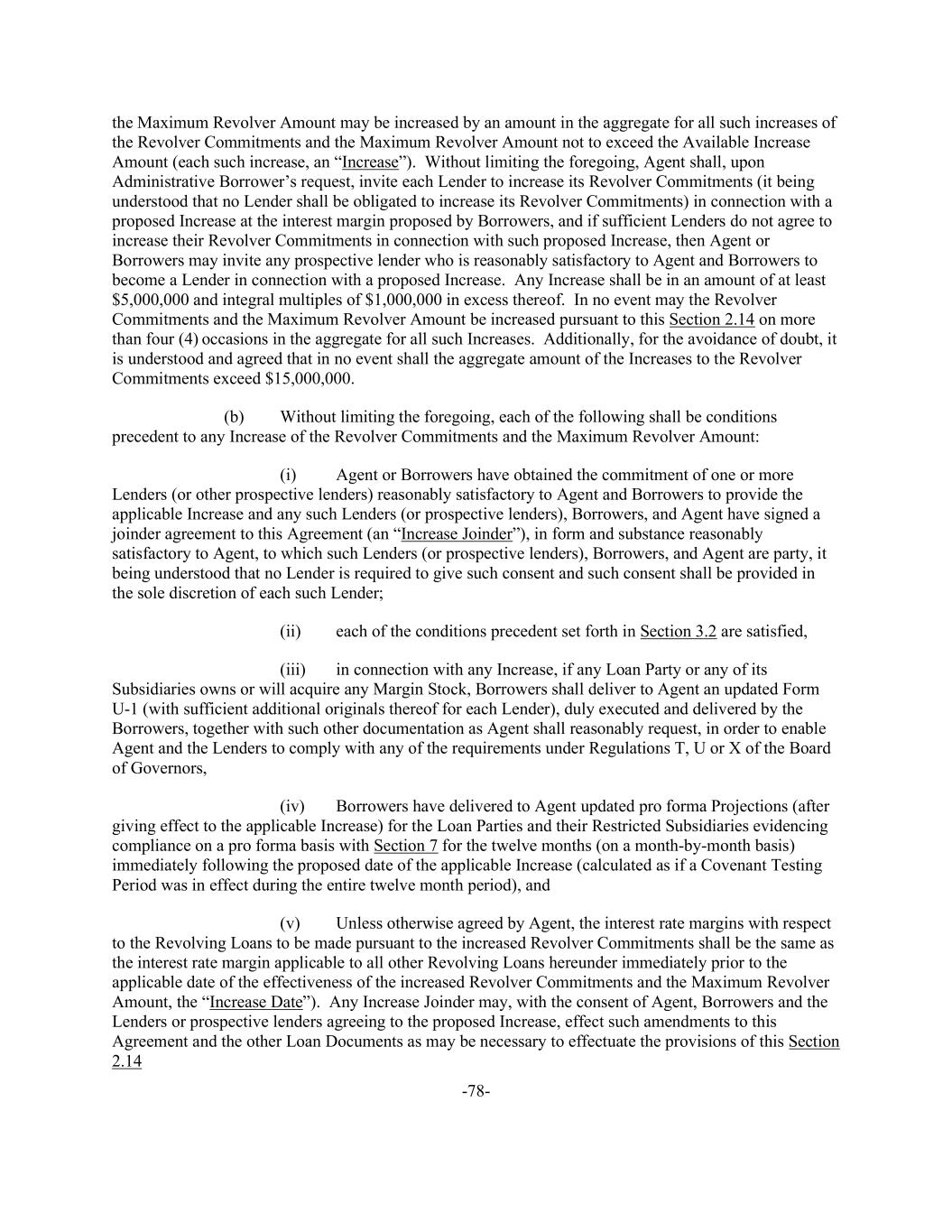 -78- the Maximum Revolver Amount may be increased by an amount in the aggregate for all such increases of the Revolver Commitments and the Maximum Revolver Amount not to exceed the Available Increase Amount (each such increase, an “Increase”). Without limiting the foregoing, Agent shall, upon Administrative Borrower’s request, invite each Lender to increase its Revolver Commitments (it being understood that no Lender shall be obligated to increase its Revolver Commitments) in connection with a proposed Increase at the interest margin proposed by Borrowers, and if sufficient Lenders do not agree to increase their Revolver Commitments in connection with such proposed Increase, then Agent or Borrowers may invite any prospective lender who is reasonably satisfactory to Agent and Borrowers to become a Lender in connection with a proposed Increase. Any Increase shall be in an amount of at least $5,000,000 and integral multiples of $1,000,000 in excess thereof. In no event may the Revolver Commitments and the Maximum Revolver Amount be increased pursuant to this Section 2.14 on more than four (4) occasions in the aggregate for all such Increases. Additionally, for the avoidance of doubt, it is understood and agreed that in no event shall the aggregate amount of the Increases to the Revolver Commitments exceed $15,000,000. (b) Without limiting the foregoing, each of the following shall be conditions precedent to any Increase of the Revolver Commitments and the Maximum Revolver Amount: (i) Agent or Borrowers have obtained the commitment of one or more Lenders (or other prospective lenders) reasonably satisfactory to Agent and Borrowers to provide the applicable Increase and any such Lenders (or prospective lenders), Borrowers, and Agent have signed a joinder agreement to this Agreement (an “Increase Joinder”), in form and substance reasonably satisfactory to Agent, to which such Lenders (or prospective lenders), Borrowers, and Agent are party, it being understood that no Lender is required to give such consent and such consent shall be provided in the sole discretion of each such Lender; (ii) each of the conditions precedent set forth in Section 3.2 are satisfied, (iii) in connection with any Increase, if any Loan Party or any of its Subsidiaries owns or will acquire any Margin Stock, Borrowers shall deliver to Agent an updated Form U-1 (with sufficient additional originals thereof for each Lender), duly executed and delivered by the Borrowers, together with such other documentation as Agent shall reasonably request, in order to enable Agent and the Lenders to comply with any of the requirements under Regulations T, U or X of the Board of Governors, (iv) Borrowers have delivered to Agent updated pro forma Projections (after giving effect to the applicable Increase) for the Loan Parties and their Restricted Subsidiaries evidencing compliance on a pro forma basis with Section 7 for the twelve months (on a month-by-month basis) immediately following the proposed date of the applicable Increase (calculated as if a Covenant Testing Period was in effect during the entire twelve month period), and (v) Unless otherwise agreed by Agent, the interest rate margins with respect to the Revolving Loans to be made pursuant to the increased Revolver Commitments shall be the same as the interest rate margin applicable to all other Revolving Loans hereunder immediately prior to the applicable date of the effectiveness of the increased Revolver Commitments and the Maximum Revolver Amount, the “Increase Date”). Any Increase Joinder may, with the consent of Agent, Borrowers and the Lenders or prospective lenders agreeing to the proposed Increase, effect such amendments to this Agreement and the other Loan Documents as may be necessary to effectuate the provisions of this Section 2.14