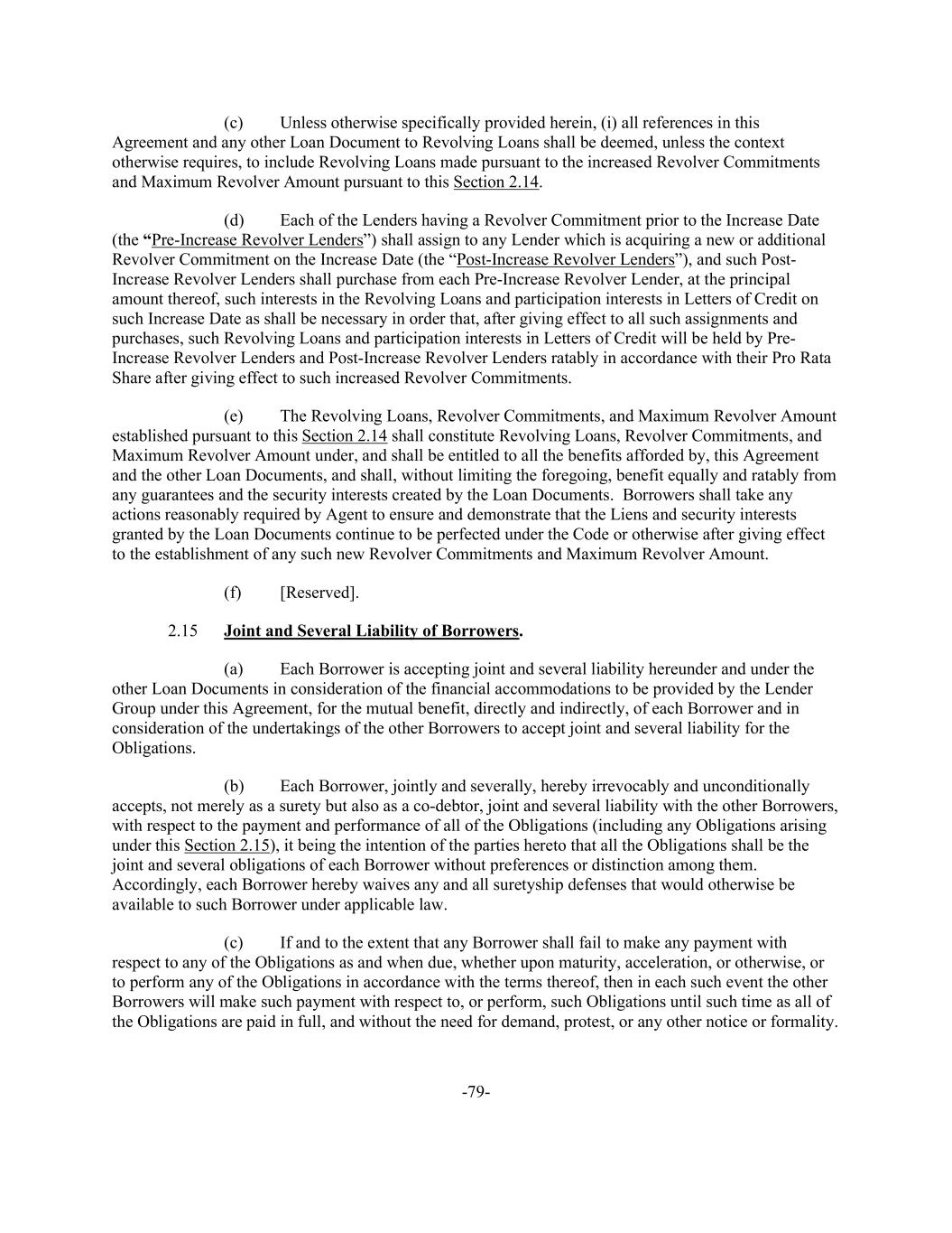-79- (c) Unless otherwise specifically provided herein, (i) all references in this Agreement and any other Loan Document to Revolving Loans shall be deemed, unless the context otherwise requires, to include Revolving Loans made pursuant to the increased Revolver Commitments and Maximum Revolver Amount pursuant to this Section 2.14. (d) Each of the Lenders having a Revolver Commitment prior to the Increase Date (the “Pre-Increase Revolver Lenders”) shall assign to any Lender which is acquiring a new or additional Revolver Commitment on the Increase Date (the “Post-Increase Revolver Lenders”), and such Post- Increase Revolver Lenders shall purchase from each Pre-Increase Revolver Lender, at the principal amount thereof, such interests in the Revolving Loans and participation interests in Letters of Credit on such Increase Date as shall be necessary in order that, after giving effect to all such assignments and purchases, such Revolving Loans and participation interests in Letters of Credit will be held by Pre- Increase Revolver Lenders and Post-Increase Revolver Lenders ratably in accordance with their Pro Rata Share after giving effect to such increased Revolver Commitments. (e) The Revolving Loans, Revolver Commitments, and Maximum Revolver Amount established pursuant to this Section 2.14 shall constitute Revolving Loans, Revolver Commitments, and Maximum Revolver Amount under, and shall be entitled to all the benefits afforded by, this Agreement and the other Loan Documents, and shall, without limiting the foregoing, benefit equally and ratably from any guarantees and the security interests created by the Loan Documents. Borrowers shall take any actions reasonably required by Agent to ensure and demonstrate that the Liens and security interests granted by the Loan Documents continue to be perfected under the Code or otherwise after giving effect to the establishment of any such new Revolver Commitments and Maximum Revolver Amount. (f) [Reserved]. 2.15 Joint and Several Liability of Borrowers. (a) Each Borrower is accepting joint and several liability hereunder and under the other Loan Documents in consideration of the financial accommodations to be provided by the Lender Group under this Agreement, for the mutual benefit, directly and indirectly, of each Borrower and in consideration of the undertakings of the other Borrowers to accept joint and several liability for the Obligations. (b) Each Borrower, jointly and severally, hereby irrevocably and unconditionally accepts, not merely as a surety but also as a co-debtor, joint and several liability with the other Borrowers, with respect to the payment and performance of all of the Obligations (including any Obligations arising under this Section 2.15), it being the intention of the parties hereto that all the Obligations shall be the joint and several obligations of each Borrower without preferences or distinction among them. Accordingly, each Borrower hereby waives any and all suretyship defenses that would otherwise be available to such Borrower under applicable law. (c) If and to the extent that any Borrower shall fail to make any payment with respect to any of the Obligations as and when due, whether upon maturity, acceleration, or otherwise, or to perform any of the Obligations in accordance with the terms thereof, then in each such event the other Borrowers will make such payment with respect to, or perform, such Obligations until such time as all of the Obligations are paid in full, and without the need for demand, protest, or any other notice or formality.