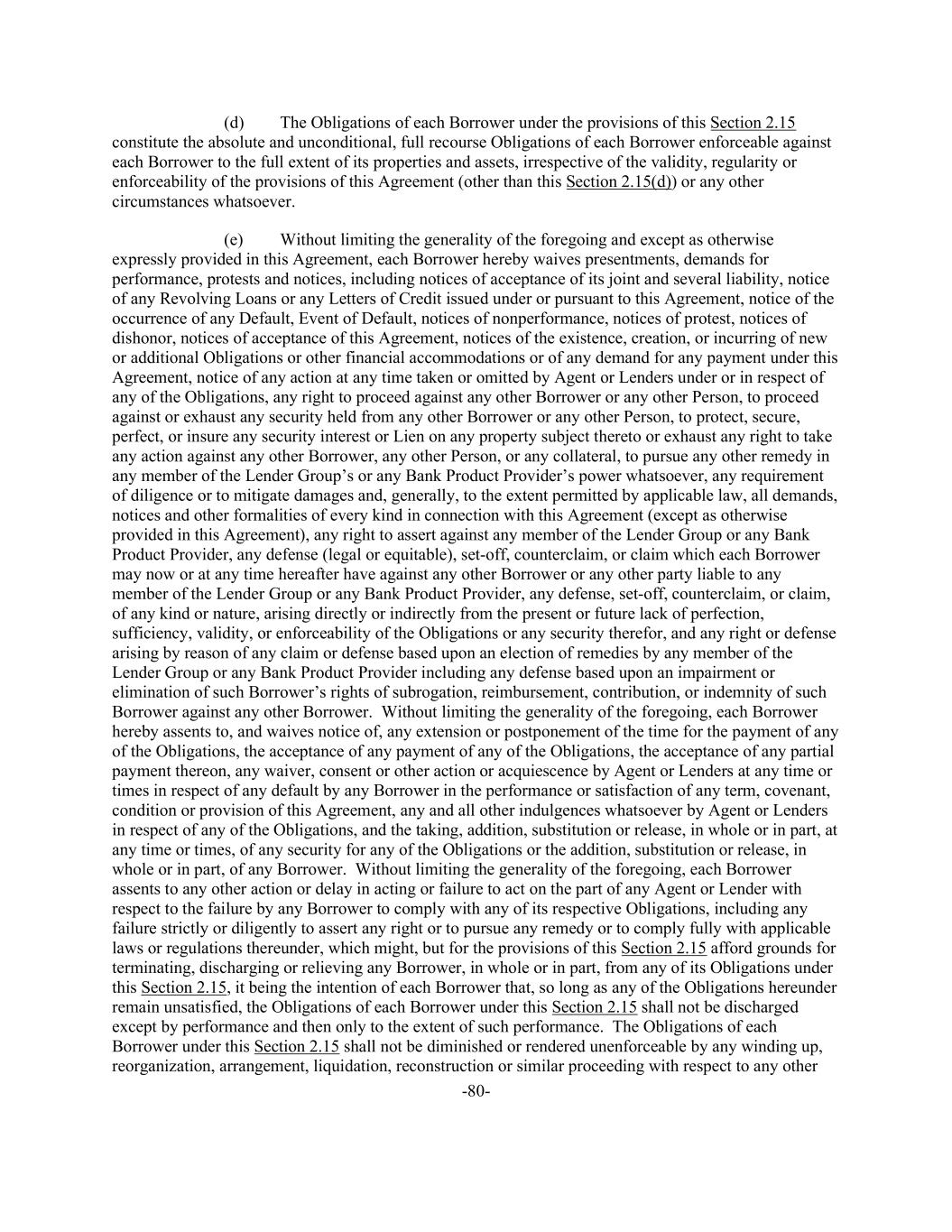 -80- (d) The Obligations of each Borrower under the provisions of this Section 2.15 constitute the absolute and unconditional, full recourse Obligations of each Borrower enforceable against each Borrower to the full extent of its properties and assets, irrespective of the validity, regularity or enforceability of the provisions of this Agreement (other than this Section 2.15(d)) or any other circumstances whatsoever. (e) Without limiting the generality of the foregoing and except as otherwise expressly provided in this Agreement, each Borrower hereby waives presentments, demands for performance, protests and notices, including notices of acceptance of its joint and several liability, notice of any Revolving Loans or any Letters of Credit issued under or pursuant to this Agreement, notice of the occurrence of any Default, Event of Default, notices of nonperformance, notices of protest, notices of dishonor, notices of acceptance of this Agreement, notices of the existence, creation, or incurring of new or additional Obligations or other financial accommodations or of any demand for any payment under this Agreement, notice of any action at any time taken or omitted by Agent or Lenders under or in respect of any of the Obligations, any right to proceed against any other Borrower or any other Person, to proceed against or exhaust any security held from any other Borrower or any other Person, to protect, secure, perfect, or insure any security interest or Lien on any property subject thereto or exhaust any right to take any action against any other Borrower, any other Person, or any collateral, to pursue any other remedy in any member of the Lender Group’s or any Bank Product Provider’s power whatsoever, any requirement of diligence or to mitigate damages and, generally, to the extent permitted by applicable law, all demands, notices and other formalities of every kind in connection with this Agreement (except as otherwise provided in this Agreement), any right to assert against any member of the Lender Group or any Bank Product Provider, any defense (legal or equitable), set-off, counterclaim, or claim which each Borrower may now or at any time hereafter have against any other Borrower or any other party liable to any member of the Lender Group or any Bank Product Provider, any defense, set-off, counterclaim, or claim, of any kind or nature, arising directly or indirectly from the present or future lack of perfection, sufficiency, validity, or enforceability of the Obligations or any security therefor, and any right or defense arising by reason of any claim or defense based upon an election of remedies by any member of the Lender Group or any Bank Product Provider including any defense based upon an impairment or elimination of such Borrower’s rights of subrogation, reimbursement, contribution, or indemnity of such Borrower against any other Borrower. Without limiting the generality of the foregoing, each Borrower hereby assents to, and waives notice of, any extension or postponement of the time for the payment of any of the Obligations, the acceptance of any payment of any of the Obligations, the acceptance of any partial payment thereon, any waiver, consent or other action or acquiescence by Agent or Lenders at any time or times in respect of any default by any Borrower in the performance or satisfaction of any term, covenant, condition or provision of this Agreement, any and all other indulgences whatsoever by Agent or Lenders in respect of any of the Obligations, and the taking, addition, substitution or release, in whole or in part, at any time or times, of any security for any of the Obligations or the addition, substitution or release, in whole or in part, of any Borrower. Without limiting the generality of the foregoing, each Borrower assents to any other action or delay in acting or failure to act on the part of any Agent or Lender with respect to the failure by any Borrower to comply with any of its respective Obligations, including any failure strictly or diligently to assert any right or to pursue any remedy or to comply fully with applicable laws or regulations thereunder, which might, but for the provisions of this Section 2.15 afford grounds for terminating, discharging or relieving any Borrower, in whole or in part, from any of its Obligations under this Section 2.15, it being the intention of each Borrower that, so long as any of the Obligations hereunder remain unsatisfied, the Obligations of each Borrower under this Section 2.15 shall not be discharged except by performance and then only to the extent of such performance. The Obligations of each Borrower under this Section 2.15 shall not be diminished or rendered unenforceable by any winding up, reorganization, arrangement, liquidation, reconstruction or similar proceeding with respect to any other