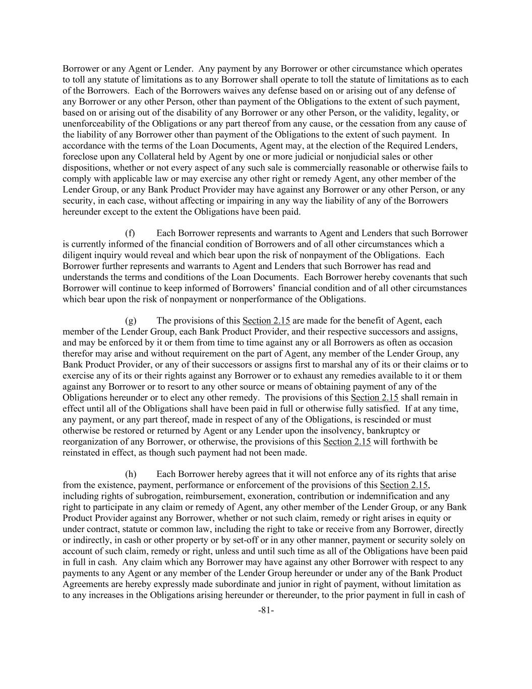 -81- Borrower or any Agent or Lender. Any payment by any Borrower or other circumstance which operates to toll any statute of limitations as to any Borrower shall operate to toll the statute of limitations as to each of the Borrowers. Each of the Borrowers waives any defense based on or arising out of any defense of any Borrower or any other Person, other than payment of the Obligations to the extent of such payment, based on or arising out of the disability of any Borrower or any other Person, or the validity, legality, or unenforceability of the Obligations or any part thereof from any cause, or the cessation from any cause of the liability of any Borrower other than payment of the Obligations to the extent of such payment. In accordance with the terms of the Loan Documents, Agent may, at the election of the Required Lenders, foreclose upon any Collateral held by Agent by one or more judicial or nonjudicial sales or other dispositions, whether or not every aspect of any such sale is commercially reasonable or otherwise fails to comply with applicable law or may exercise any other right or remedy Agent, any other member of the Lender Group, or any Bank Product Provider may have against any Borrower or any other Person, or any security, in each case, without affecting or impairing in any way the liability of any of the Borrowers hereunder except to the extent the Obligations have been paid. (f) Each Borrower represents and warrants to Agent and Lenders that such Borrower is currently informed of the financial condition of Borrowers and of all other circumstances which a diligent inquiry would reveal and which bear upon the risk of nonpayment of the Obligations. Each Borrower further represents and warrants to Agent and Lenders that such Borrower has read and understands the terms and conditions of the Loan Documents. Each Borrower hereby covenants that such Borrower will continue to keep informed of Borrowers’ financial condition and of all other circumstances which bear upon the risk of nonpayment or nonperformance of the Obligations. (g) The provisions of this Section 2.15 are made for the benefit of Agent, each member of the Lender Group, each Bank Product Provider, and their respective successors and assigns, and may be enforced by it or them from time to time against any or all Borrowers as often as occasion therefor may arise and without requirement on the part of Agent, any member of the Lender Group, any Bank Product Provider, or any of their successors or assigns first to marshal any of its or their claims or to exercise any of its or their rights against any Borrower or to exhaust any remedies available to it or them against any Borrower or to resort to any other source or means of obtaining payment of any of the Obligations hereunder or to elect any other remedy. The provisions of this Section 2.15 shall remain in effect until all of the Obligations shall have been paid in full or otherwise fully satisfied. If at any time, any payment, or any part thereof, made in respect of any of the Obligations, is rescinded or must otherwise be restored or returned by Agent or any Lender upon the insolvency, bankruptcy or reorganization of any Borrower, or otherwise, the provisions of this Section 2.15 will forthwith be reinstated in effect, as though such payment had not been made. (h) Each Borrower hereby agrees that it will not enforce any of its rights that arise from the existence, payment, performance or enforcement of the provisions of this Section 2.15, including rights of subrogation, reimbursement, exoneration, contribution or indemnification and any right to participate in any claim or remedy of Agent, any other member of the Lender Group, or any Bank Product Provider against any Borrower, whether or not such claim, remedy or right arises in equity or under contract, statute or common law, including the right to take or receive from any Borrower, directly or indirectly, in cash or other property or by set-off or in any other manner, payment or security solely on account of such claim, remedy or right, unless and until such time as all of the Obligations have been paid in full in cash. Any claim which any Borrower may have against any other Borrower with respect to any payments to any Agent or any member of the Lender Group hereunder or under any of the Bank Product Agreements are hereby expressly made subordinate and junior in right of payment, without limitation as to any increases in the Obligations arising hereunder or thereunder, to the prior payment in full in cash of