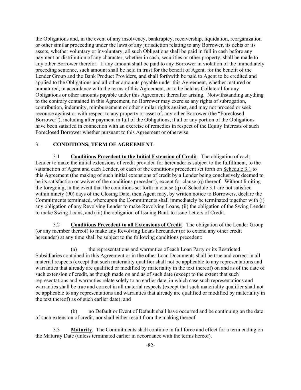 -82- the Obligations and, in the event of any insolvency, bankruptcy, receivership, liquidation, reorganization or other similar proceeding under the laws of any jurisdiction relating to any Borrower, its debts or its assets, whether voluntary or involuntary, all such Obligations shall be paid in full in cash before any payment or distribution of any character, whether in cash, securities or other property, shall be made to any other Borrower therefor. If any amount shall be paid to any Borrower in violation of the immediately preceding sentence, such amount shall be held in trust for the benefit of Agent, for the benefit of the Lender Group and the Bank Product Providers, and shall forthwith be paid to Agent to be credited and applied to the Obligations and all other amounts payable under this Agreement, whether matured or unmatured, in accordance with the terms of this Agreement, or to be held as Collateral for any Obligations or other amounts payable under this Agreement thereafter arising. Notwithstanding anything to the contrary contained in this Agreement, no Borrower may exercise any rights of subrogation, contribution, indemnity, reimbursement or other similar rights against, and may not proceed or seek recourse against or with respect to any property or asset of, any other Borrower (the “Foreclosed Borrower”), including after payment in full of the Obligations, if all or any portion of the Obligations have been satisfied in connection with an exercise of remedies in respect of the Equity Interests of such Foreclosed Borrower whether pursuant to this Agreement or otherwise. 3. CONDITIONS; TERM OF AGREEMENT. 3.1 Conditions Precedent to the Initial Extension of Credit. The obligation of each Lender to make the initial extensions of credit provided for hereunder is subject to the fulfillment, to the satisfaction of Agent and each Lender, of each of the conditions precedent set forth on Schedule 3.1 to this Agreement (the making of such initial extensions of credit by a Lender being conclusively deemed to be its satisfaction or waiver of the conditions precedent), except for clause (q) thereof. Without limiting the foregoing, in the event that the conditions set forth in clause (q) of Schedule 3.1 are not satisfied within ninety (90) days of the Closing Date, then Agent may, by written notice to Borrowers, declare the Commitments terminated, whereupon the Commitments shall immediately be terminated together with (i) any obligation of any Revolving Lender to make Revolving Loans, (ii) the obligation of the Swing Lender to make Swing Loans, and (iii) the obligation of Issuing Bank to issue Letters of Credit. 3.2 Conditions Precedent to all Extensions of Credit. The obligation of the Lender Group (or any member thereof) to make any Revolving Loans hereunder (or to extend any other credit hereunder) at any time shall be subject to the following conditions precedent: (a) the representations and warranties of each Loan Party or its Restricted Subsidiaries contained in this Agreement or in the other Loan Documents shall be true and correct in all material respects (except that such materiality qualifier shall not be applicable to any representations and warranties that already are qualified or modified by materiality in the text thereof) on and as of the date of such extension of credit, as though made on and as of such date (except to the extent that such representations and warranties relate solely to an earlier date, in which case such representations and warranties shall be true and correct in all material respects (except that such materiality qualifier shall not be applicable to any representations and warranties that already are qualified or modified by materiality in the text thereof) as of such earlier date); and (b) no Default or Event of Default shall have occurred and be continuing on the date of such extension of credit, nor shall either result from the making thereof. 3.3 Maturity. The Commitments shall continue in full force and effect for a term ending on the Maturity Date (unless terminated earlier in accordance with the terms hereof).