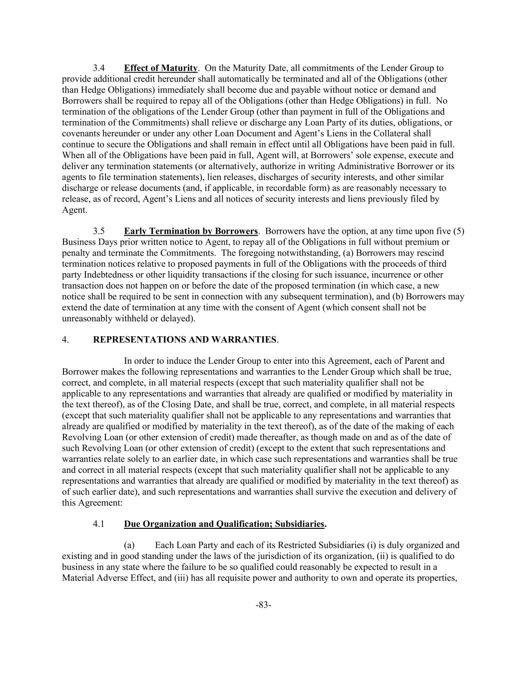 -83- 3.4 Effect of Maturity. On the Maturity Date, all commitments of the Lender Group to provide additional credit hereunder shall automatically be terminated and all of the Obligations (other than Hedge Obligations) immediately shall become due and payable without notice or demand and Borrowers shall be required to repay all of the Obligations (other than Hedge Obligations) in full. No termination of the obligations of the Lender Group (other than payment in full of the Obligations and termination of the Commitments) shall relieve or discharge any Loan Party of its duties, obligations, or covenants hereunder or under any other Loan Document and Agent’s Liens in the Collateral shall continue to secure the Obligations and shall remain in effect until all Obligations have been paid in full. When all of the Obligations have been paid in full, Agent will, at Borrowers’ sole expense, execute and deliver any termination statements (or alternatively, authorize in writing Administrative Borrower or its agents to file termination statements), lien releases, discharges of security interests, and other similar discharge or release documents (and, if applicable, in recordable form) as are reasonably necessary to release, as of record, Agent’s Liens and all notices of security interests and liens previously filed by Agent. 3.5 Early Termination by Borrowers. Borrowers have the option, at any time upon five (5) Business Days prior written notice to Agent, to repay all of the Obligations in full without premium or penalty and terminate the Commitments. The foregoing notwithstanding, (a) Borrowers may rescind termination notices relative to proposed payments in full of the Obligations with the proceeds of third party Indebtedness or other liquidity transactions if the closing for such issuance, incurrence or other transaction does not happen on or before the date of the proposed termination (in which case, a new notice shall be required to be sent in connection with any subsequent termination), and (b) Borrowers may extend the date of termination at any time with the consent of Agent (which consent shall not be unreasonably withheld or delayed). 4. REPRESENTATIONS AND WARRANTIES. In order to induce the Lender Group to enter into this Agreement, each of Parent and Borrower makes the following representations and warranties to the Lender Group which shall be true, correct, and complete, in all material respects (except that such materiality qualifier shall not be applicable to any representations and warranties that already are qualified or modified by materiality in the text thereof), as of the Closing Date, and shall be true, correct, and complete, in all material respects (except that such materiality qualifier shall not be applicable to any representations and warranties that already are qualified or modified by materiality in the text thereof), as of the date of the making of each Revolving Loan (or other extension of credit) made thereafter, as though made on and as of the date of such Revolving Loan (or other extension of credit) (except to the extent that such representations and warranties relate solely to an earlier date, in which case such representations and warranties shall be true and correct in all material respects (except that such materiality qualifier shall not be applicable to any representations and warranties that already are qualified or modified by materiality in the text thereof) as of such earlier date), and such representations and warranties shall survive the execution and delivery of this Agreement: 4.1 Due Organization and Qualification; Subsidiaries. (a) Each Loan Party and each of its Restricted Subsidiaries (i) is duly organized and existing and in good standing under the laws of the jurisdiction of its organization, (ii) is qualified to do business in any state where the failure to be so qualified could reasonably be expected to result in a Material Adverse Effect, and (iii) has all requisite power and authority to own and operate its properties,