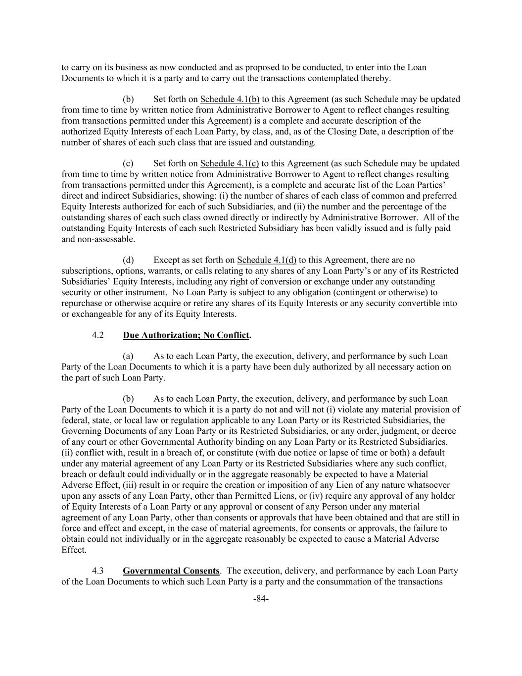 -84- to carry on its business as now conducted and as proposed to be conducted, to enter into the Loan Documents to which it is a party and to carry out the transactions contemplated thereby. (b) Set forth on Schedule 4.1(b) to this Agreement (as such Schedule may be updated from time to time by written notice from Administrative Borrower to Agent to reflect changes resulting from transactions permitted under this Agreement) is a complete and accurate description of the authorized Equity Interests of each Loan Party, by class, and, as of the Closing Date, a description of the number of shares of each such class that are issued and outstanding. (c) Set forth on Schedule 4.1(c) to this Agreement (as such Schedule may be updated from time to time by written notice from Administrative Borrower to Agent to reflect changes resulting from transactions permitted under this Agreement), is a complete and accurate list of the Loan Parties’ direct and indirect Subsidiaries, showing: (i) the number of shares of each class of common and preferred Equity Interests authorized for each of such Subsidiaries, and (ii) the number and the percentage of the outstanding shares of each such class owned directly or indirectly by Administrative Borrower. All of the outstanding Equity Interests of each such Restricted Subsidiary has been validly issued and is fully paid and non-assessable. (d) Except as set forth on Schedule 4.1(d) to this Agreement, there are no subscriptions, options, warrants, or calls relating to any shares of any Loan Party’s or any of its Restricted Subsidiaries’ Equity Interests, including any right of conversion or exchange under any outstanding security or other instrument. No Loan Party is subject to any obligation (contingent or otherwise) to repurchase or otherwise acquire or retire any shares of its Equity Interests or any security convertible into or exchangeable for any of its Equity Interests. 4.2 Due Authorization; No Conflict. (a) As to each Loan Party, the execution, delivery, and performance by such Loan Party of the Loan Documents to which it is a party have been duly authorized by all necessary action on the part of such Loan Party. (b) As to each Loan Party, the execution, delivery, and performance by such Loan Party of the Loan Documents to which it is a party do not and will not (i) violate any material provision of federal, state, or local law or regulation applicable to any Loan Party or its Restricted Subsidiaries, the Governing Documents of any Loan Party or its Restricted Subsidiaries, or any order, judgment, or decree of any court or other Governmental Authority binding on any Loan Party or its Restricted Subsidiaries, (ii) conflict with, result in a breach of, or constitute (with due notice or lapse of time or both) a default under any material agreement of any Loan Party or its Restricted Subsidiaries where any such conflict, breach or default could individually or in the aggregate reasonably be expected to have a Material Adverse Effect, (iii) result in or require the creation or imposition of any Lien of any nature whatsoever upon any assets of any Loan Party, other than Permitted Liens, or (iv) require any approval of any holder of Equity Interests of a Loan Party or any approval or consent of any Person under any material agreement of any Loan Party, other than consents or approvals that have been obtained and that are still in force and effect and except, in the case of material agreements, for consents or approvals, the failure to obtain could not individually or in the aggregate reasonably be expected to cause a Material Adverse Effect. 4.3 Governmental Consents. The execution, delivery, and performance by each Loan Party of the Loan Documents to which such Loan Party is a party and the consummation of the transactions